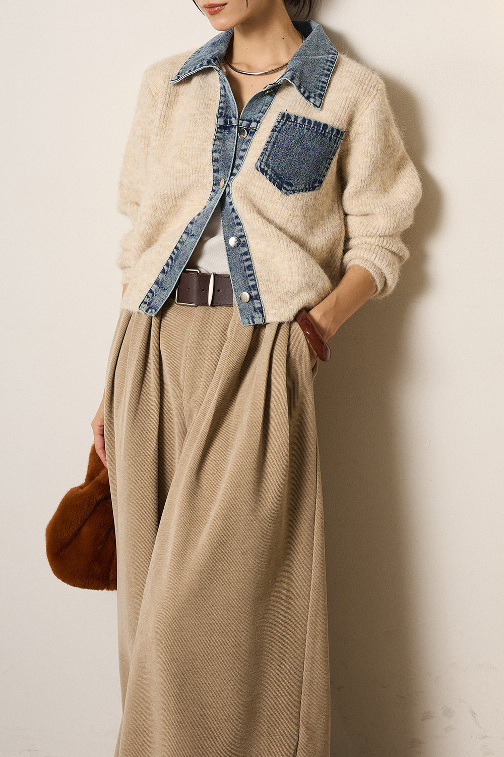 [SET]襟付きデニム切替ニットカーディガン+ベルトループコーデュロイワイドパンツ(2set)