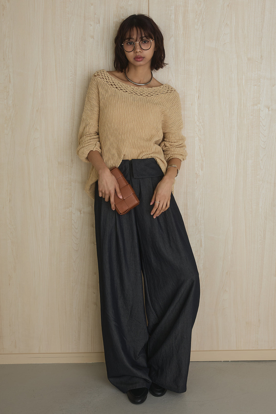 【着回しセット】[SET]ミックスメッシュキーネックプルオーバー+モチーフ付きシアーブルゾン+ベルト付きツータックワイドパンツ(3set)