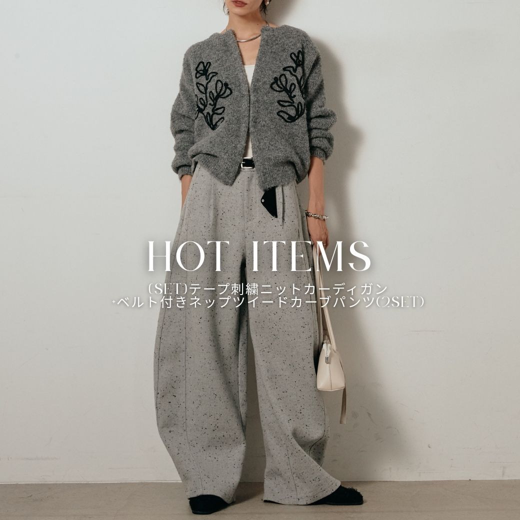 [SET]テープ刺繍ニットカーディガン+ベルト付きネップツイードカーブパンツ(2set)