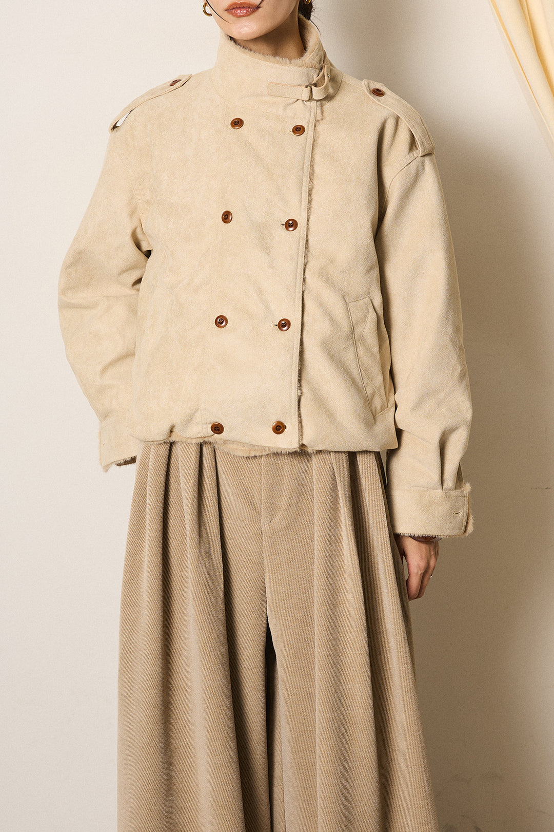 [SET]ノーカラーチェック柄ボアブルゾン+ベルトループコーデュロイワイドパンツ(2set)