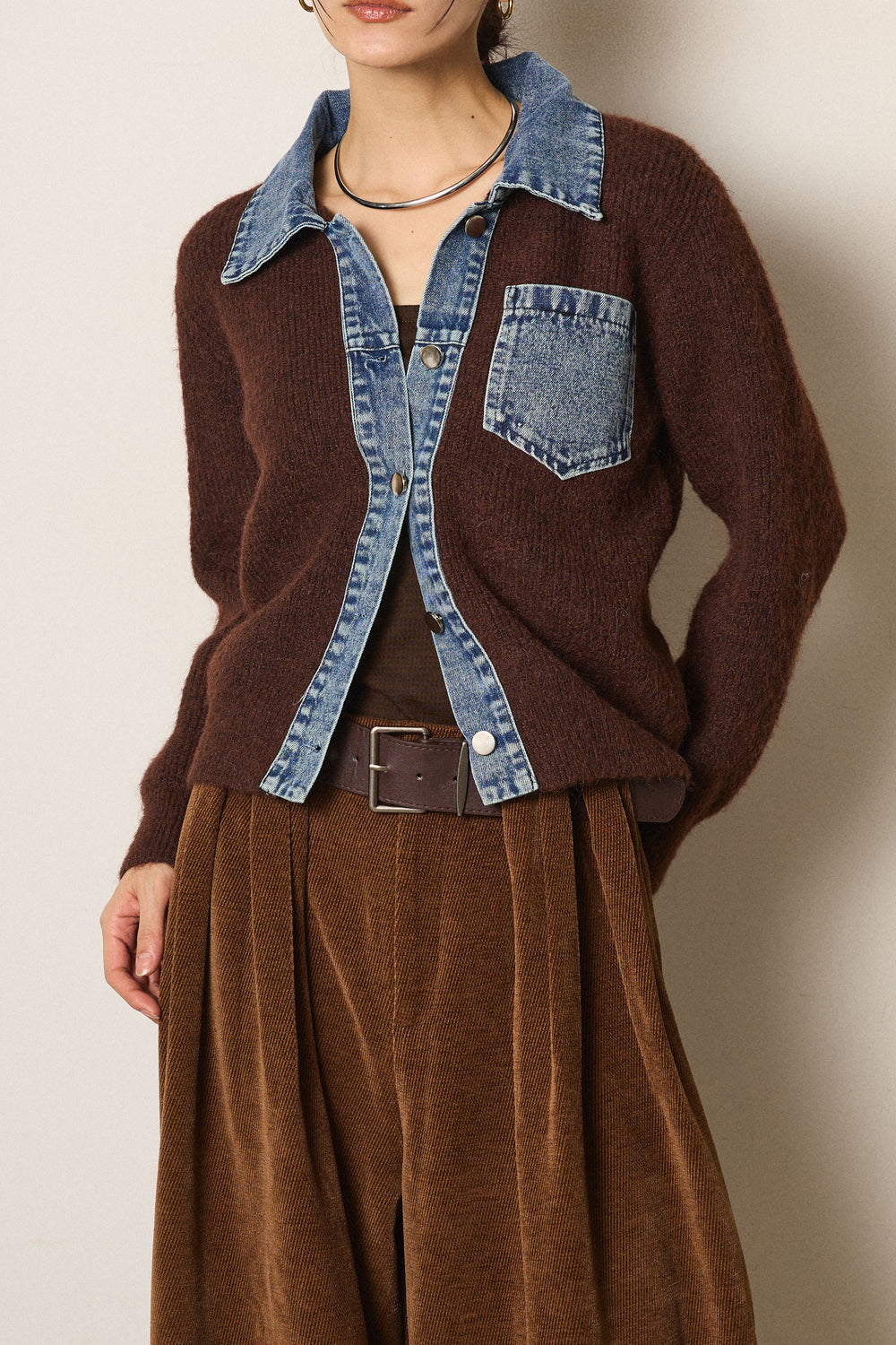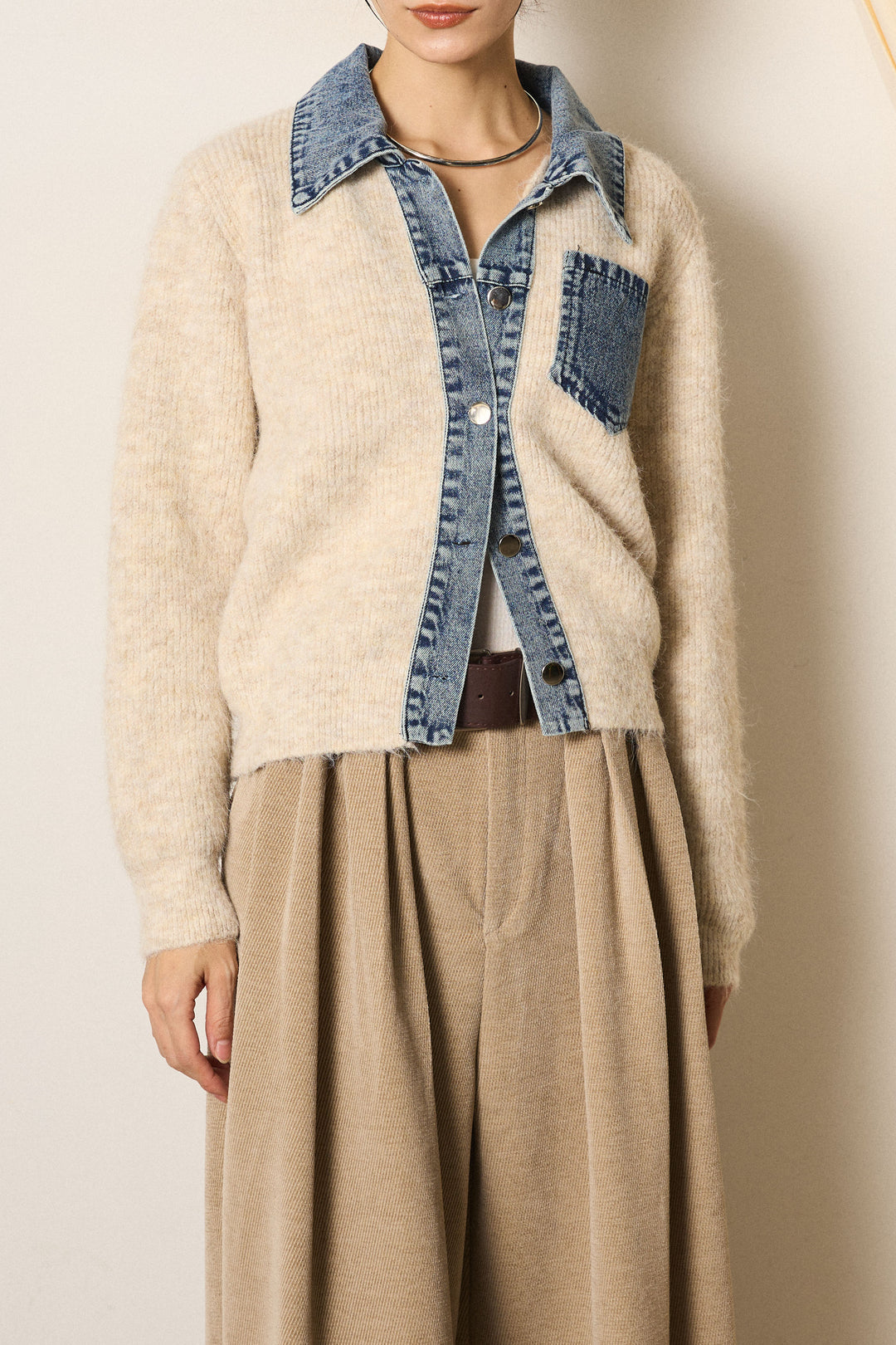 [SET]襟付きデニム切替ニットカーディガン+デニムロングフレアスカート(2set)
