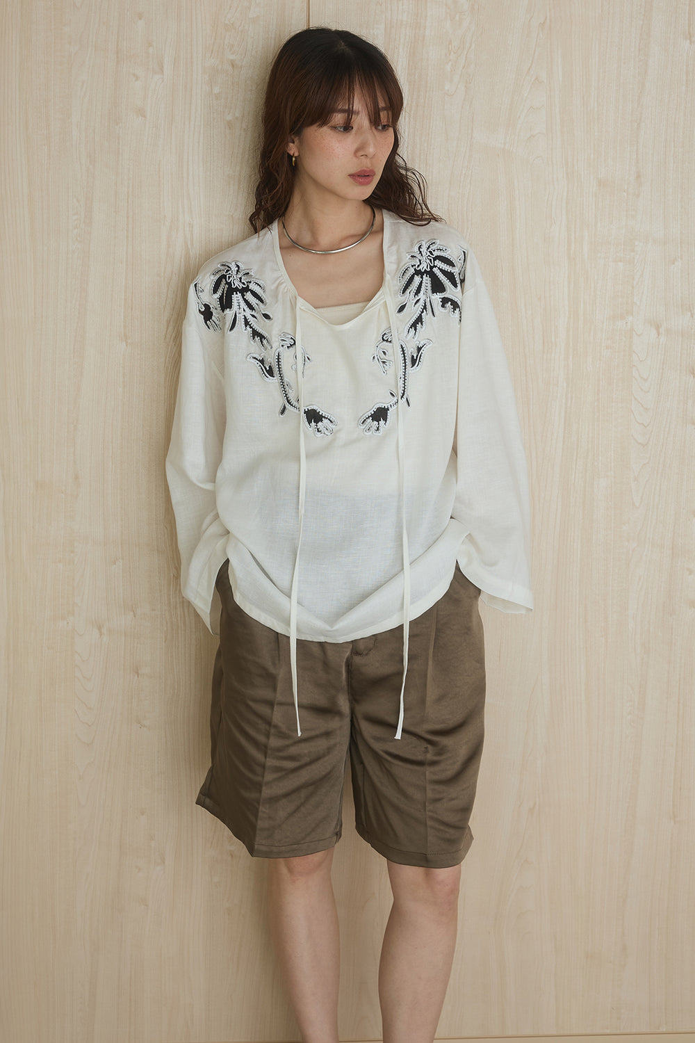 麻混フラワー刺繍柄ブラウス