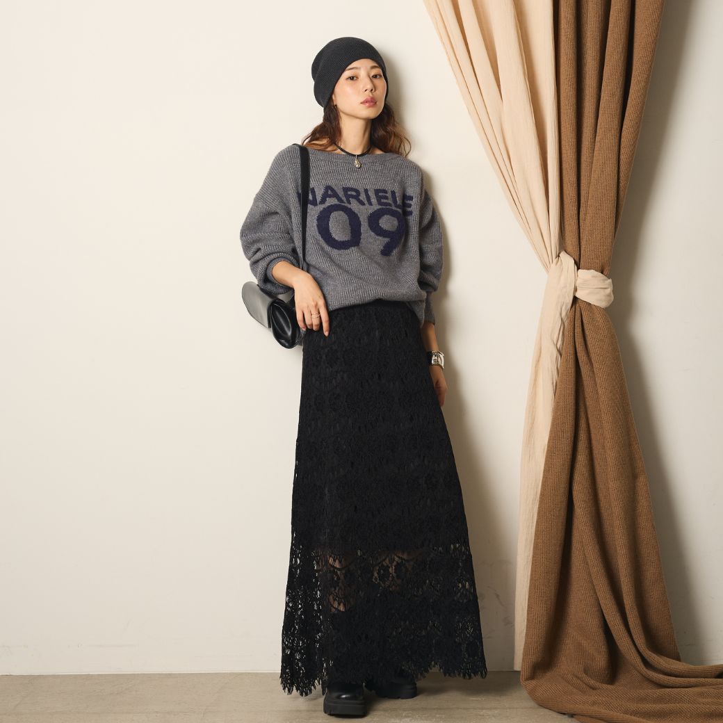 [SET]フロントロゴニットトップス+レース刺繍ロングスカート(2set)