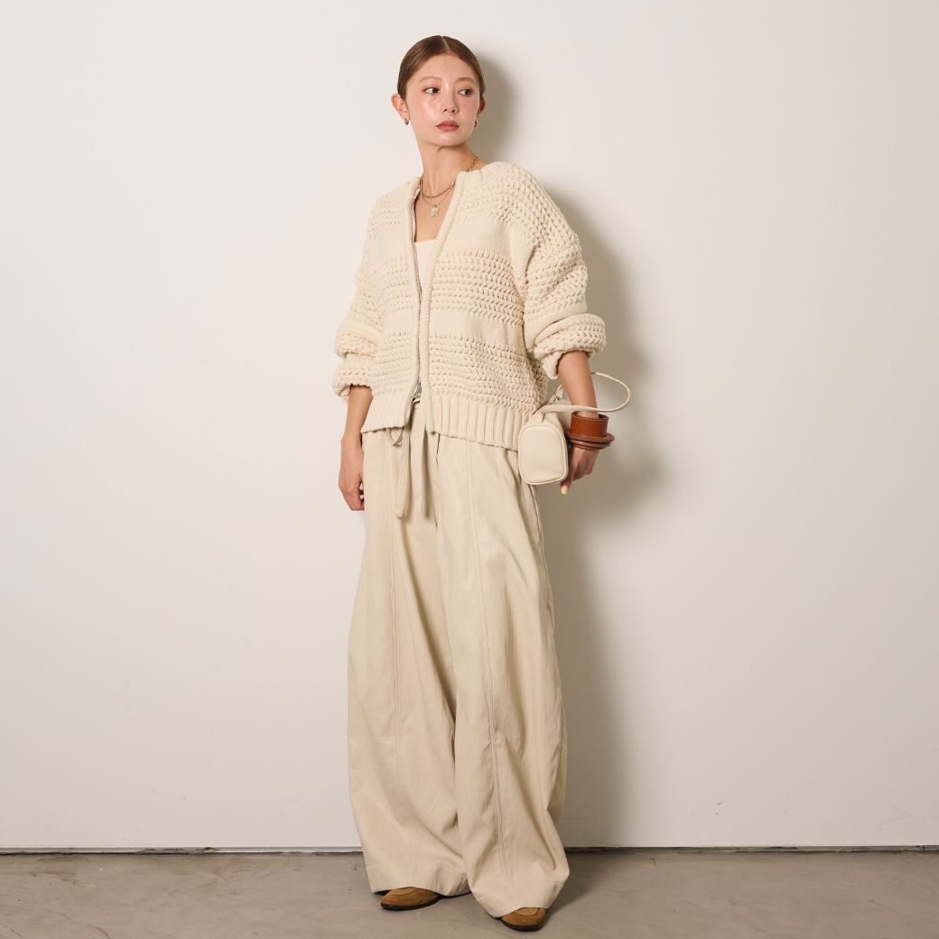 [SET]ライン編みダブルジップニットカーディガン+フェイクレザーカーブワイドパンツ(2set)