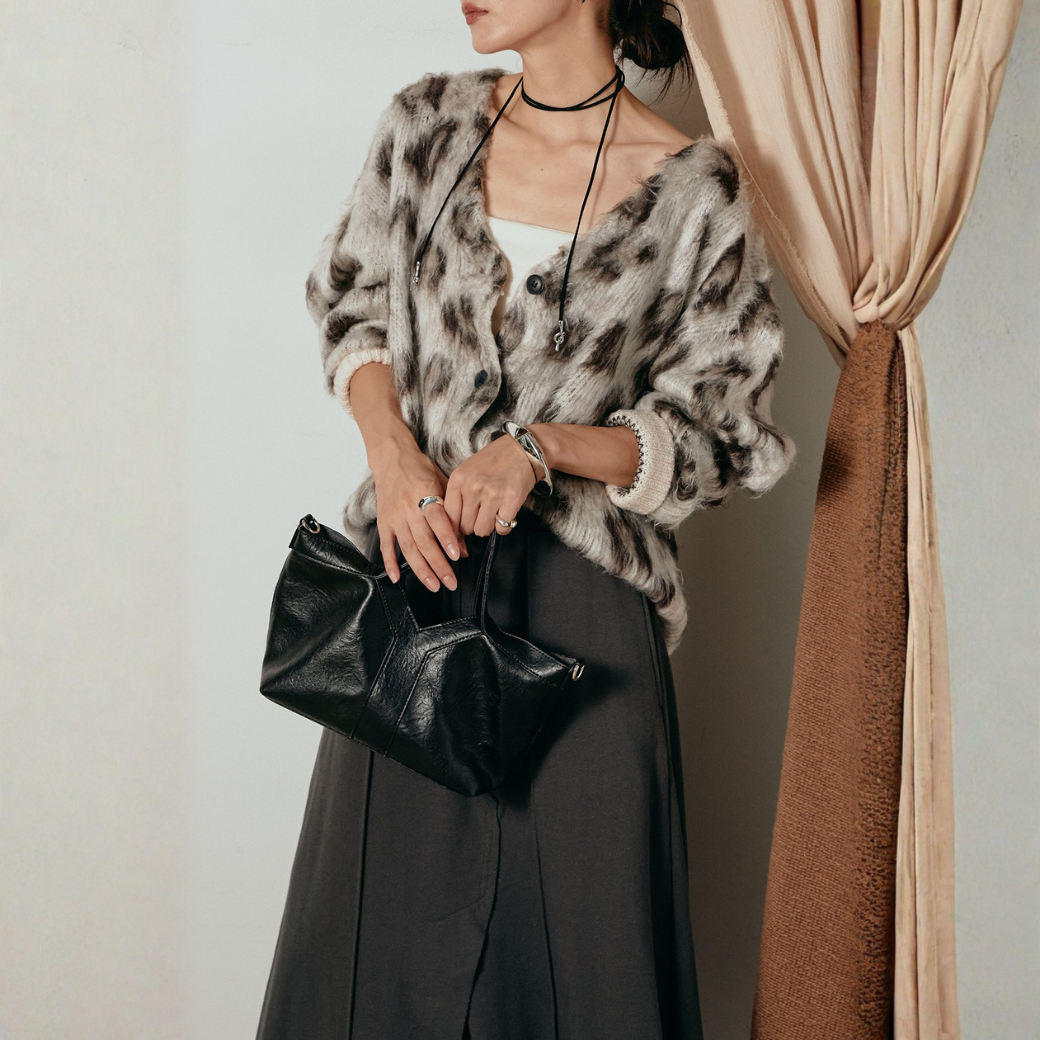【着回しセット】[SET]モヘアタッチレオパードVネックカーディガン+切り替えスウェットフレアスカート+フェイクレザー太ベルト付きデニムワイドスカート(3set)