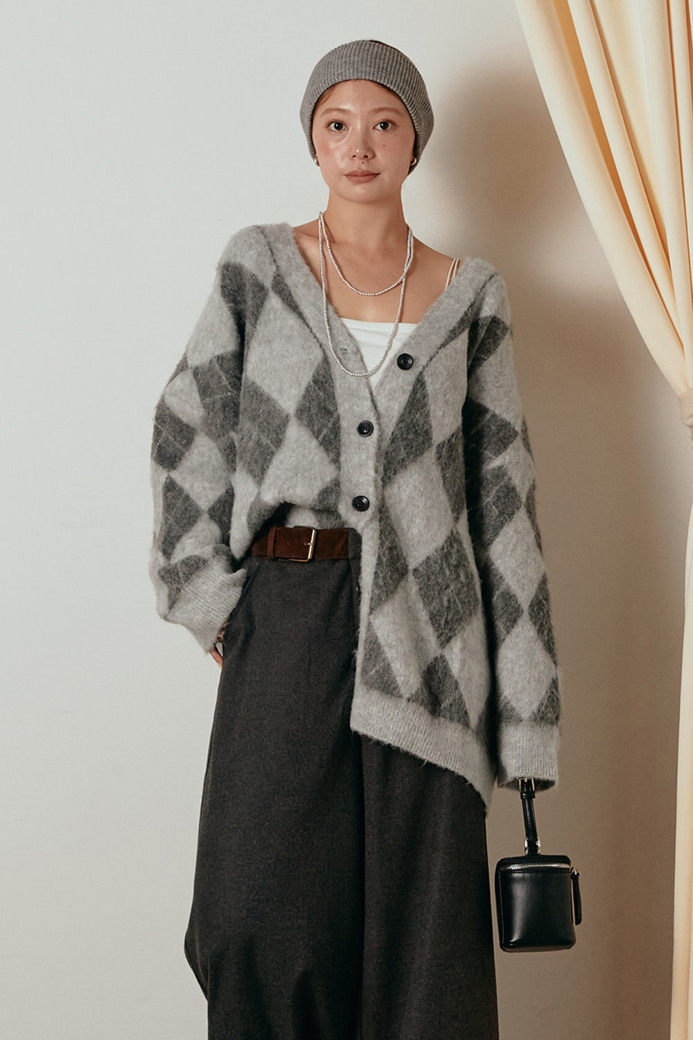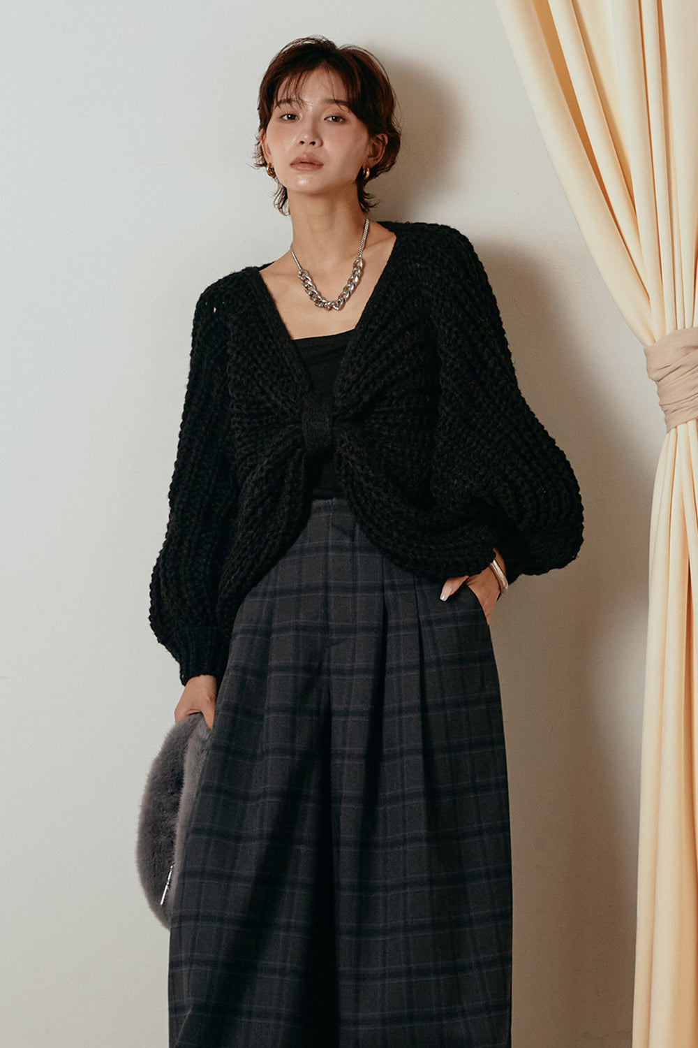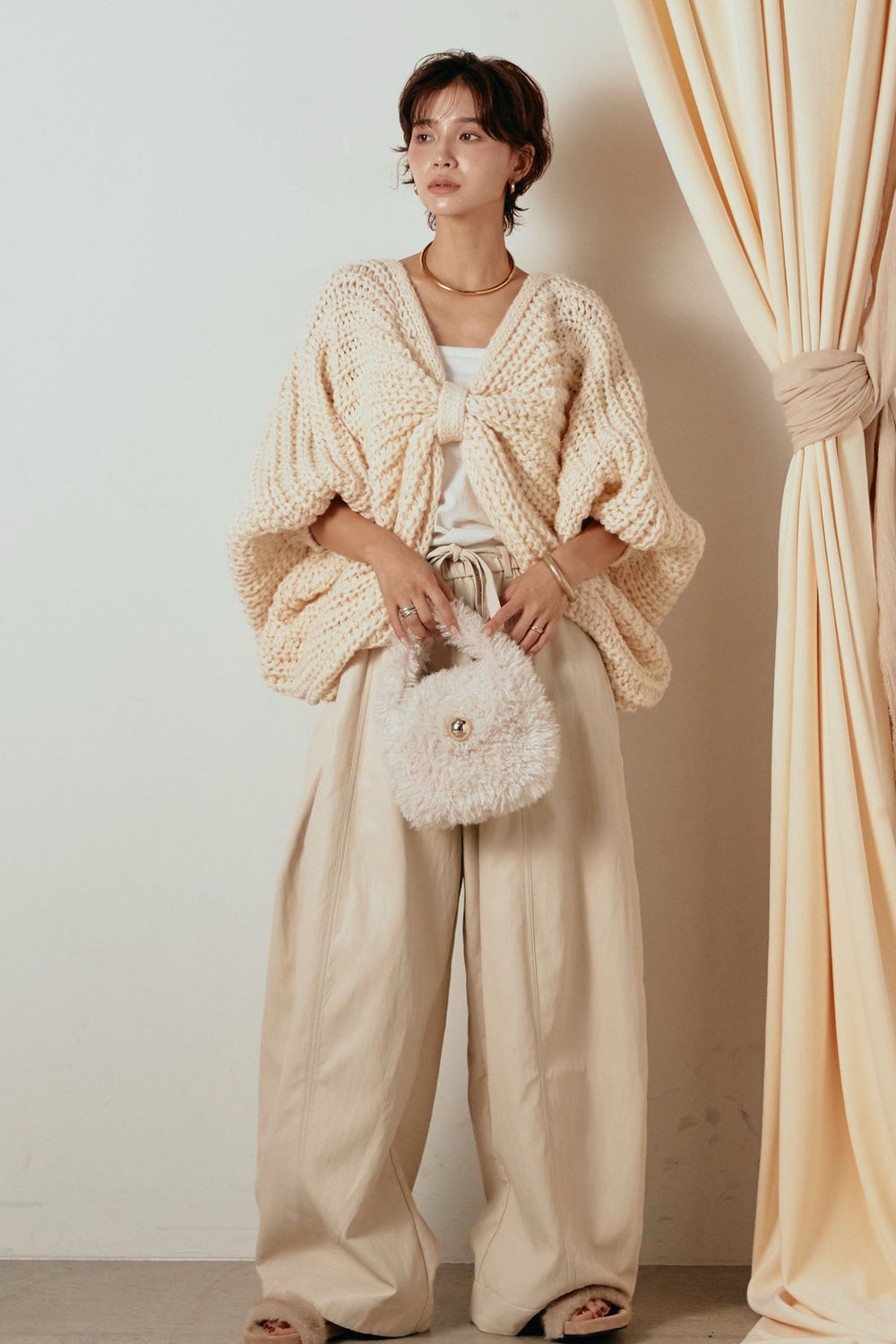 [SET]フェザーヤーン衿付きカーディガン+細ベルト付きワイドパンツ(2set)