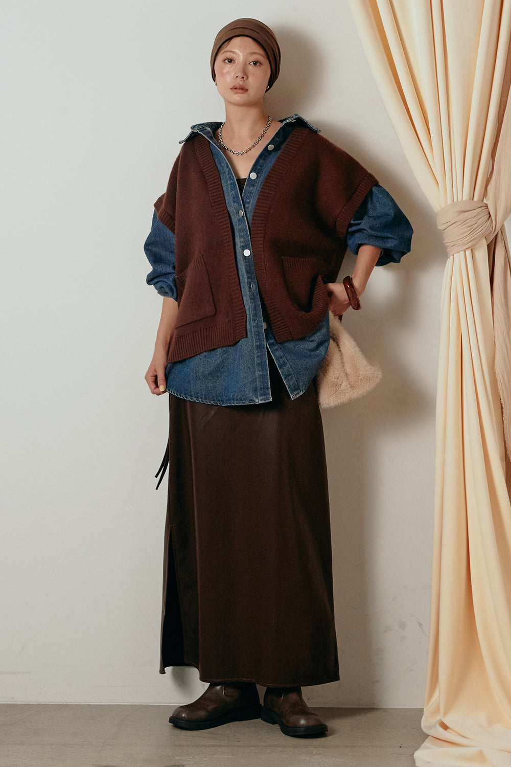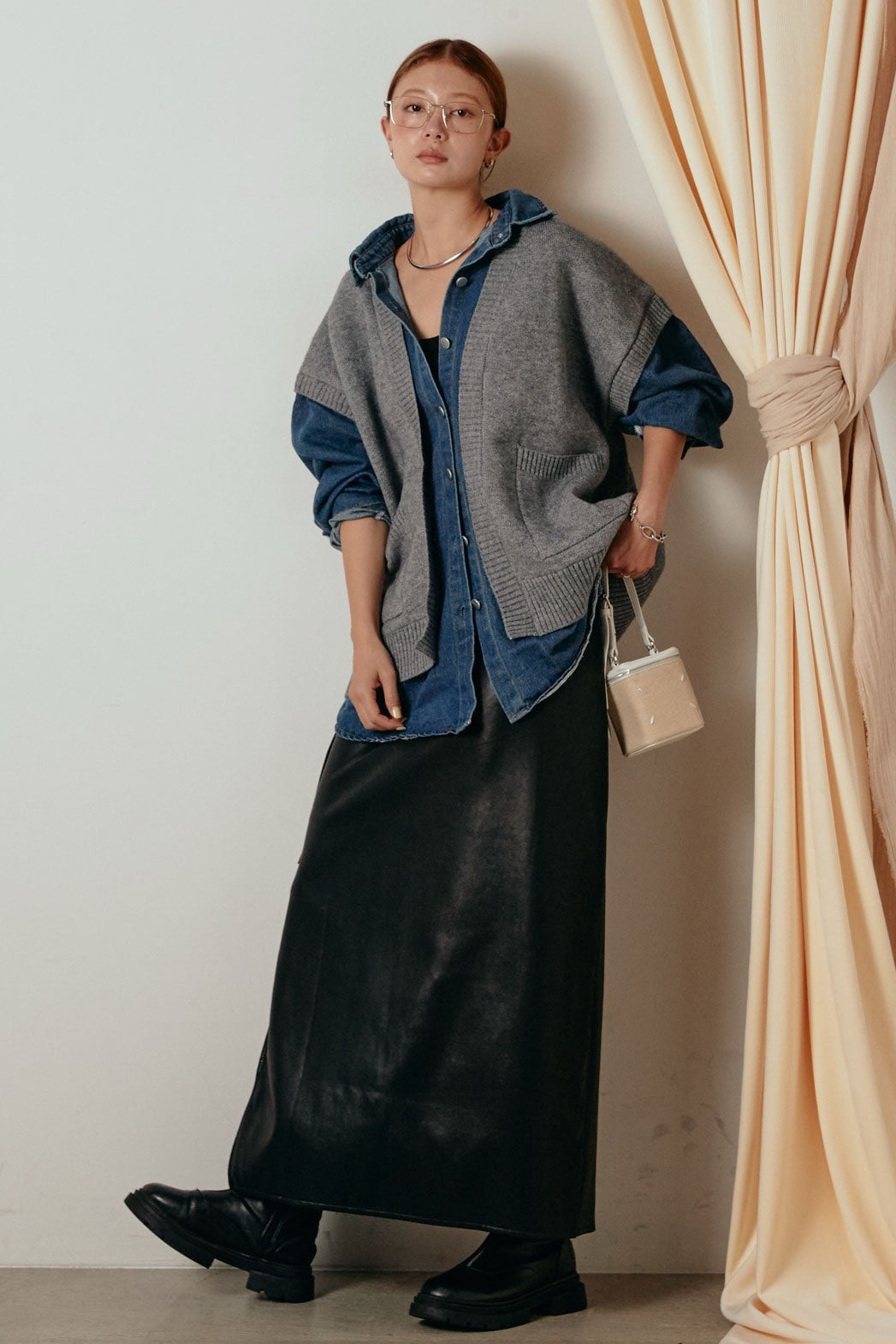 [SET]ニットドッキングデニムジャケット+紐付きフェイクレザーワイドスカート(2set)