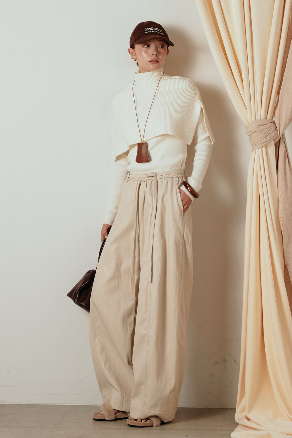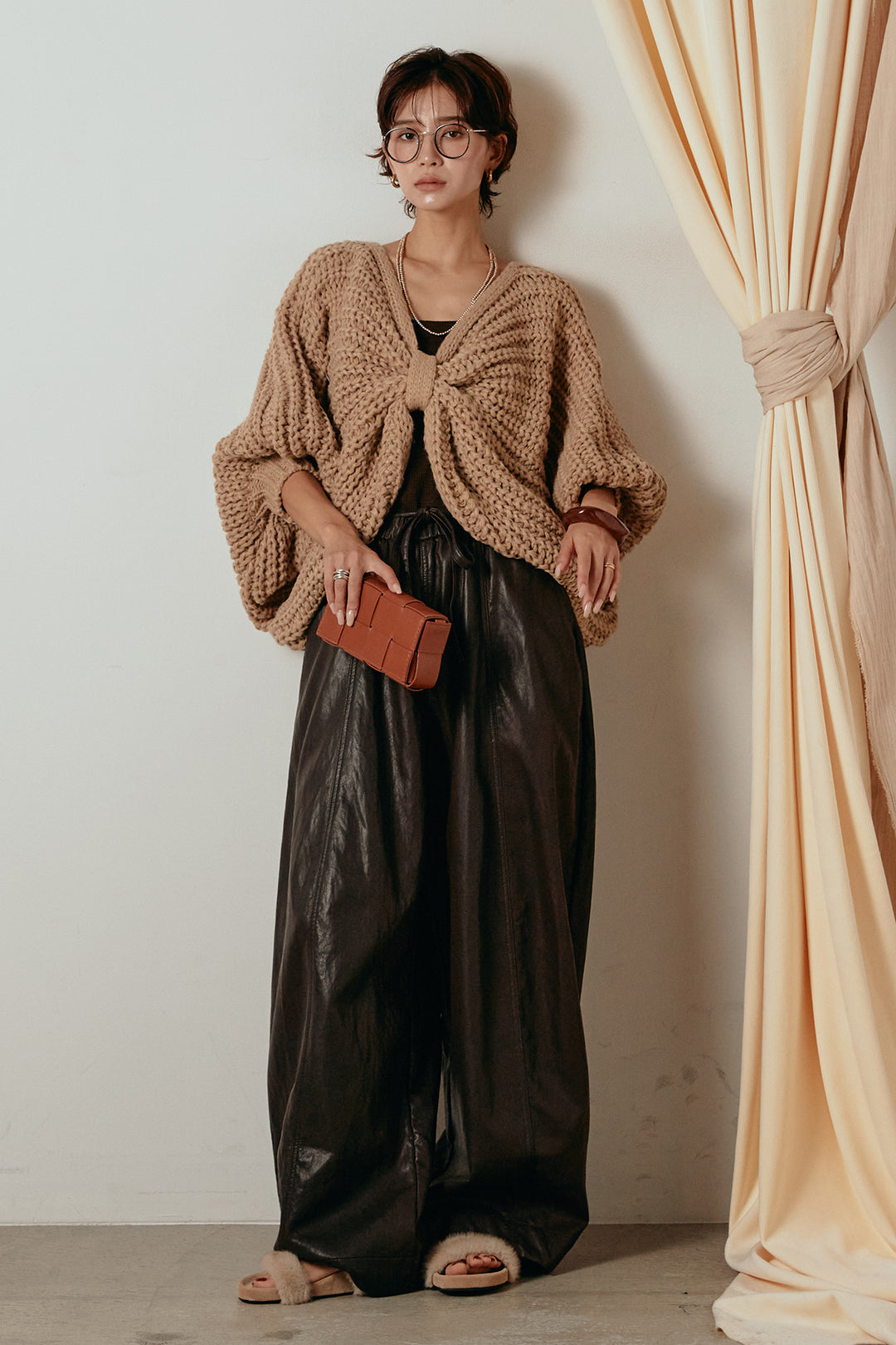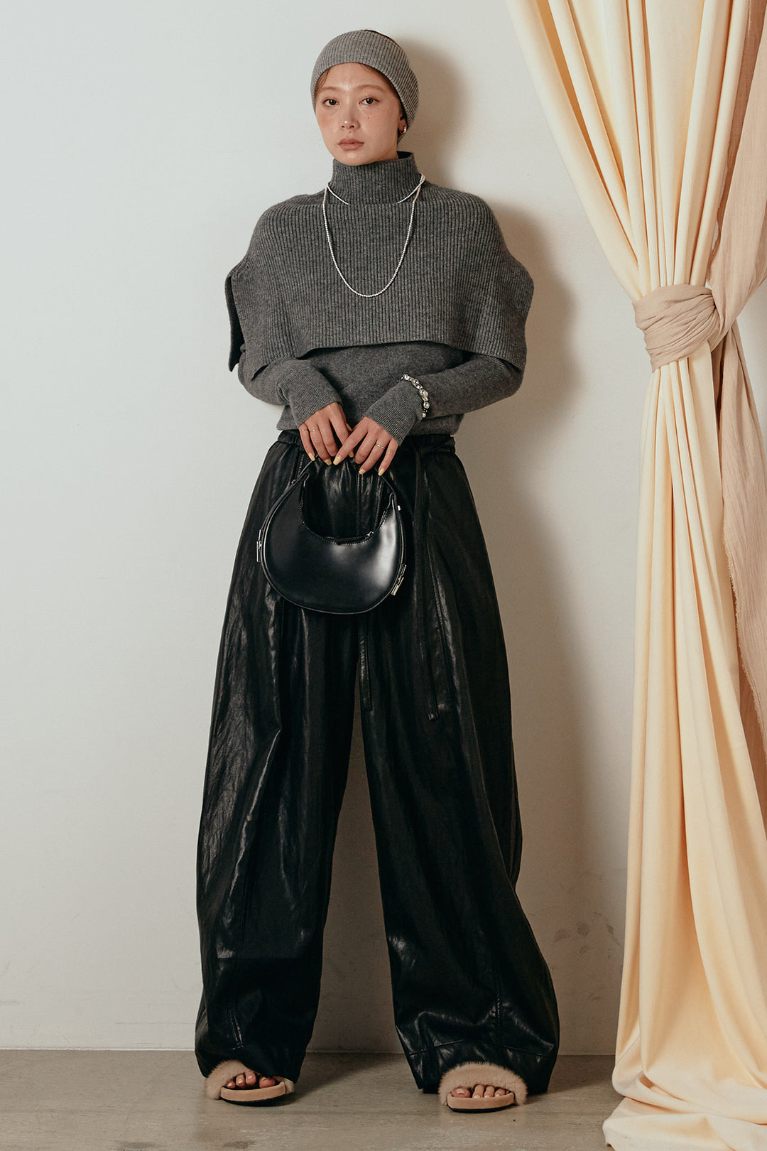 [SET]ケープデザインニットトップス+フェイクレザーカーブワイドパンツ(2set)