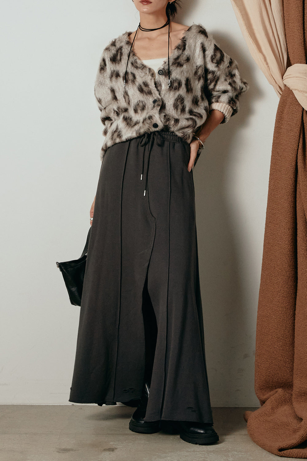 [SET]モヘアタッチレオパードVネックカーディガン+ウエストゴムワイドスウェットパンツ(2set)