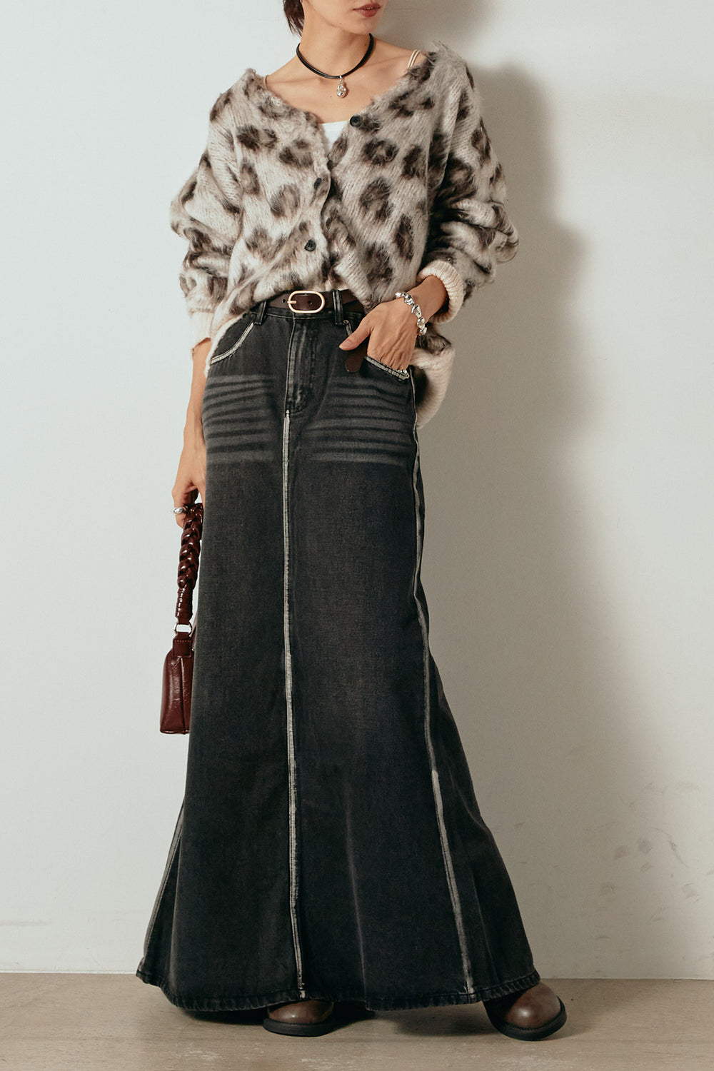 [SET]モヘアタッチレオパードVネックカーディガン+フェイクレザー太ベルト付きデニムワイドスカート(2set)
