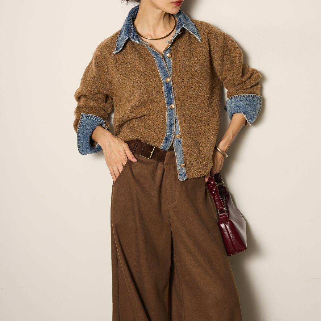 [SET]ニットドッキングデニムシャツ+フェイクレザーサイドベルトワイドパンツ(2set)