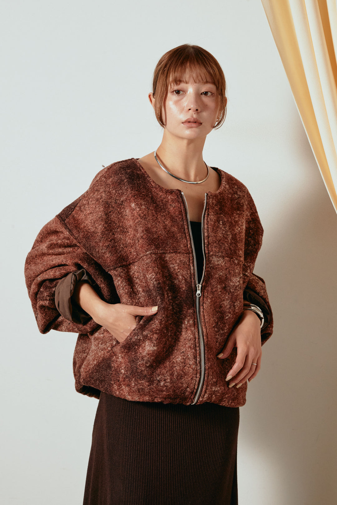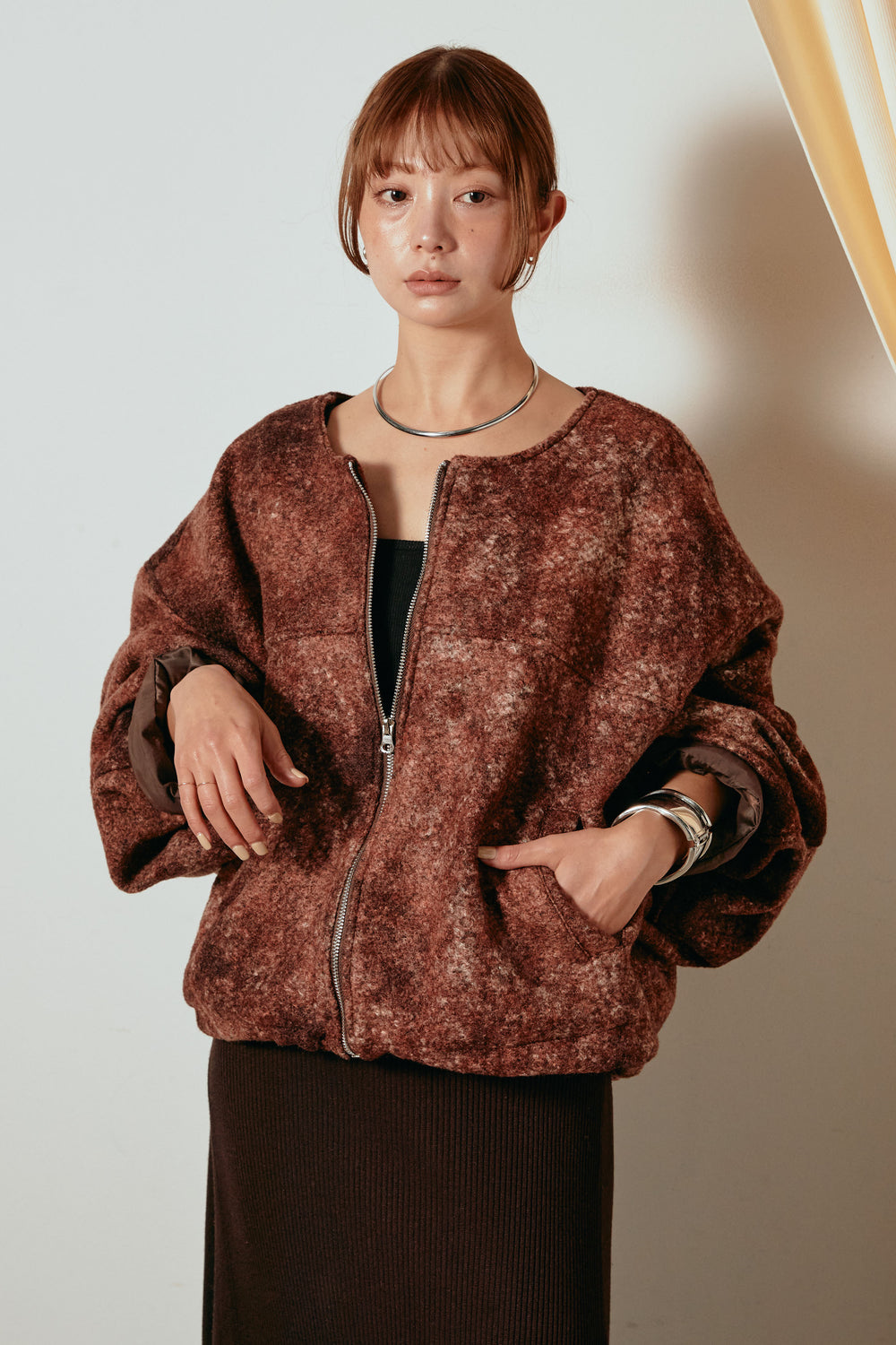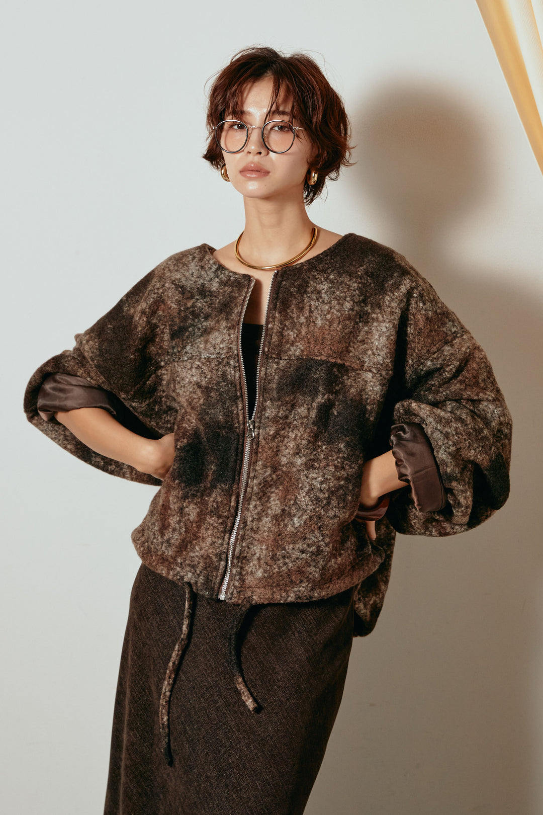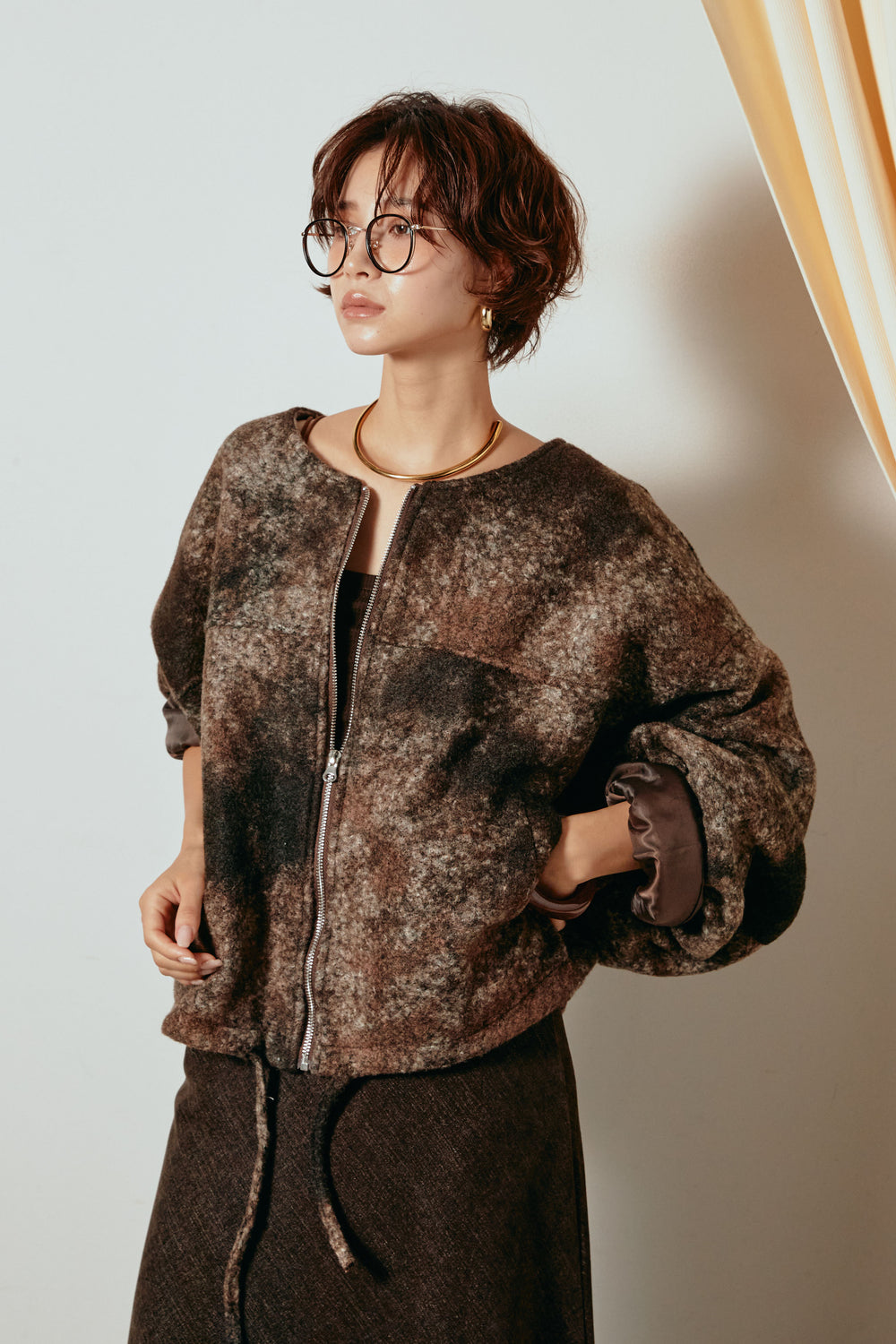 ノーカラーニュアンス柄ジップアウター/ブラウン