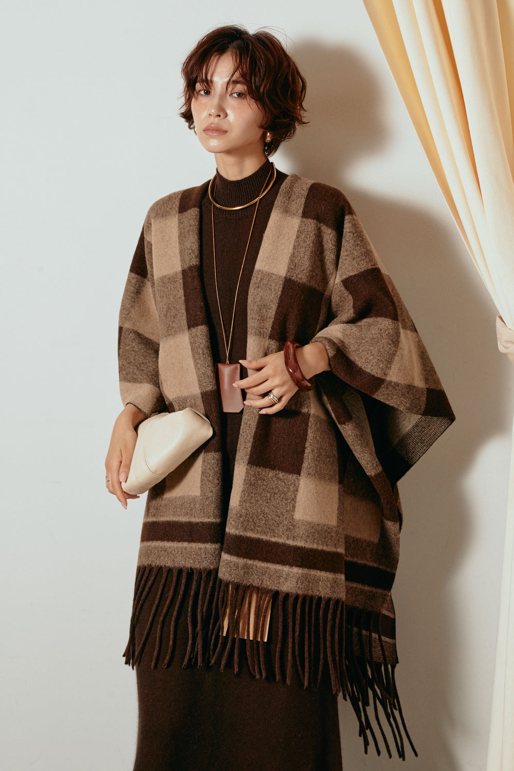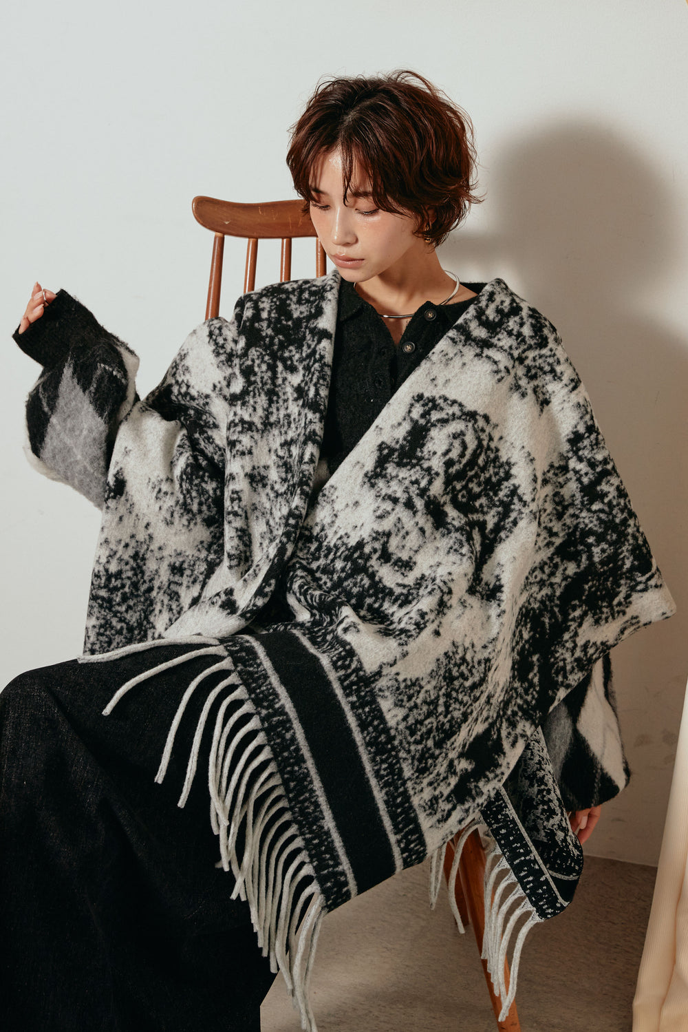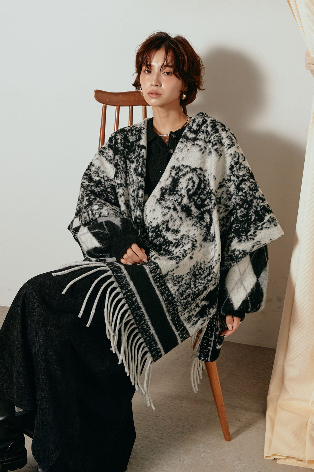 裾フリンジジャガード柄ポンチョアウター/ブラック