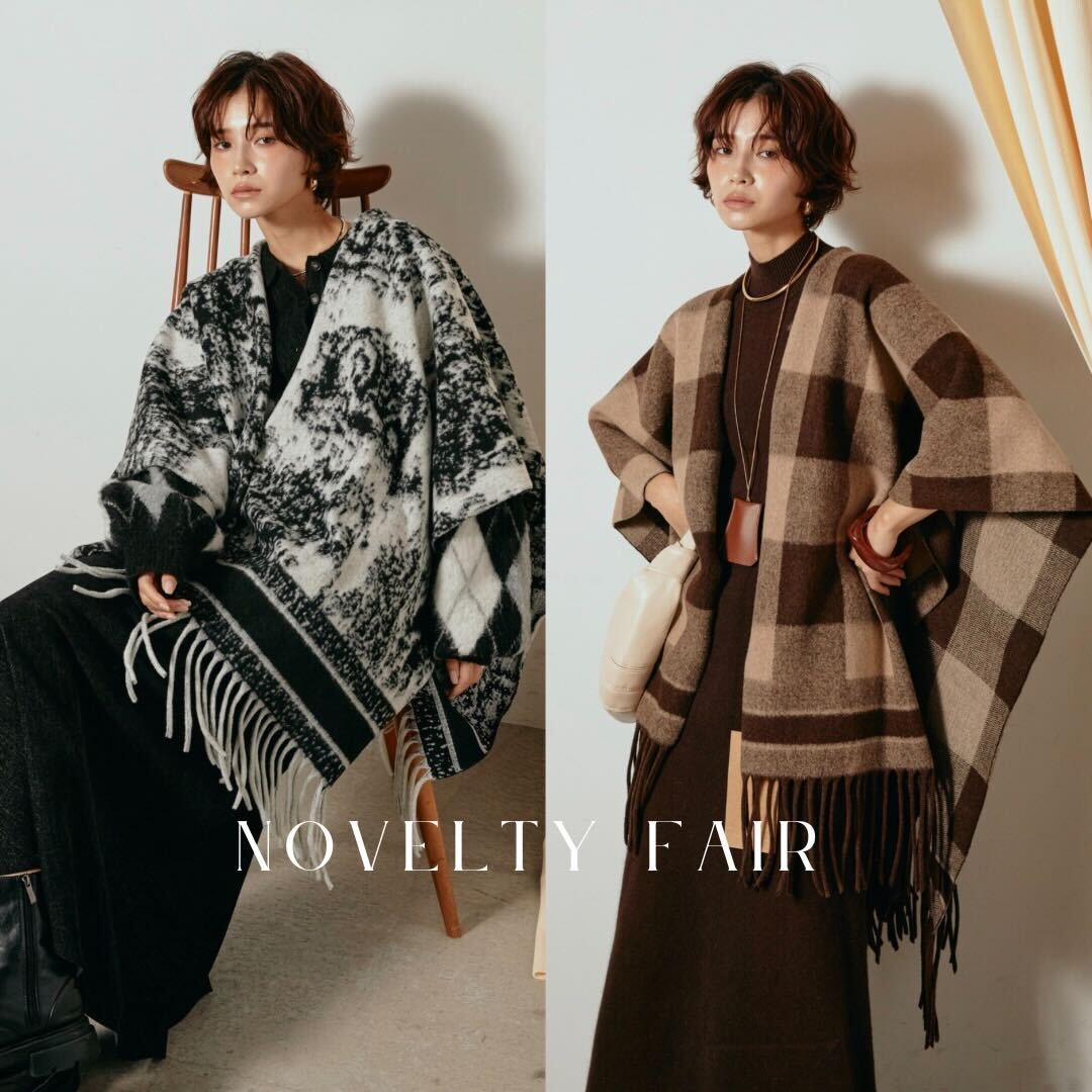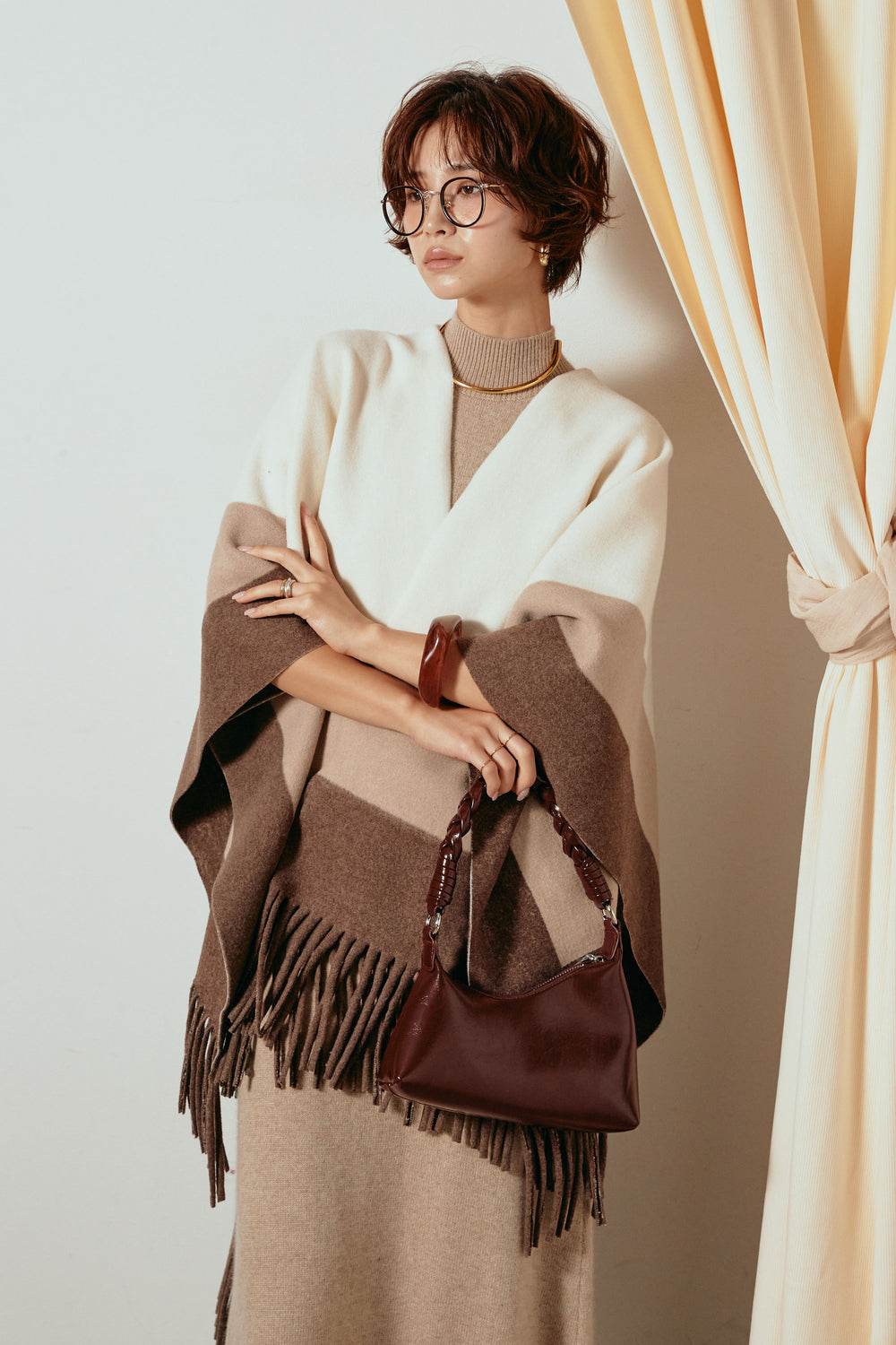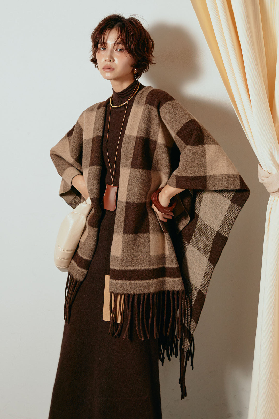 裾フリンジジャガード柄ポンチョアウター/ブラック