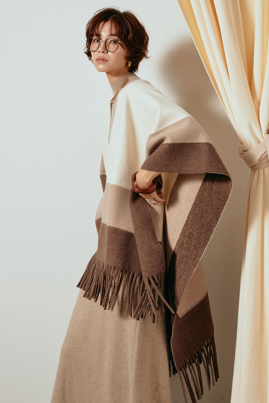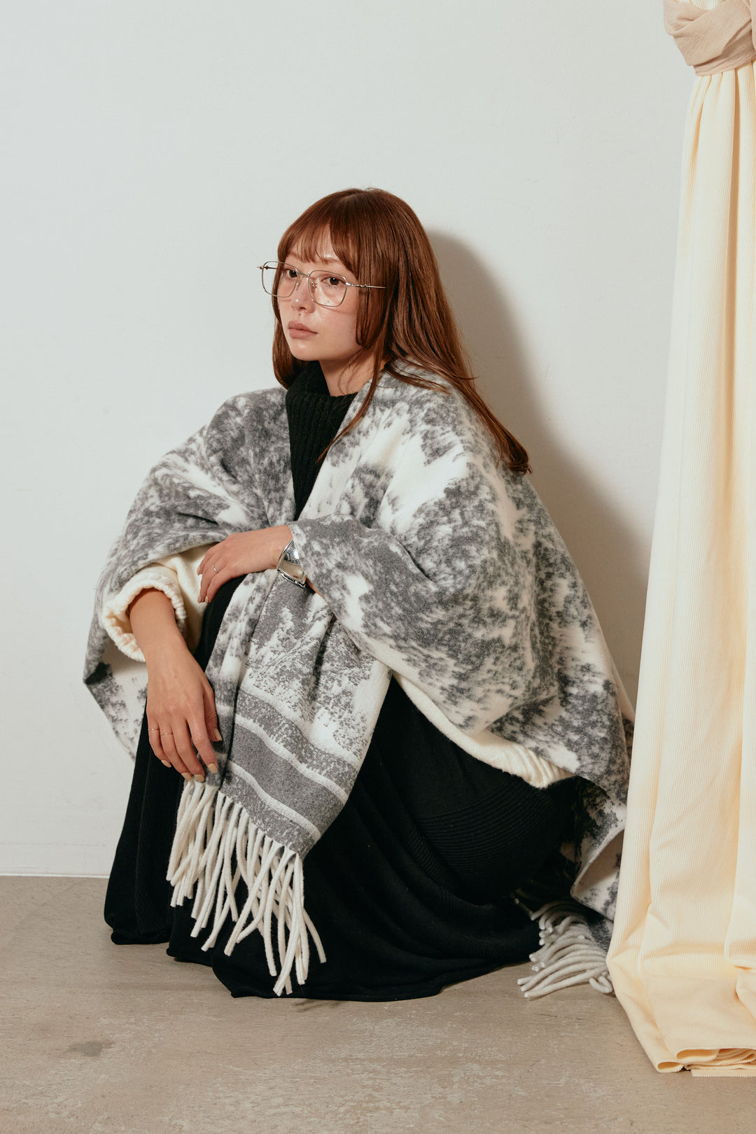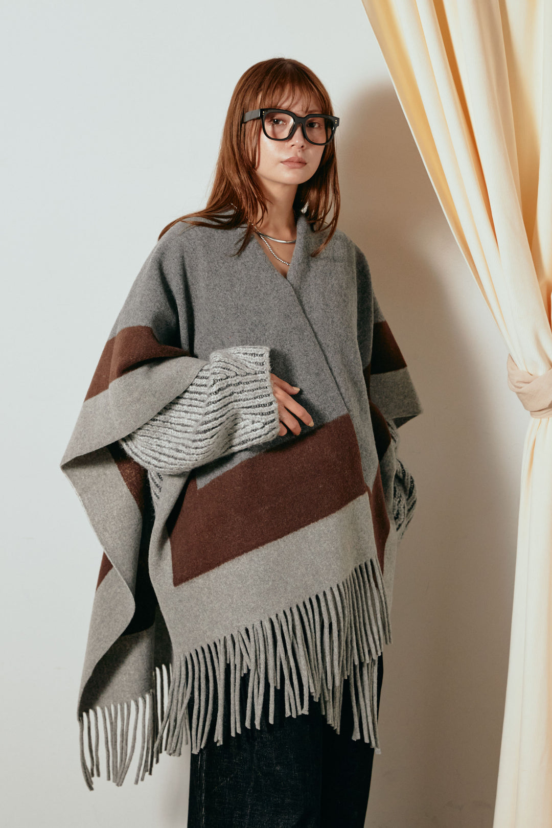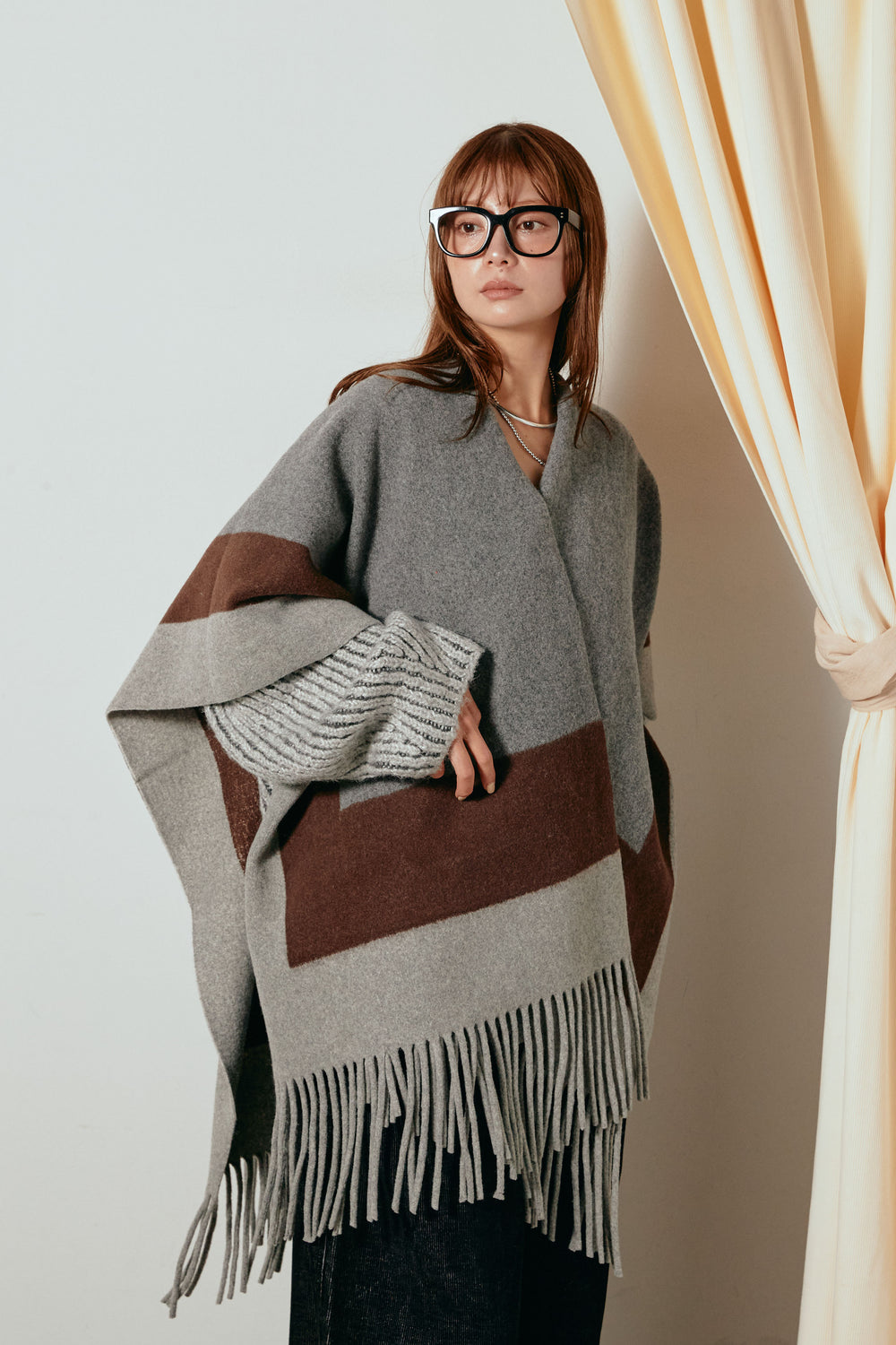 裾フリンジジャガード柄ポンチョアウター/グレー