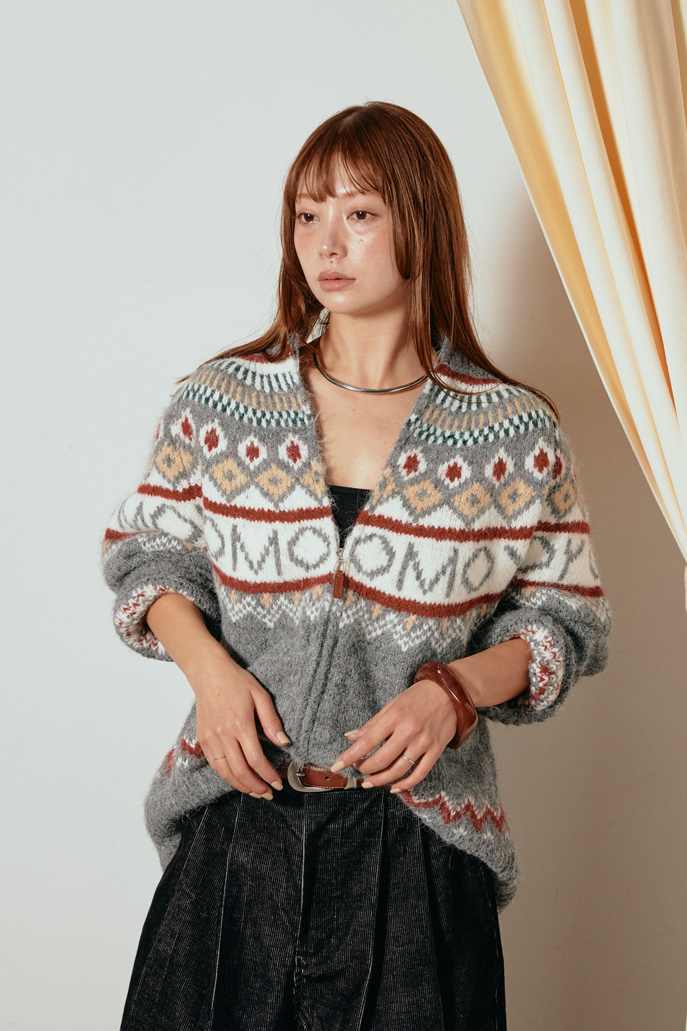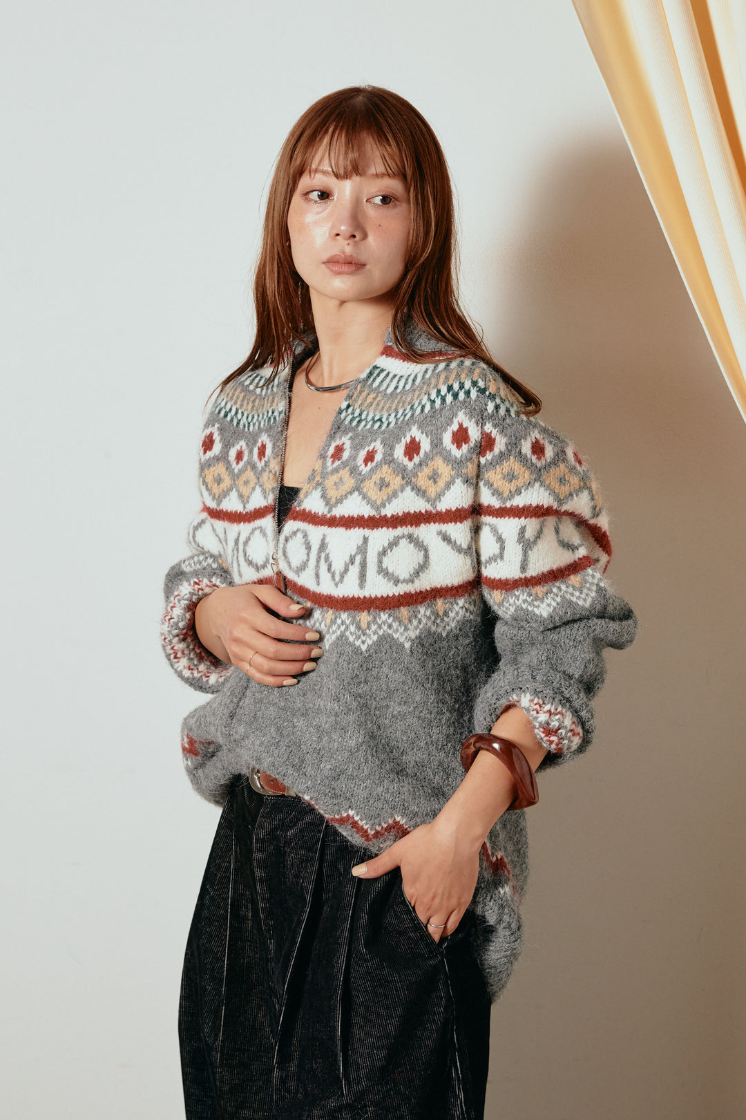 [SET]ノルディック柄ジップニットトップス+細フェイクレザーベルト付きワイドタックパンツ(2set)