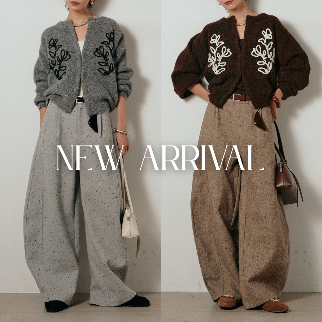 [SET]テープ刺繍ニットカーディガン+ベルト付きネップツイードカーブパンツ(2set)