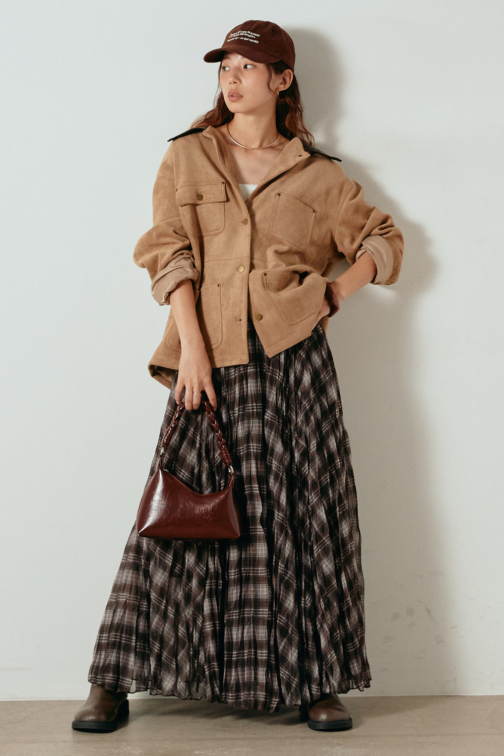[SET]襟フェイクレザーポケットカバーオール+ワッシャープリーツタータンチェックスカート(2set)