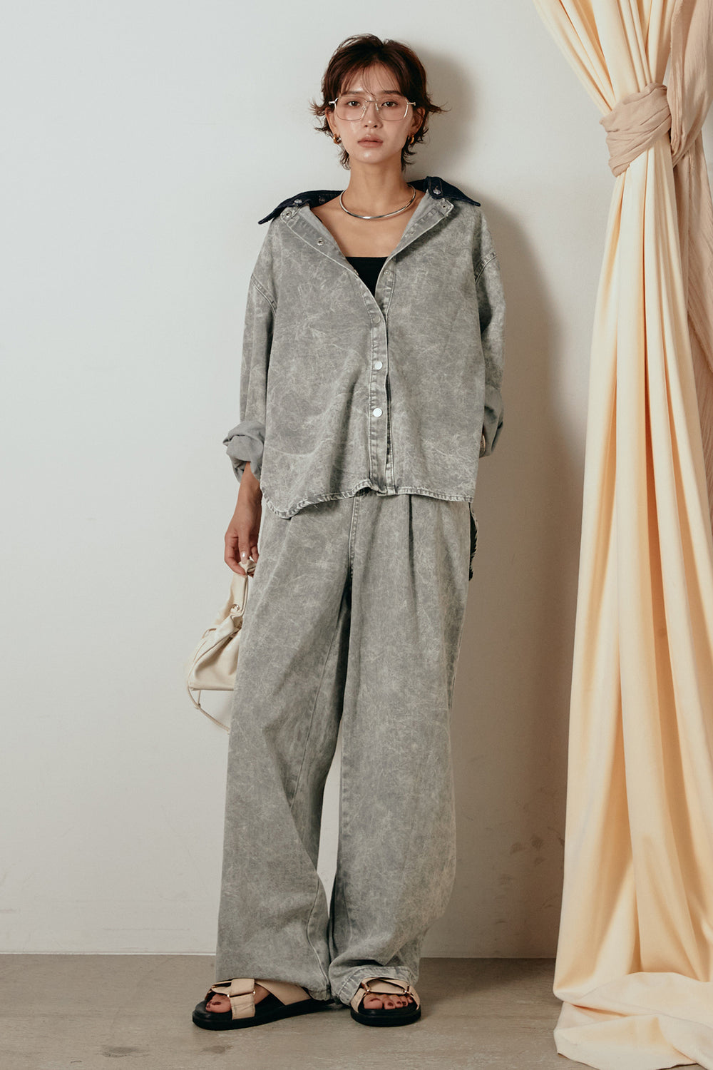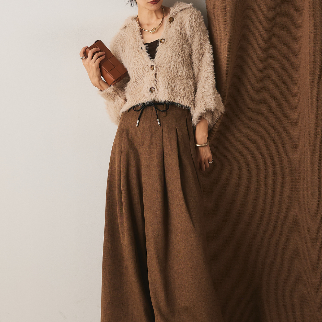 [SET]フェザーヤーン衿付きカーディガン+細ベルト付きワイドパンツ(2set)