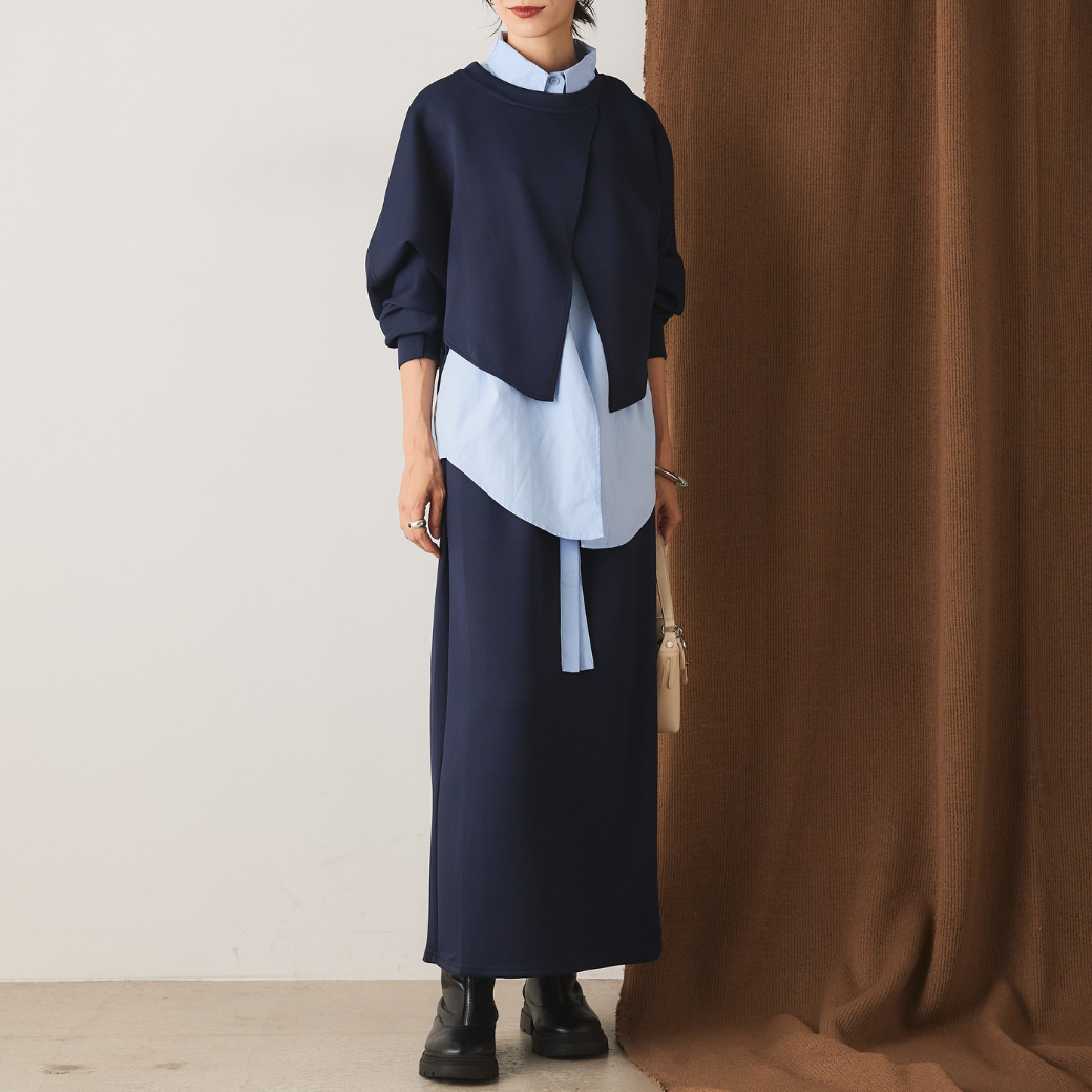 [SET]クロスデザインミックスニットワンピース+ミックスワイドニットスカート(2set)