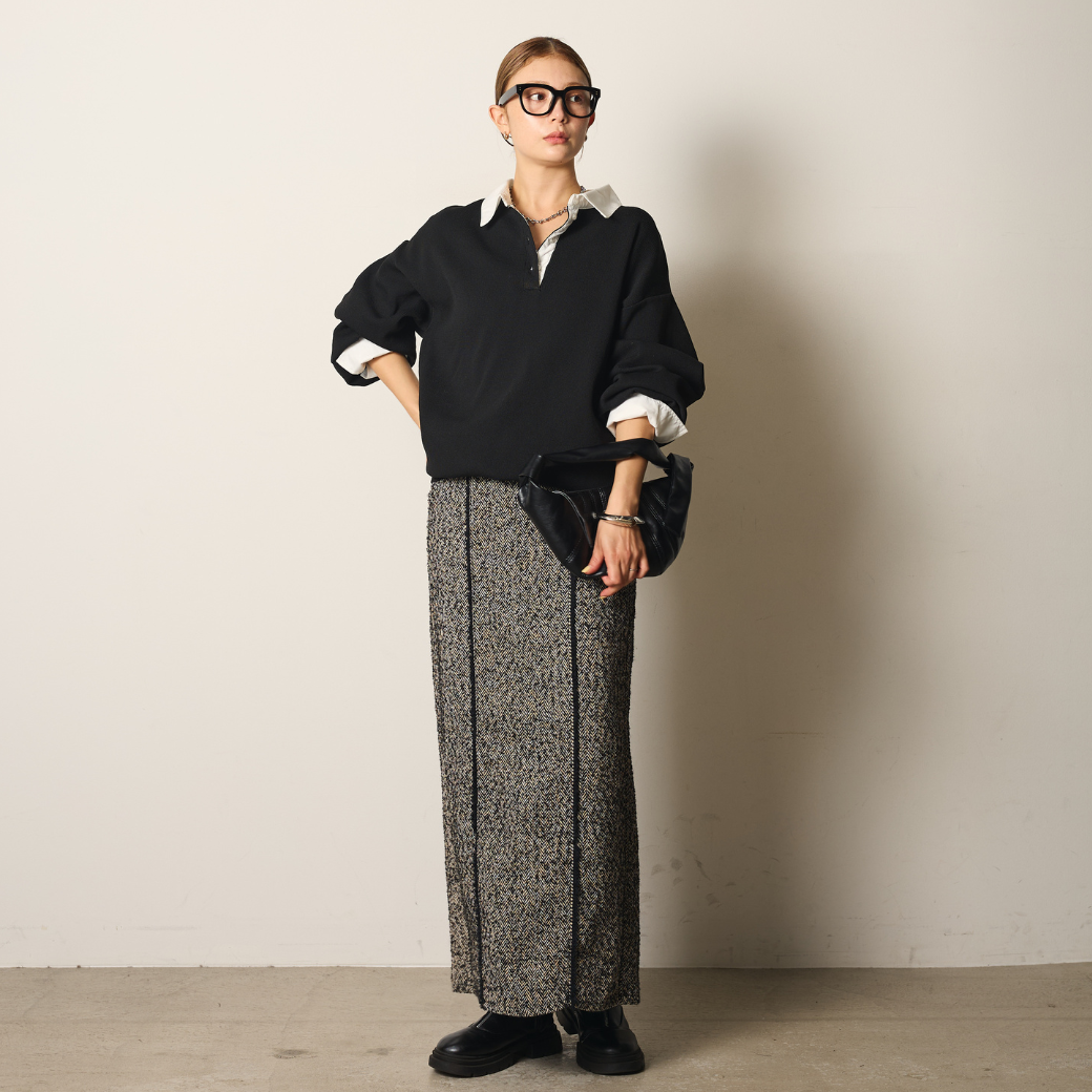 [SET]襟付きポロトップス+ラインツイードワイドスカート(2set)