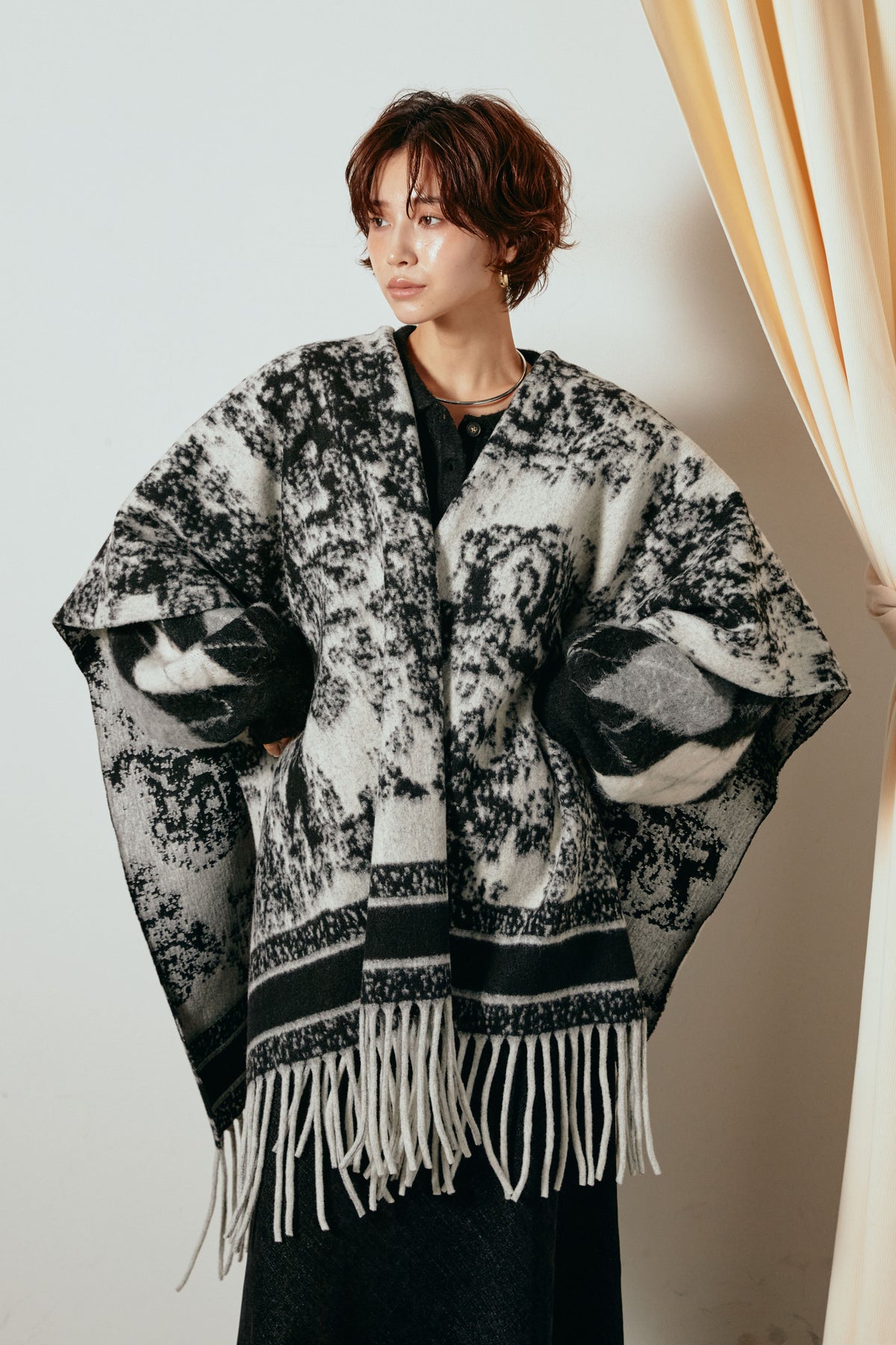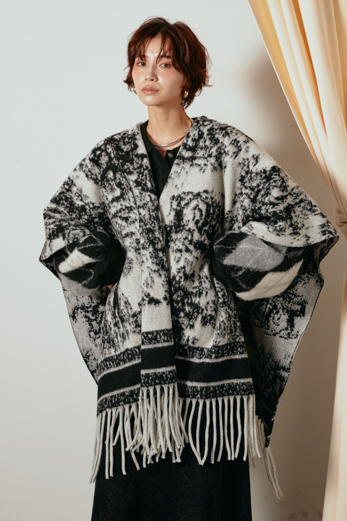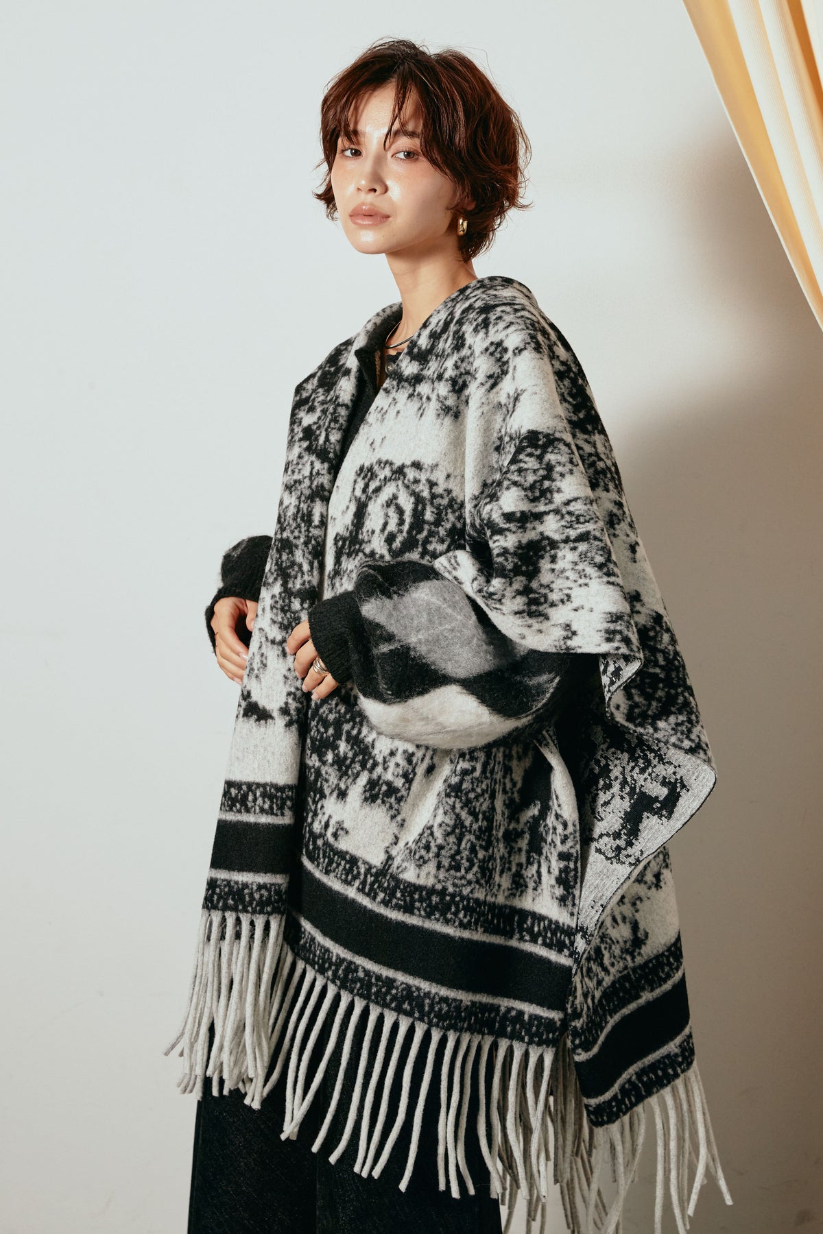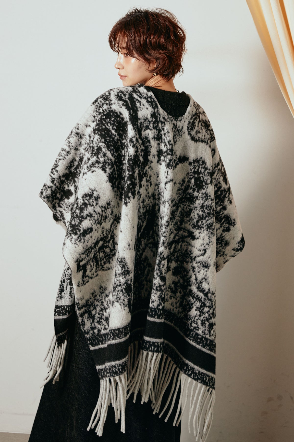 裾フリンジジャガード柄ポンチョアウター/ブラック