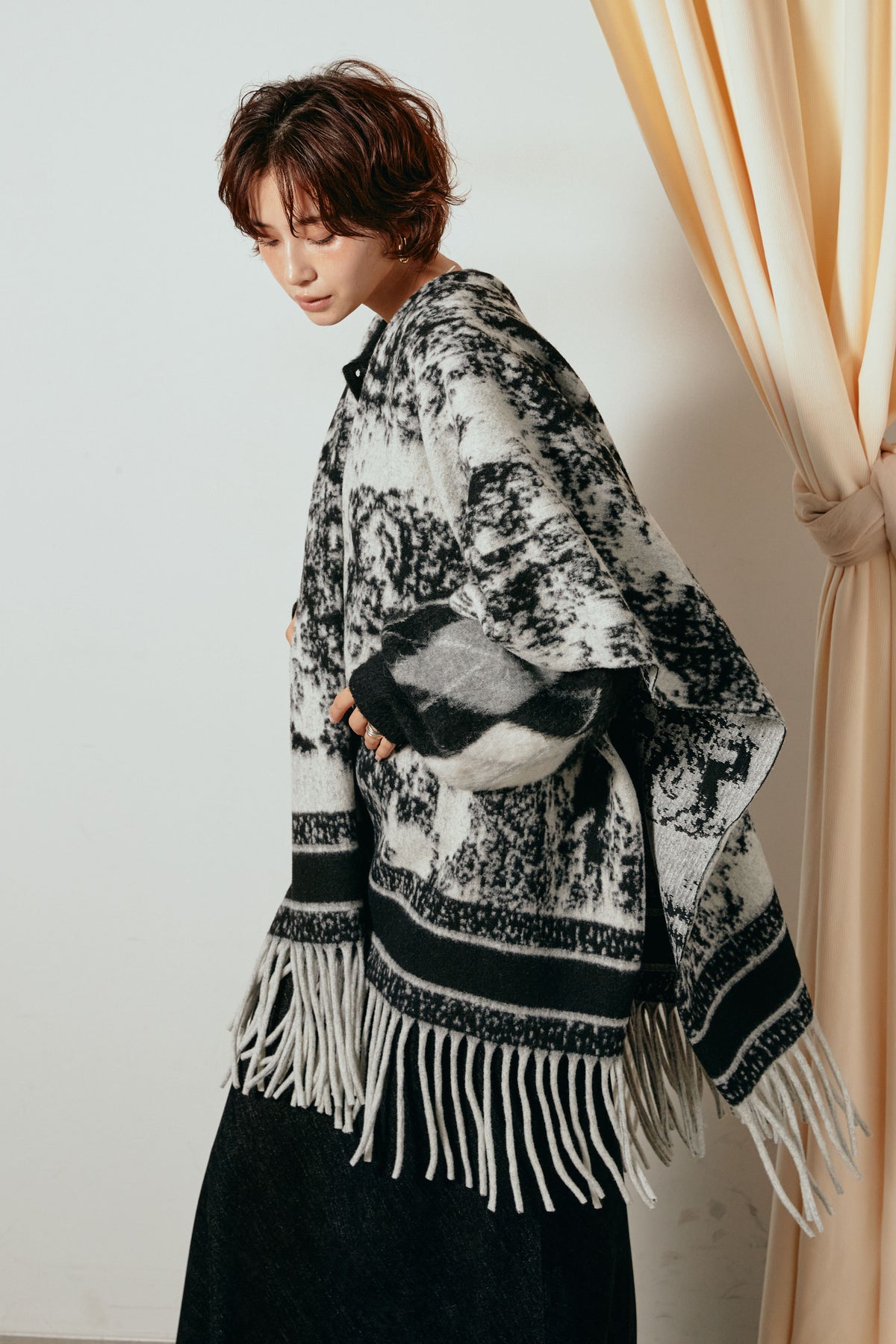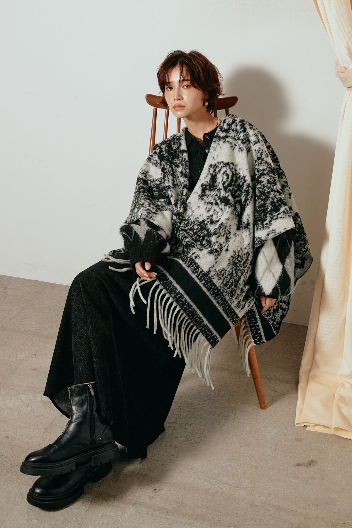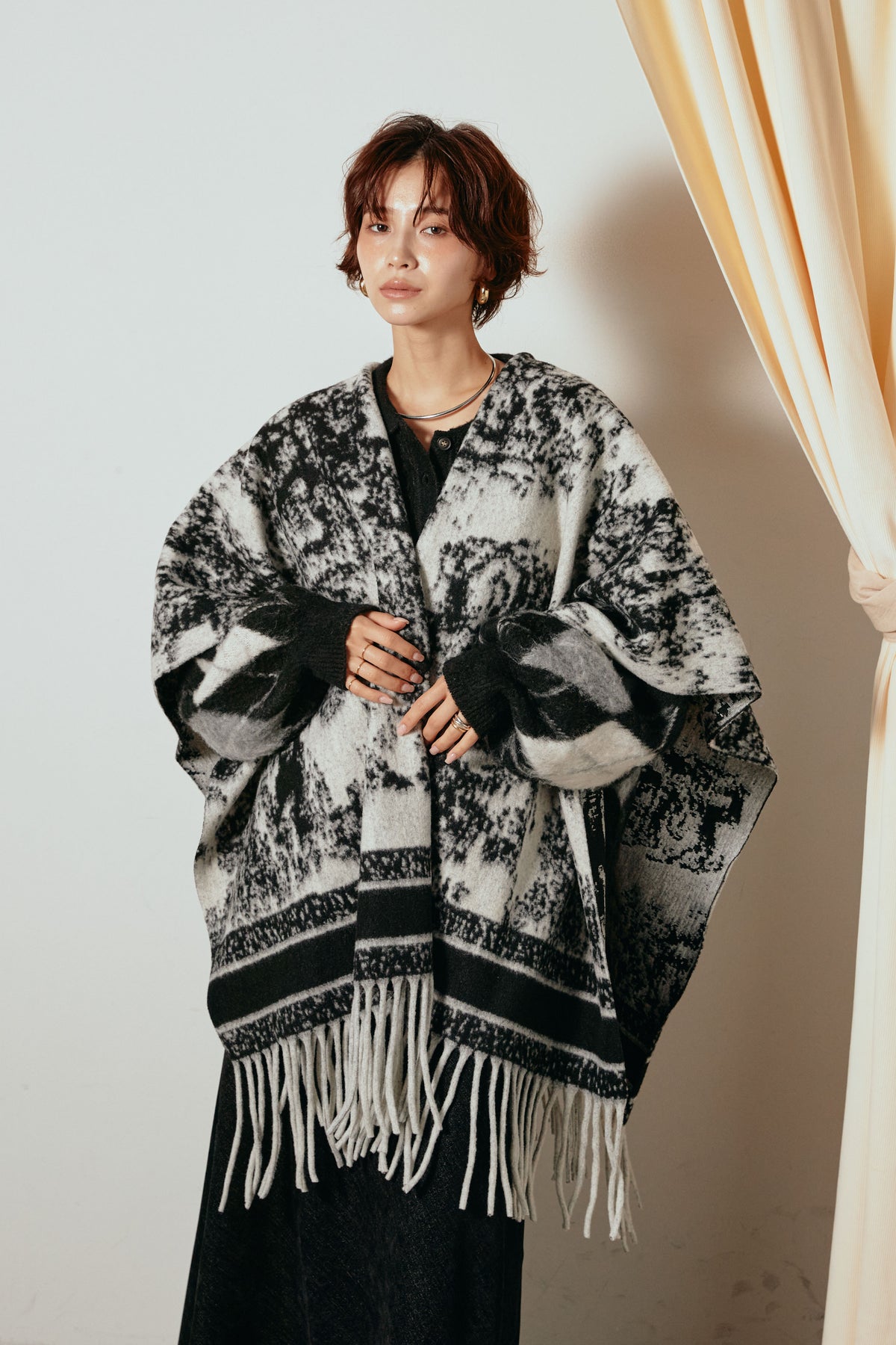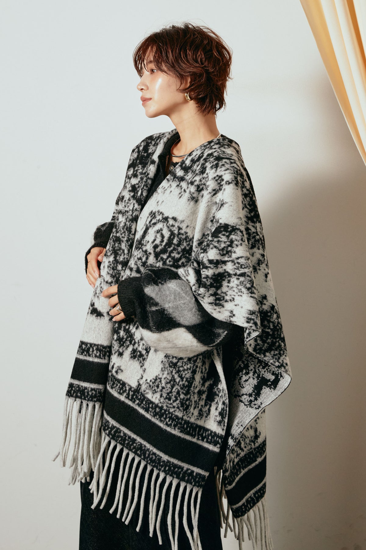 裾フリンジジャガード柄ポンチョアウター/ブラック