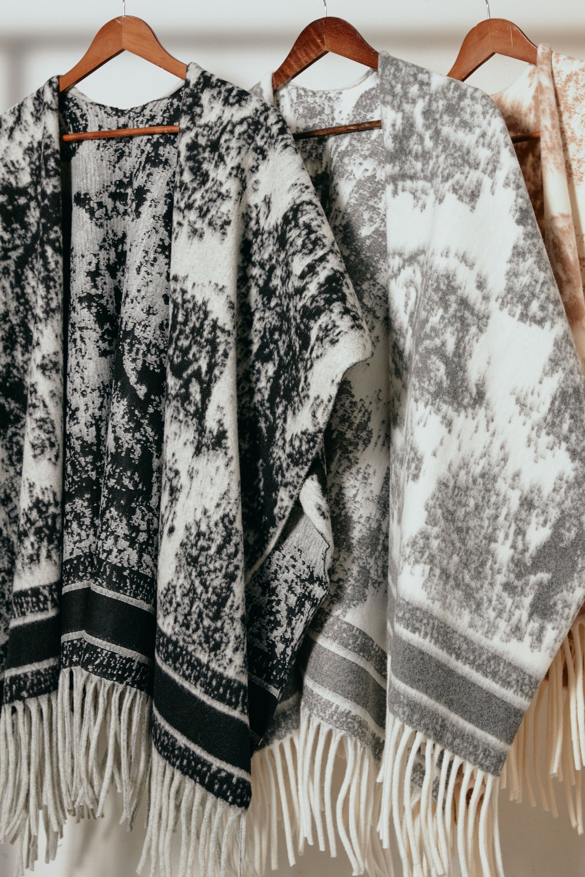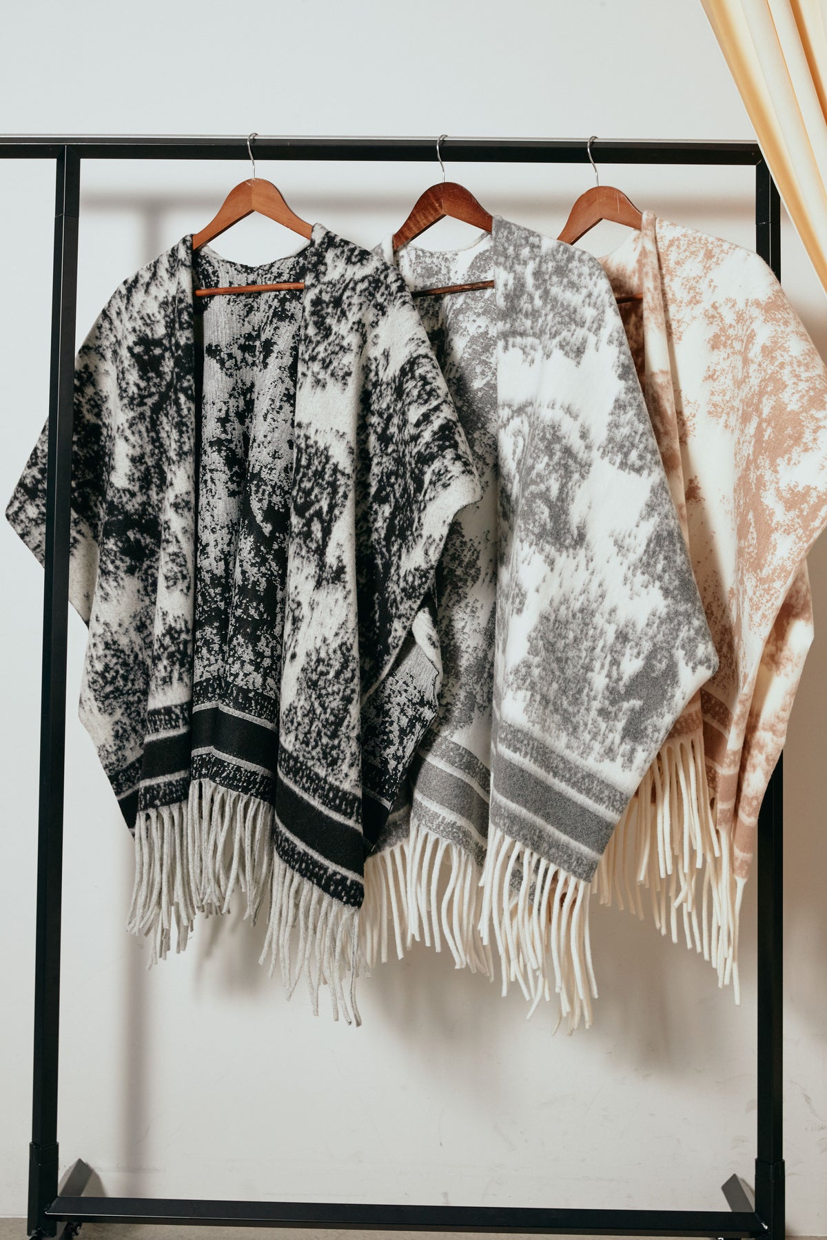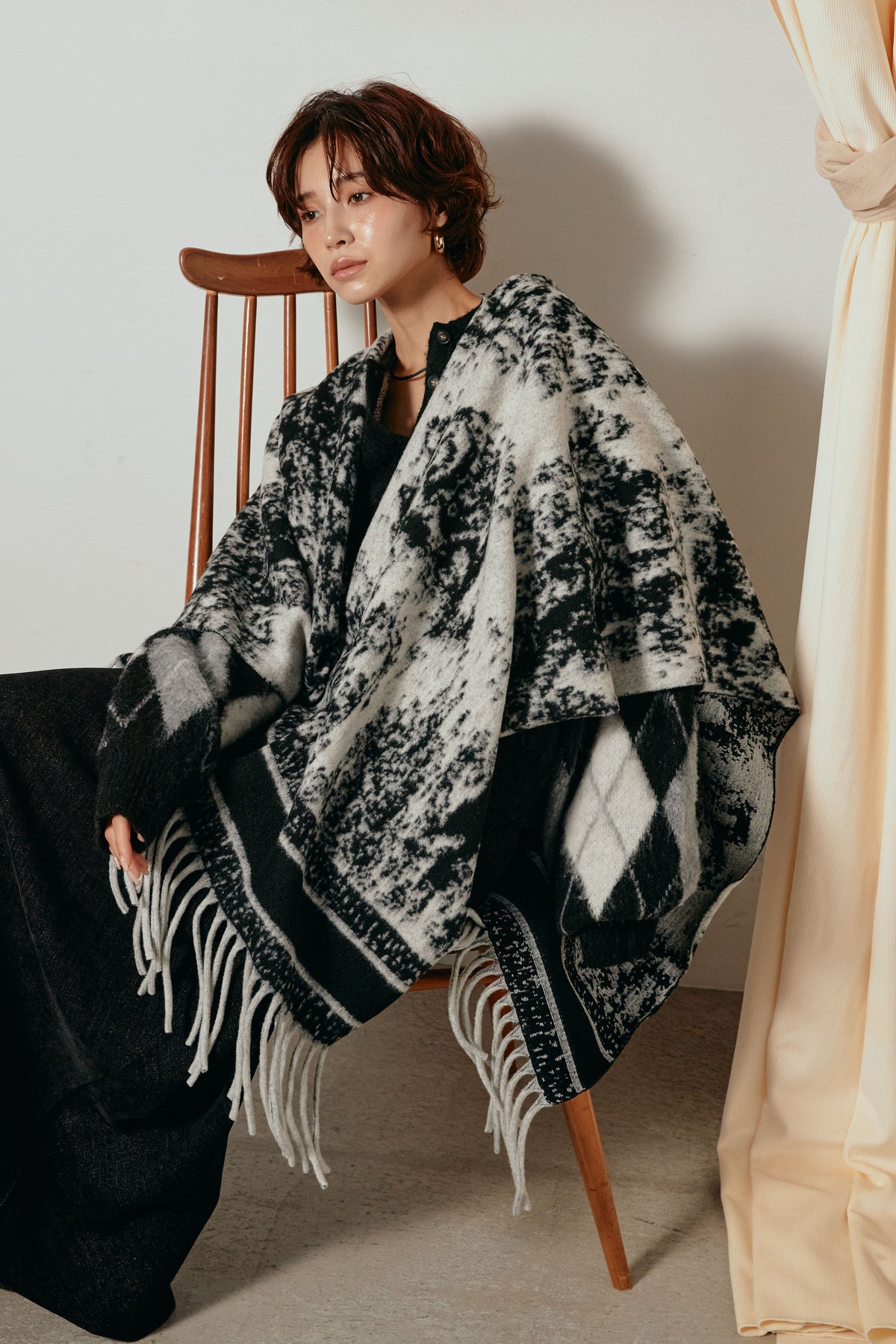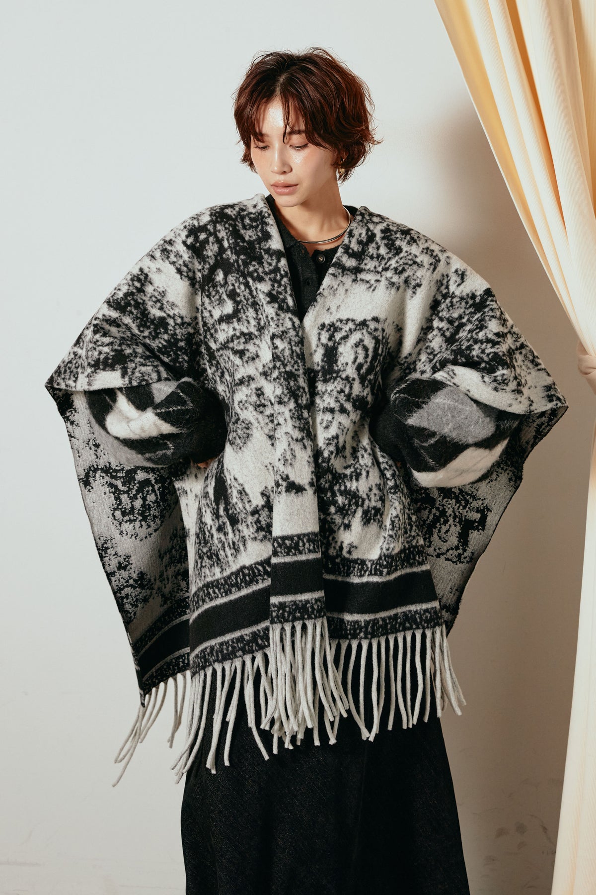 裾フリンジジャガード柄ポンチョアウター/ブラック