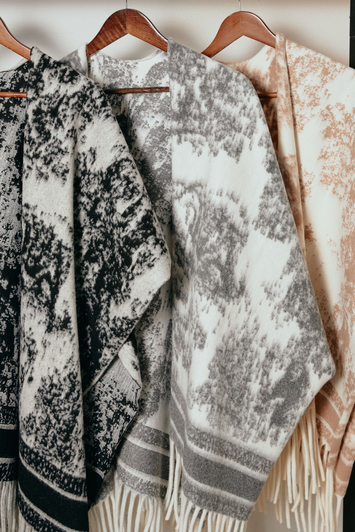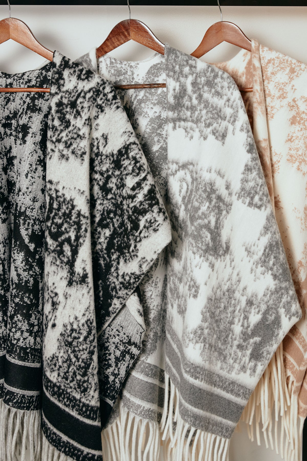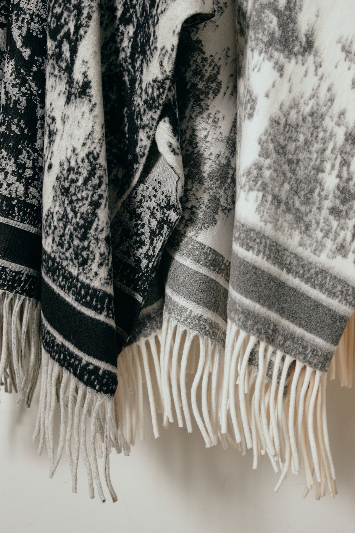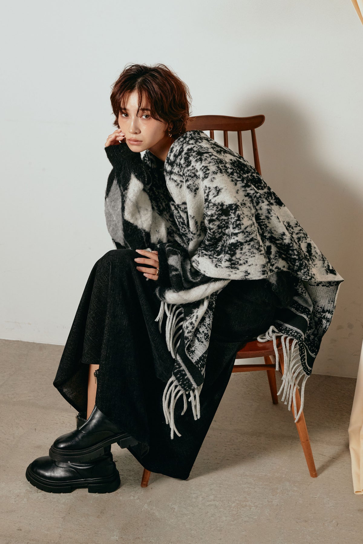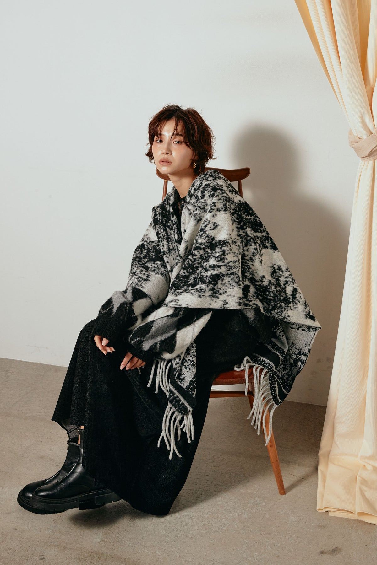 存在感のあるジャガード柄と裾フリンジが目を引くポンチョアウター。 ふんわりとしたシルエットで、さっと羽織るだけでこなれ感のあるスタイリングに。 軽やかな着心地ながらもしっかり暖かく、季節の変わり目や秋冬のレイヤードにぴったりな1着です。