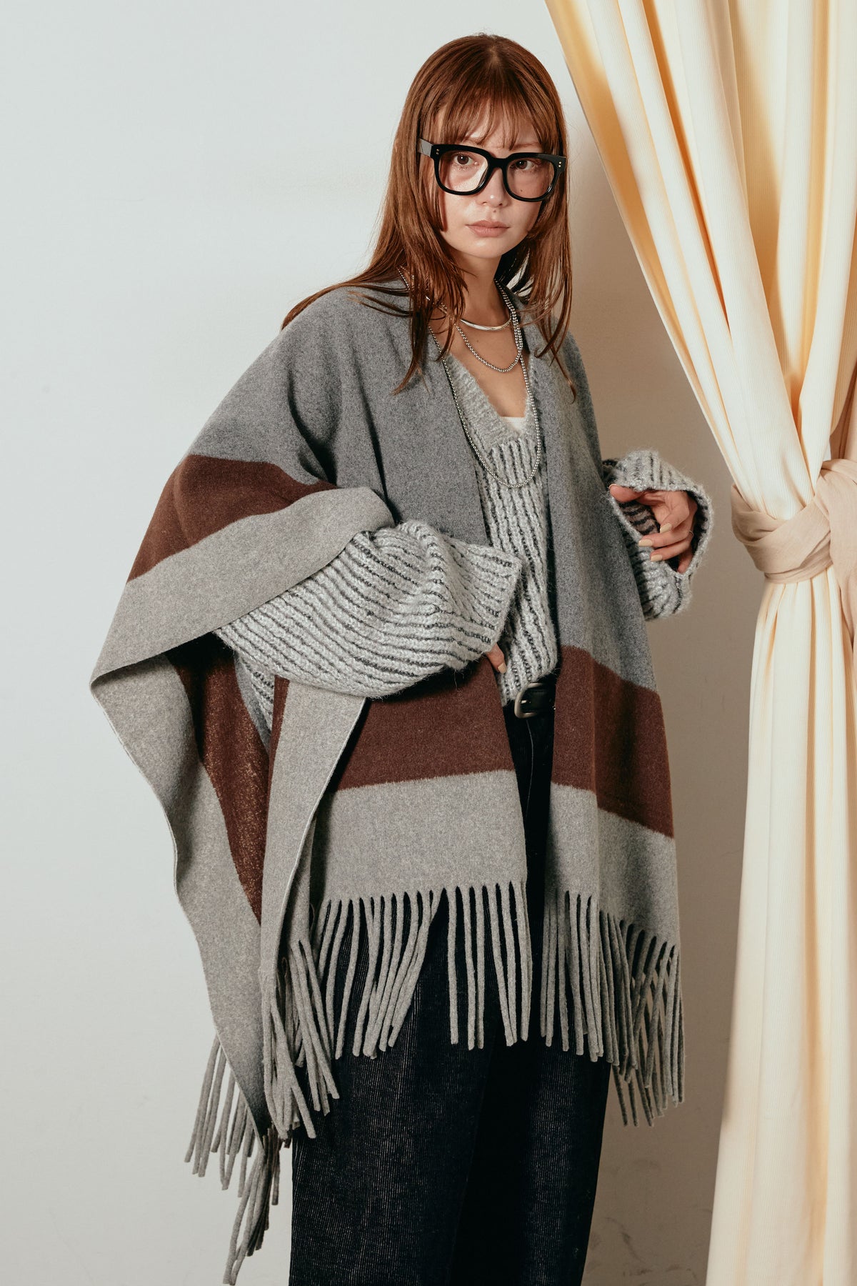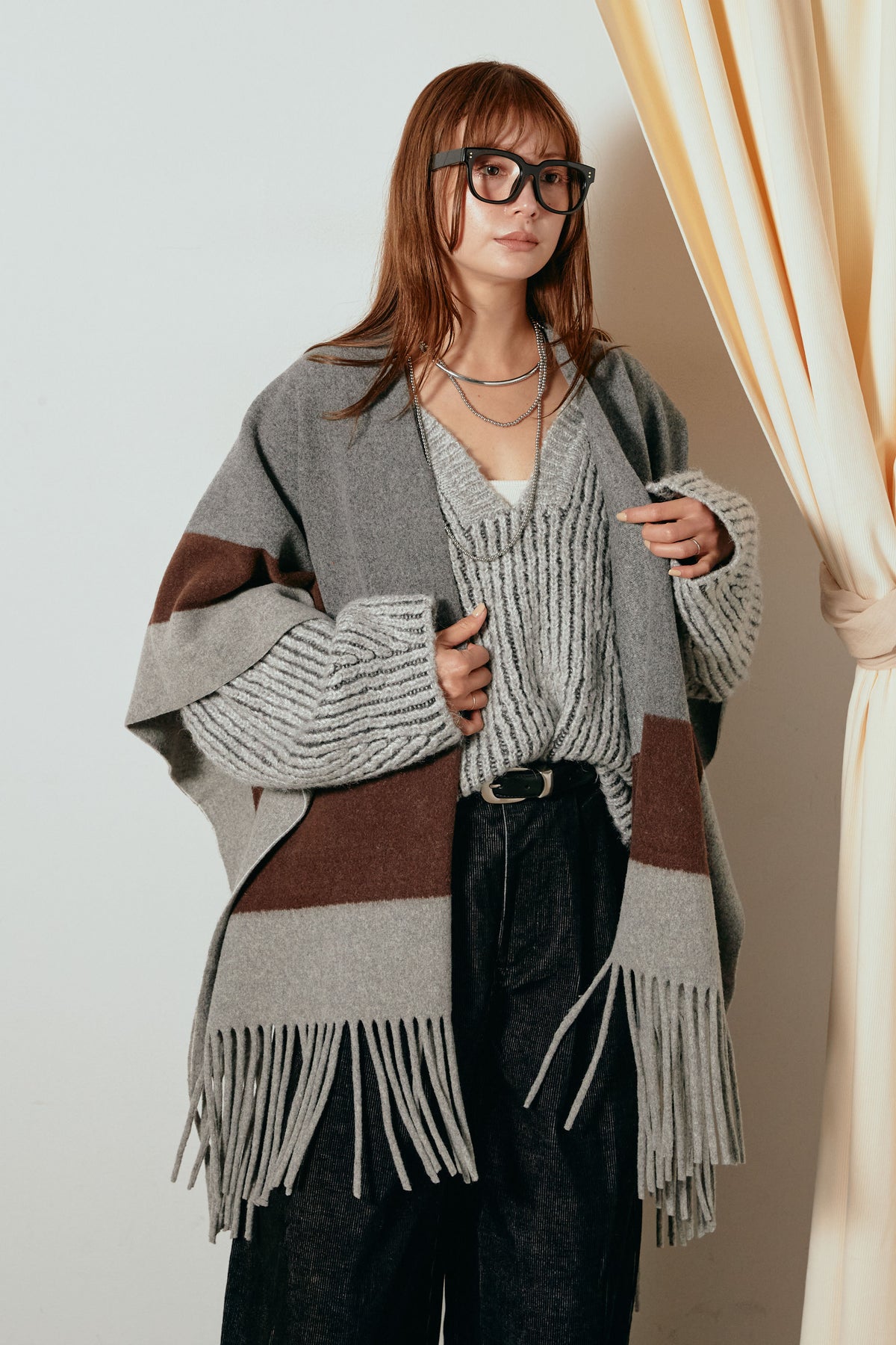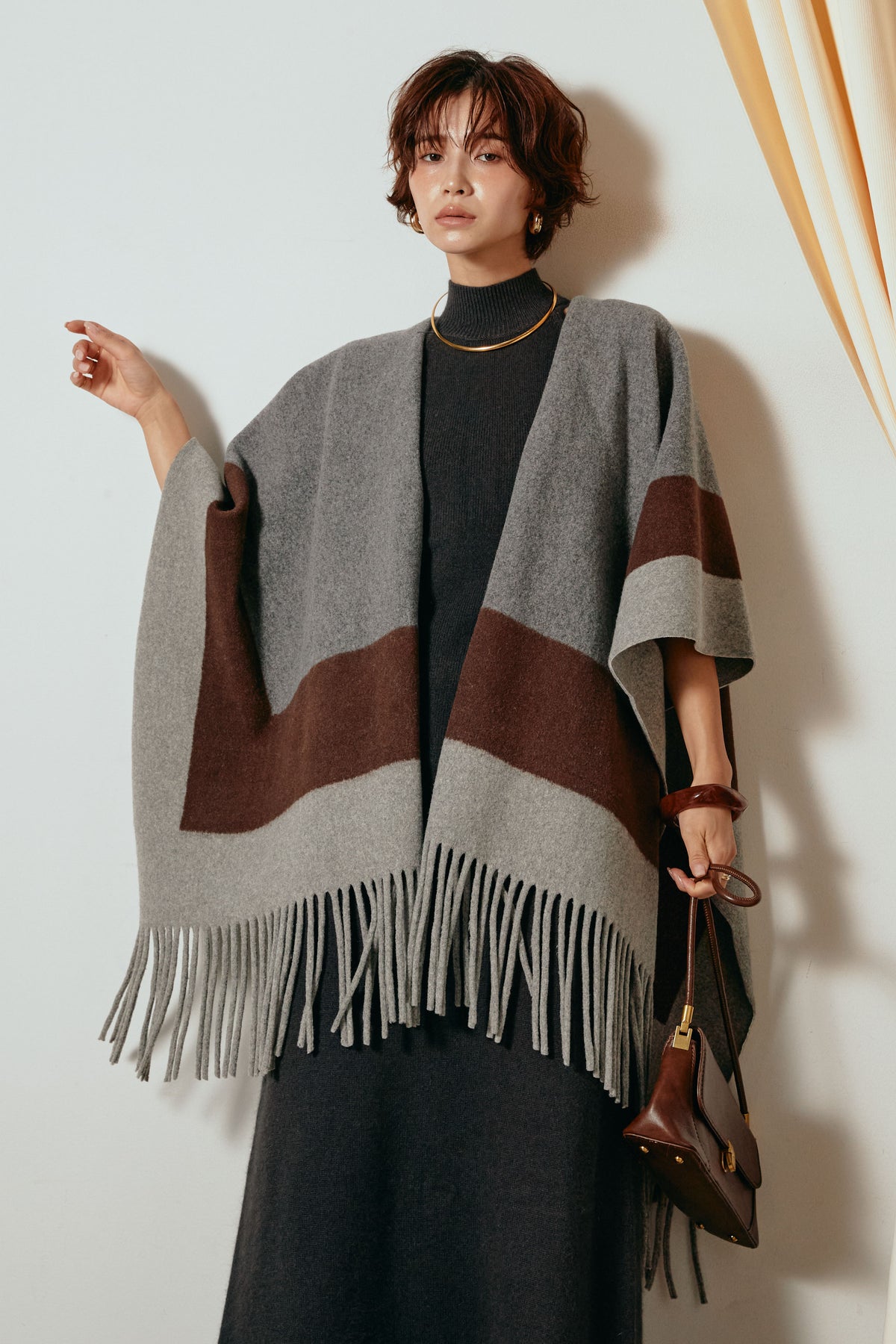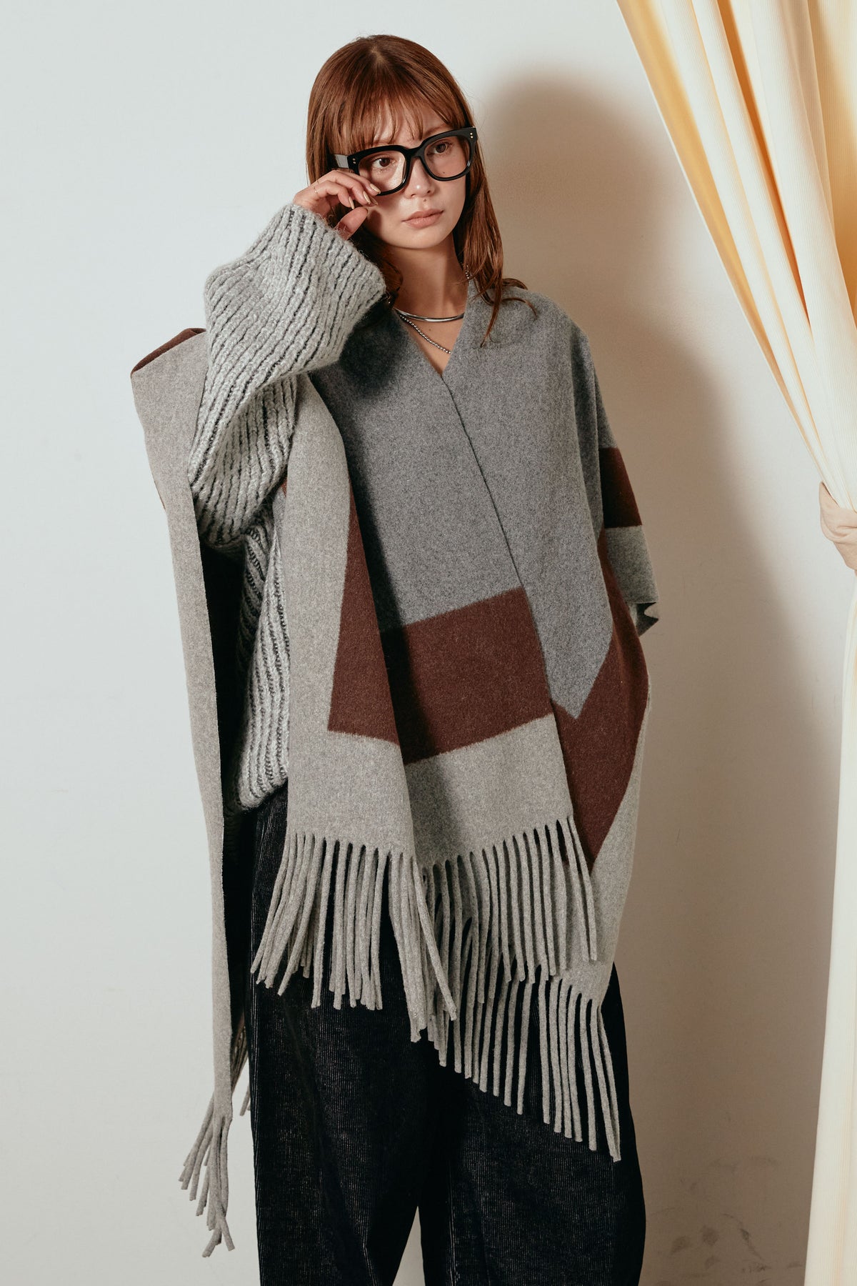 裾のフリンジと大柄デザインが印象的なポンチョアウター。 ゆったりとしたシルエットで、ラフに羽織るだけでスタイリングの主役に。 厚手すぎない素材感で季節の変わり目にも活躍し、デニムやブーツとの相性も抜群です。