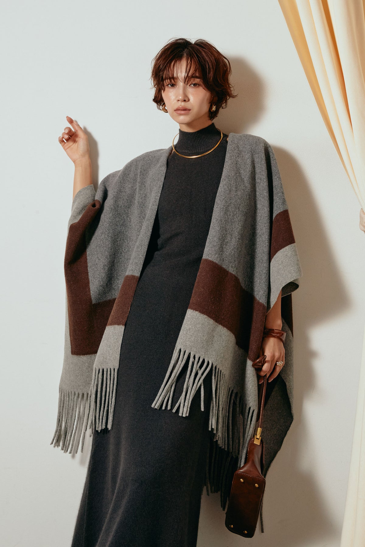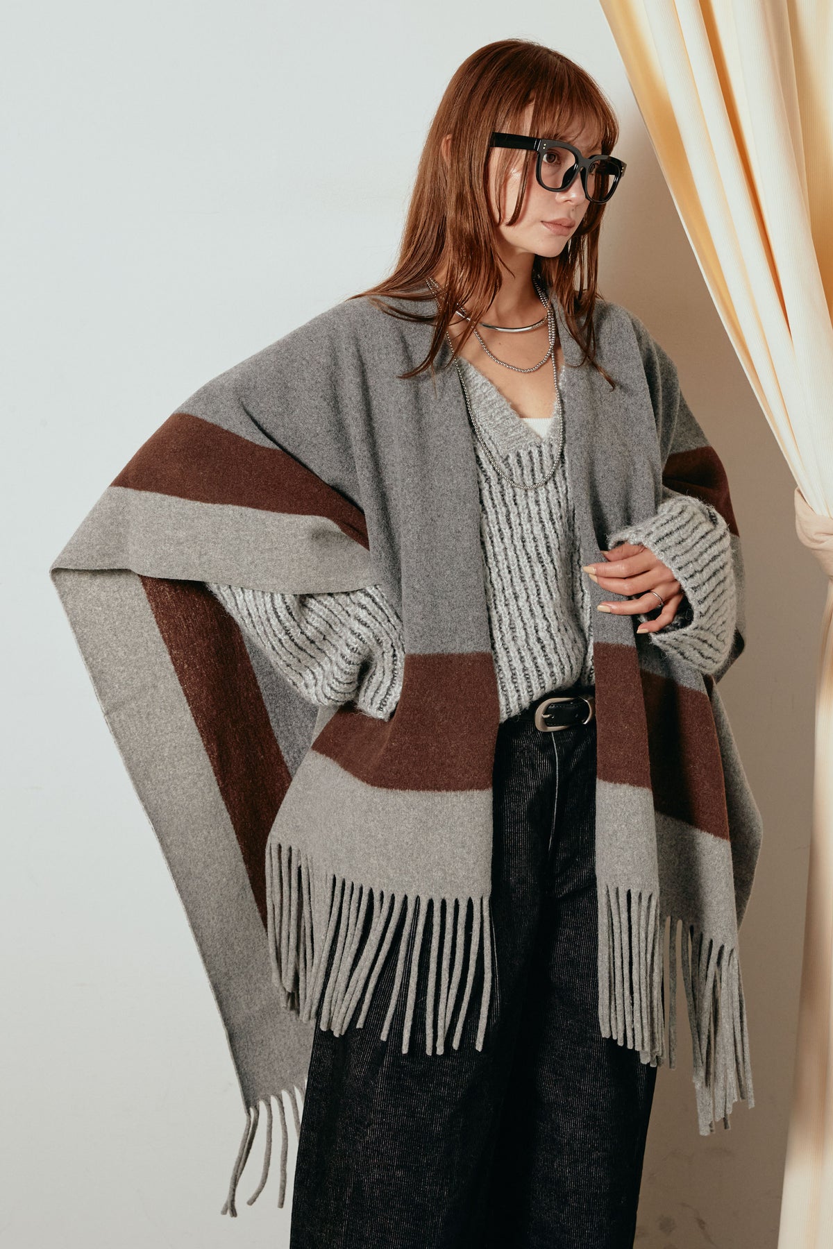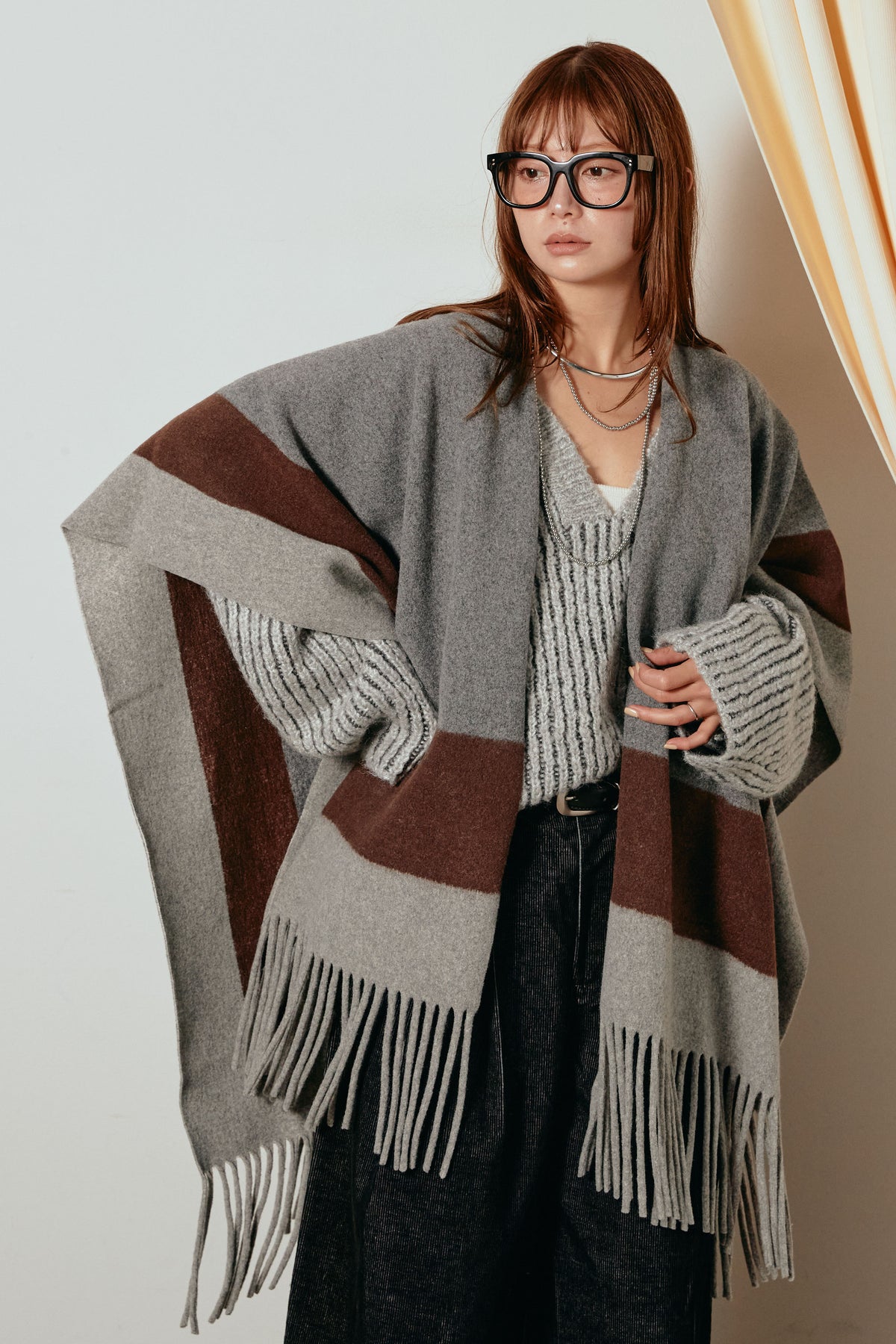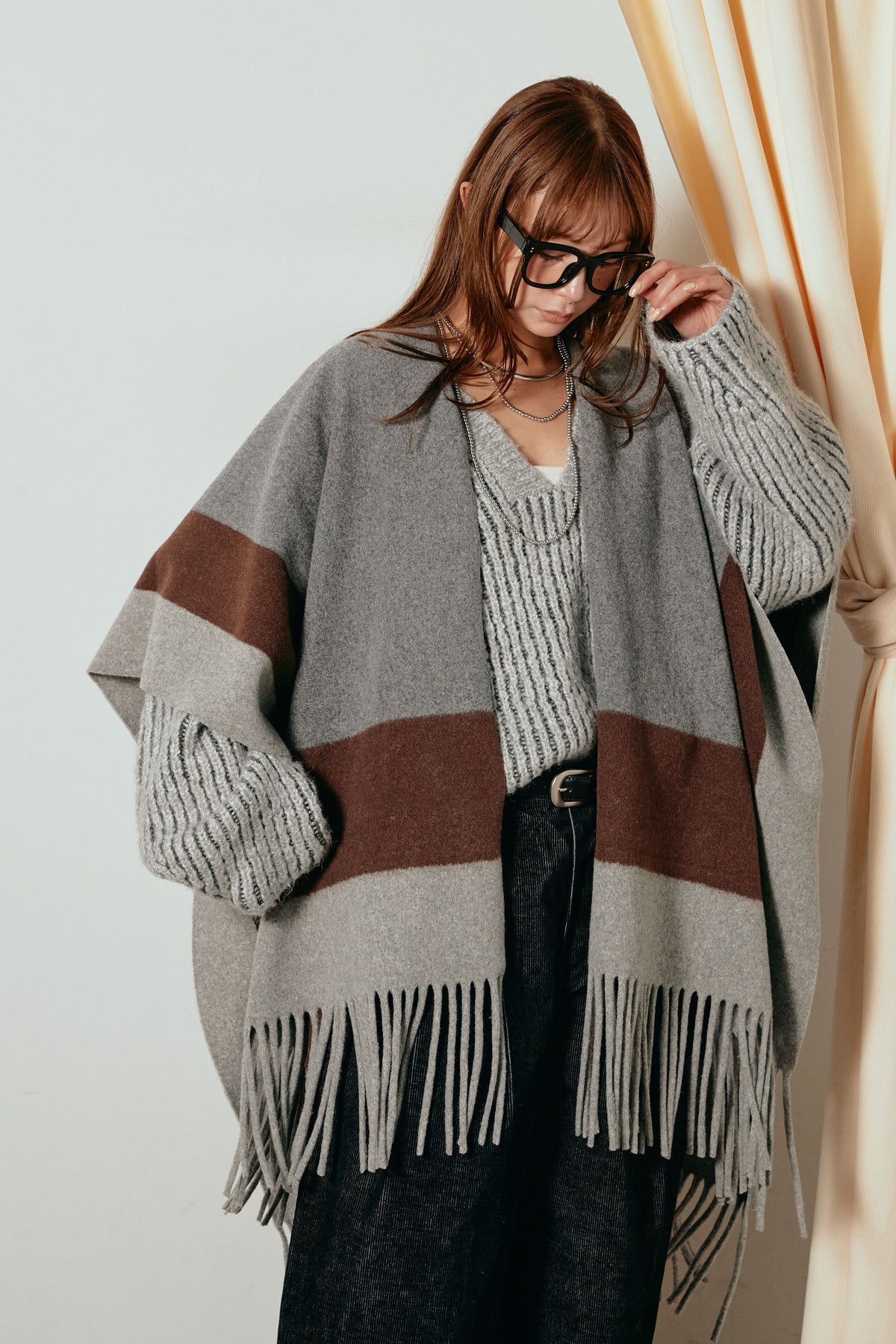 裾のフリンジと大柄デザインが印象的なポンチョアウター。 ゆったりとしたシルエットで、ラフに羽織るだけでスタイリングの主役に。 厚手すぎない素材感で季節の変わり目にも活躍し、デニムやブーツとの相性も抜群です。