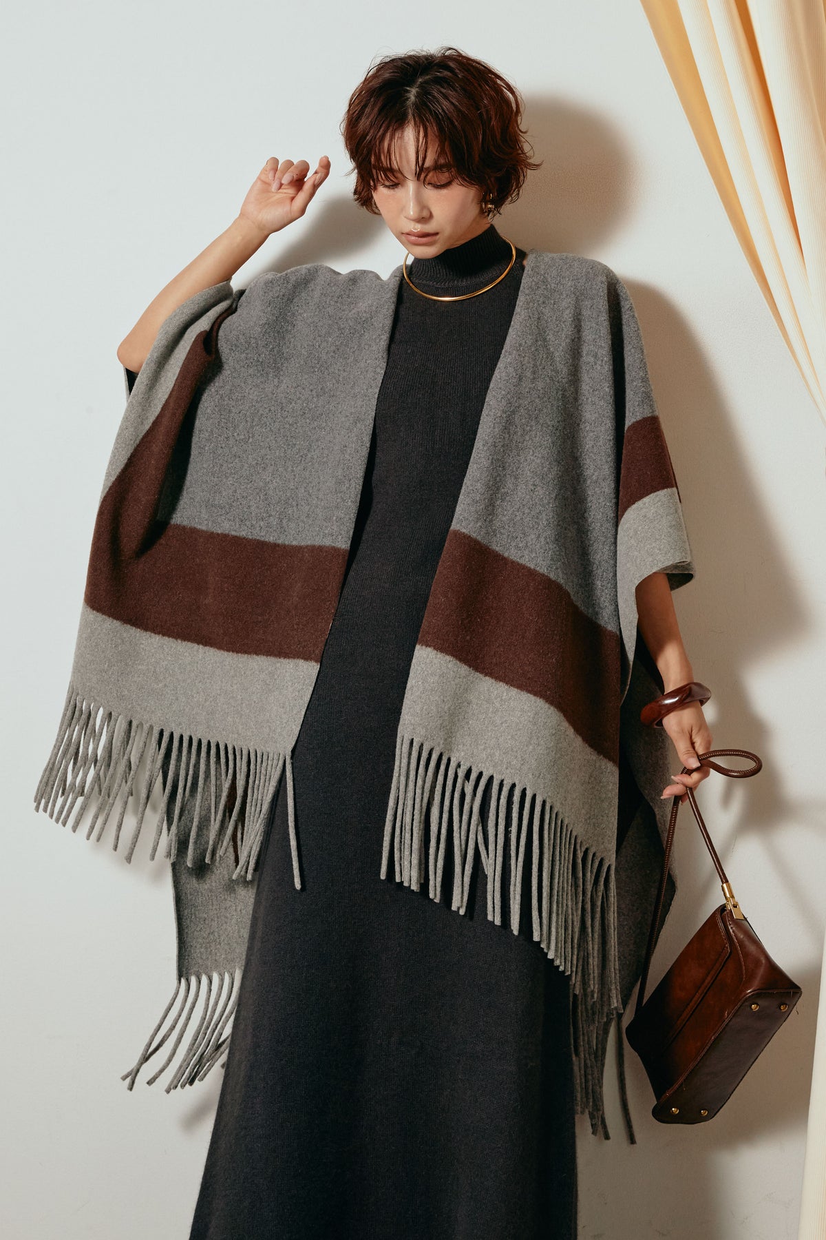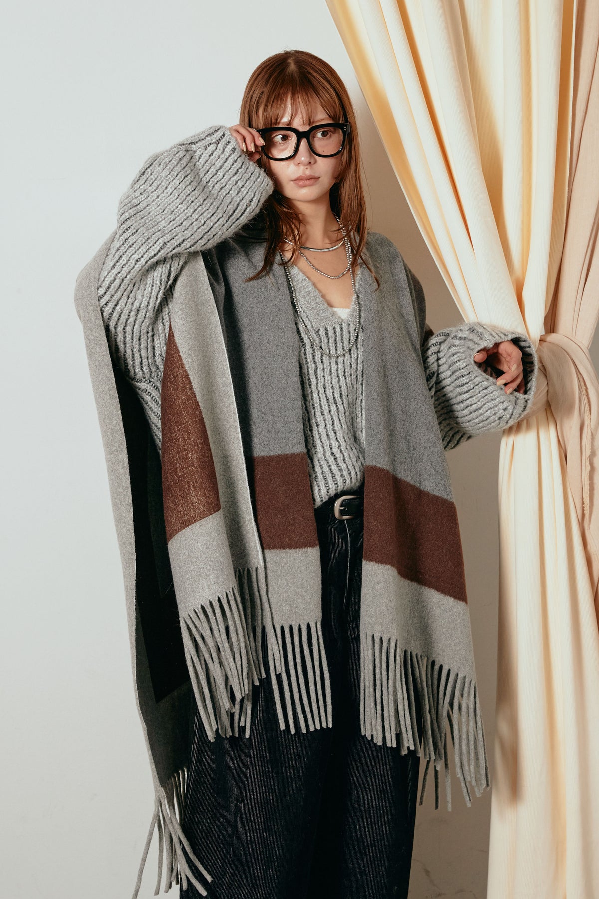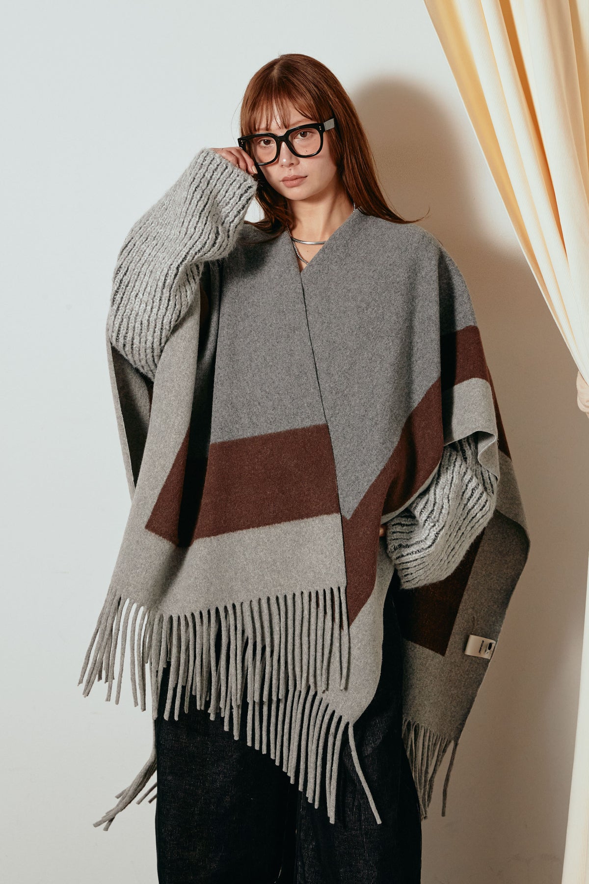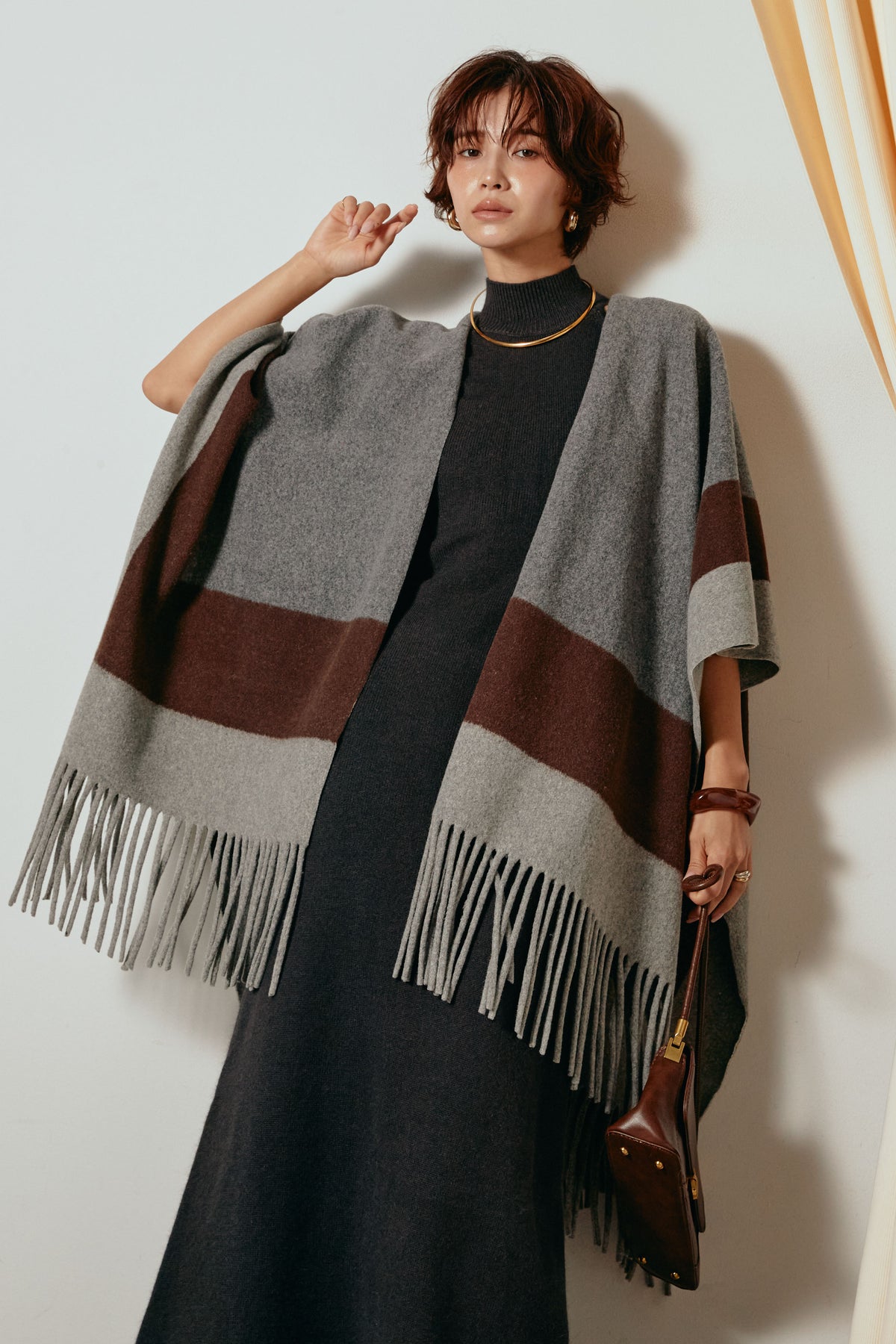 裾のフリンジと大柄デザインが印象的なポンチョアウター。 ゆったりとしたシルエットで、ラフに羽織るだけでスタイリングの主役に。 厚手すぎない素材感で季節の変わり目にも活躍し、デニムやブーツとの相性も抜群です。