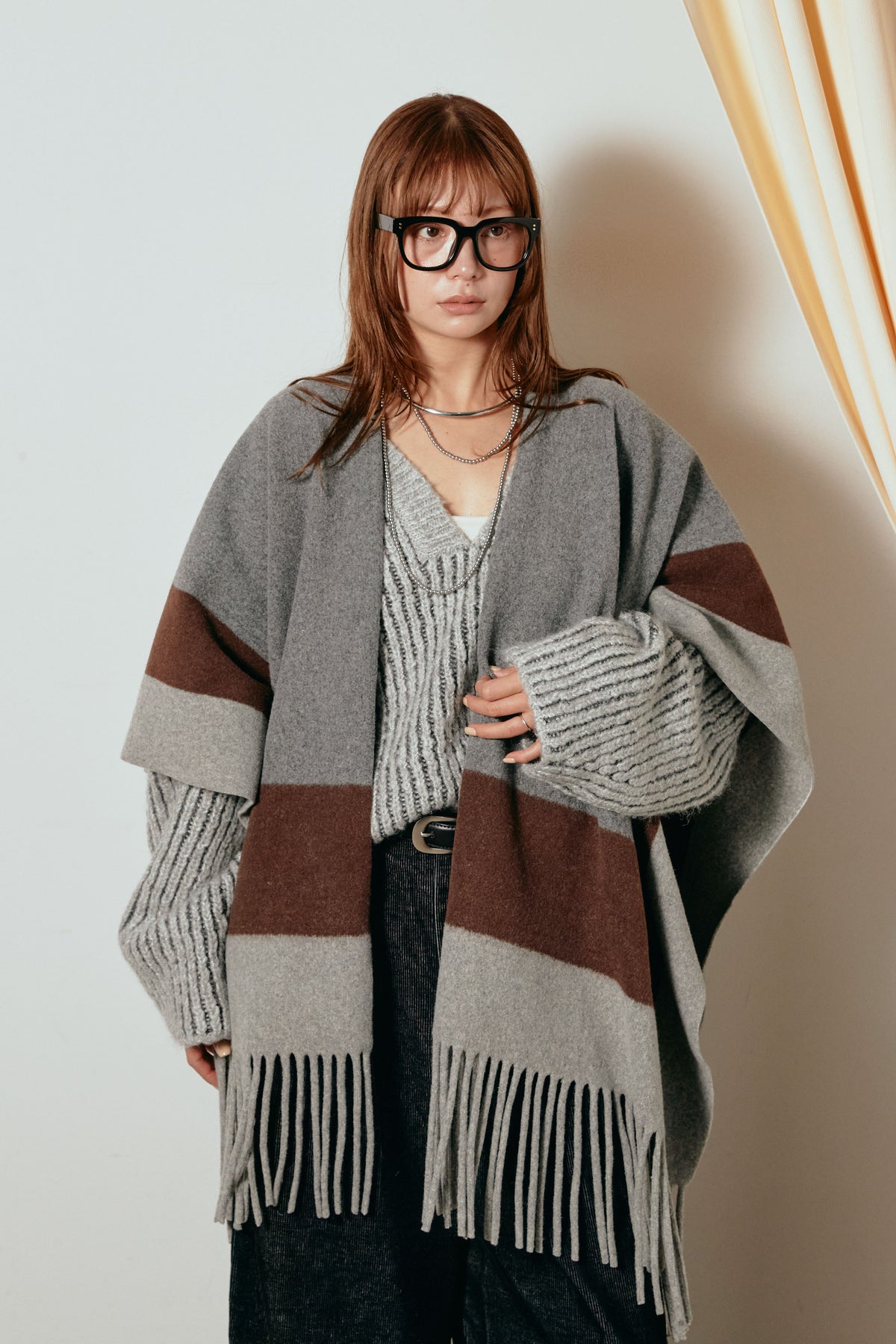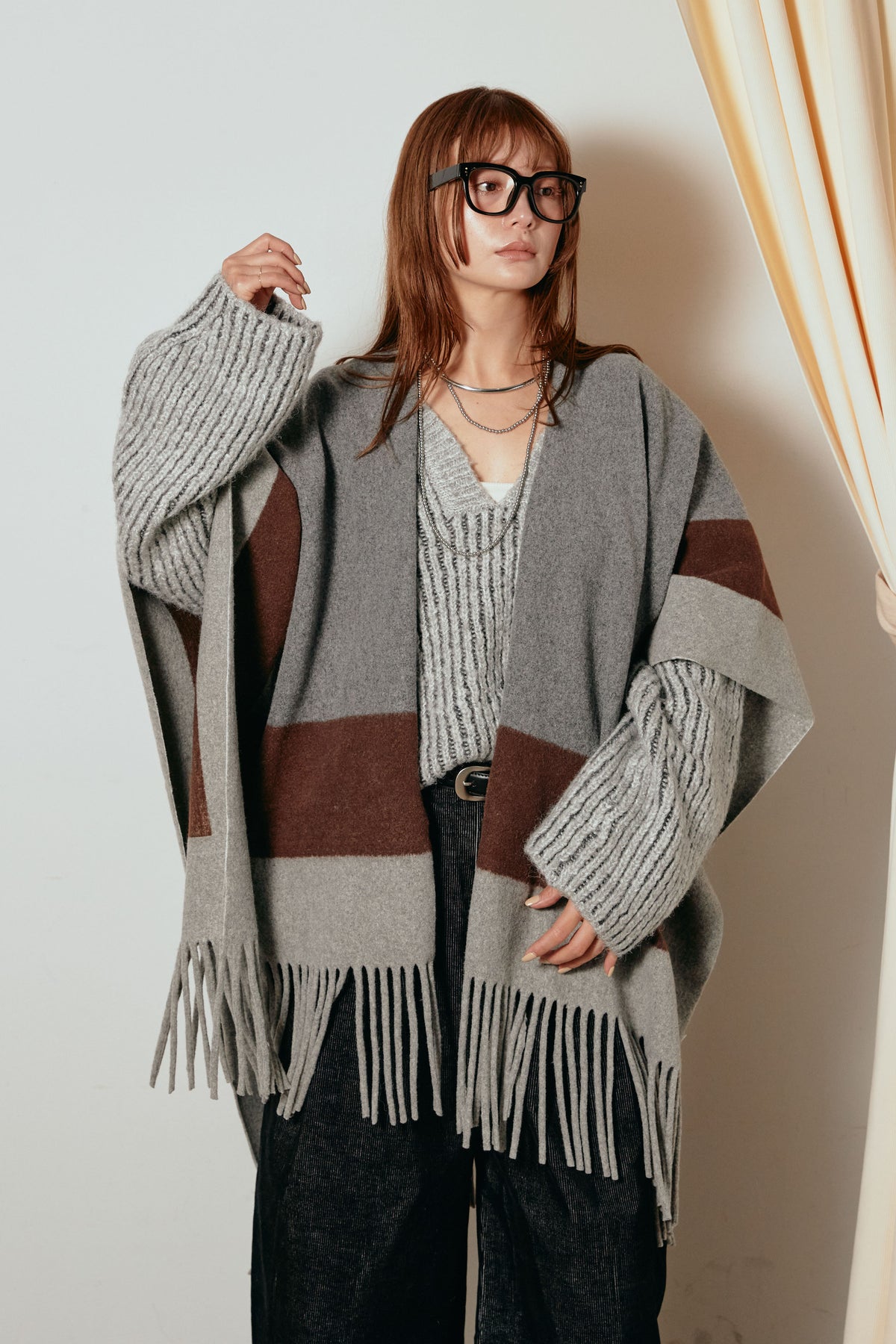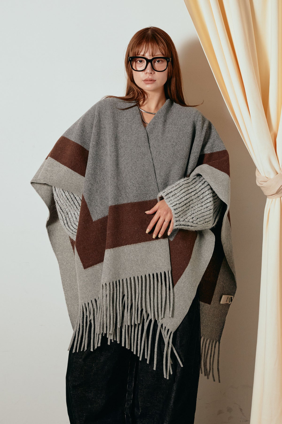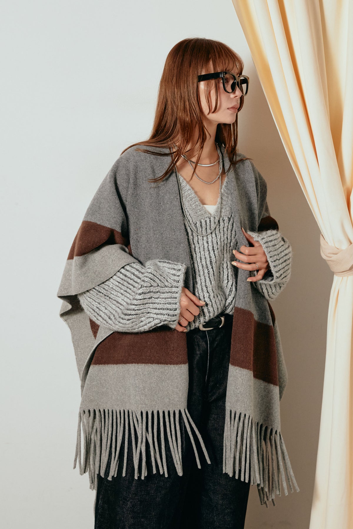 裾のフリンジと大柄デザインが印象的なポンチョアウター。 ゆったりとしたシルエットで、ラフに羽織るだけでスタイリングの主役に。 厚手すぎない素材感で季節の変わり目にも活躍し、デニムやブーツとの相性も抜群です。
