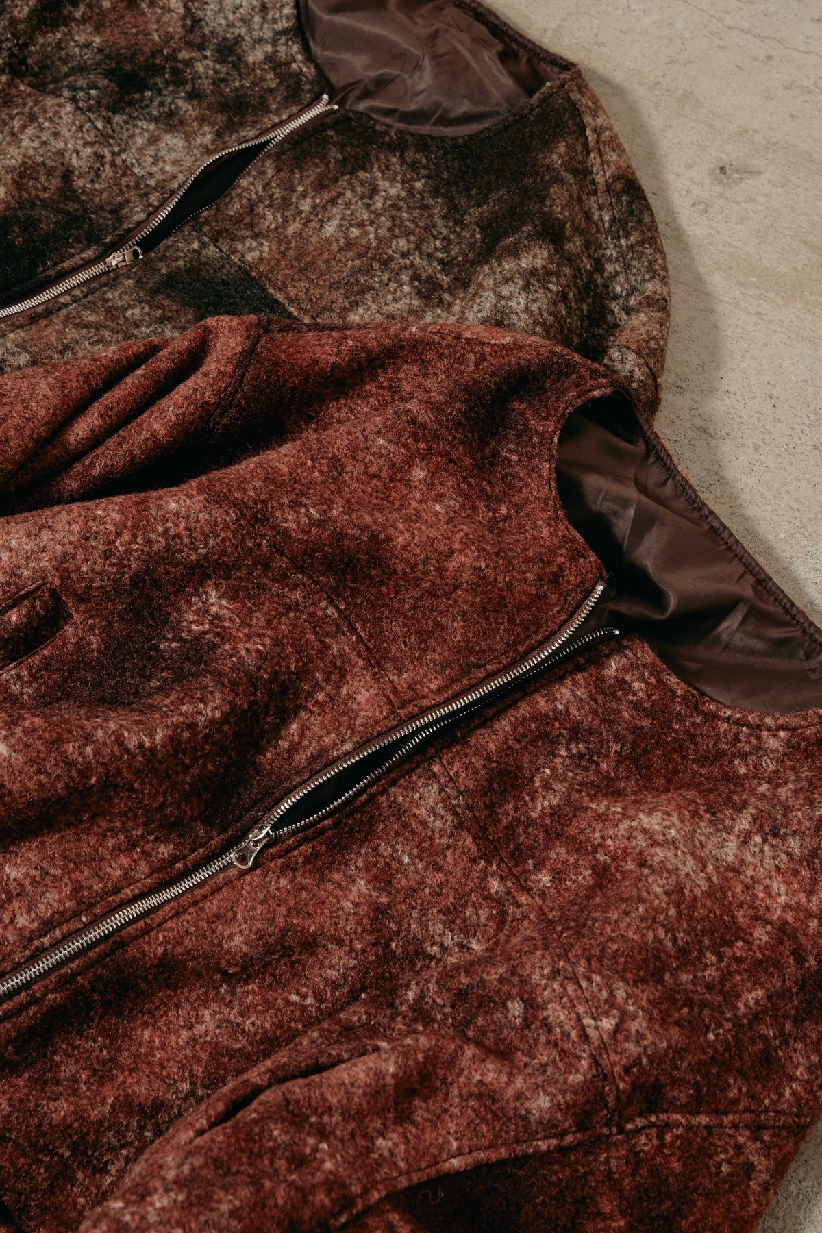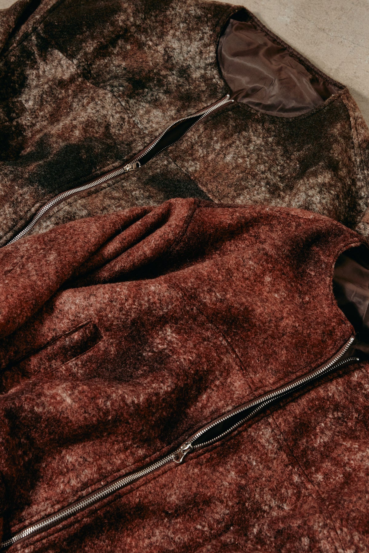 ヴィンテージライクな風合いのニュアンス柄が目を惹くノーカラーアウター。柔らかく起毛感のある素材がほどよいボリュームを生み、軽やかなのに存在感のある一枚に仕上がっています。ゆったりとしたサイズ感で中にニットを重ねてももたつかず、ジップデザインで着脱もスムーズ。カジュアルにもモードにも馴染む、季節の変わり目に活躍するアイテムです。