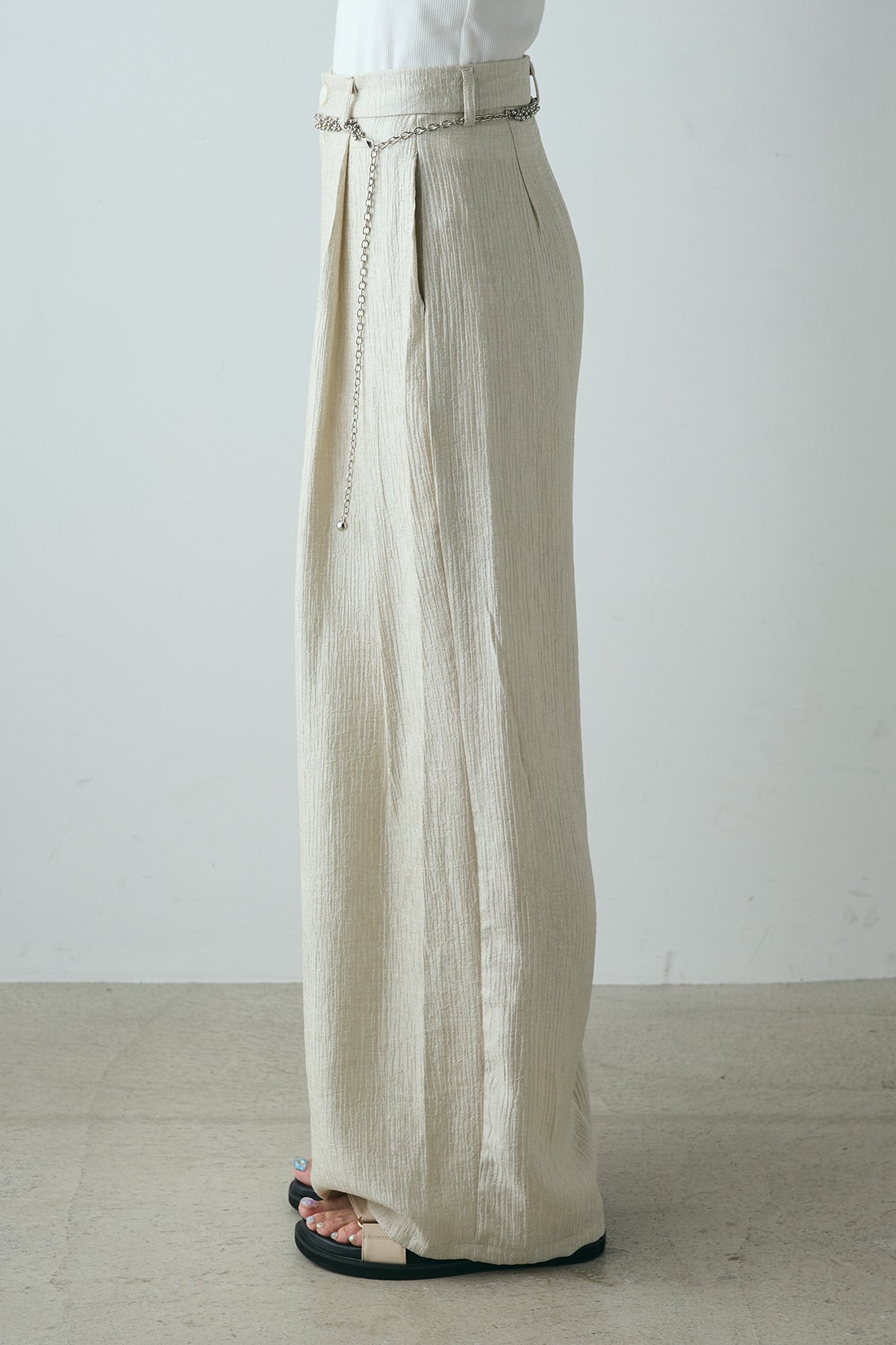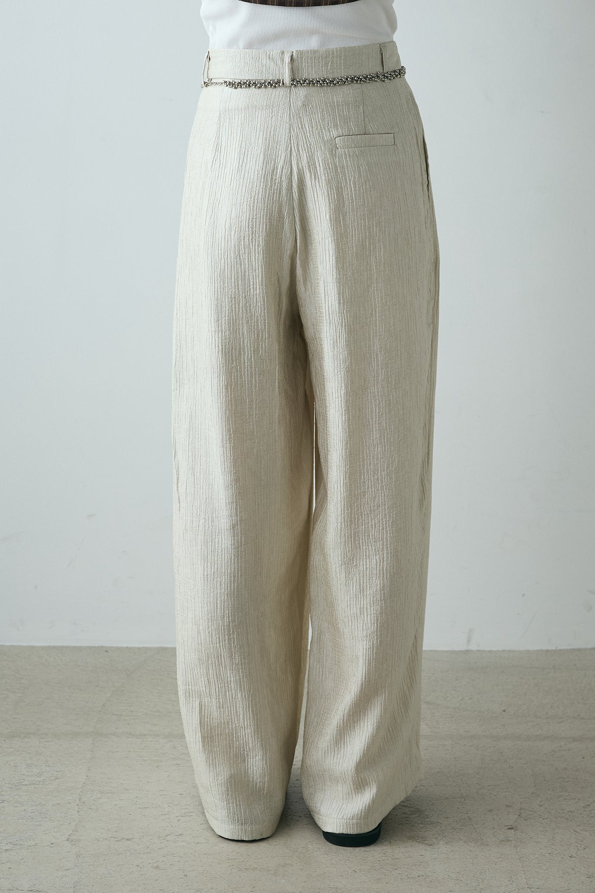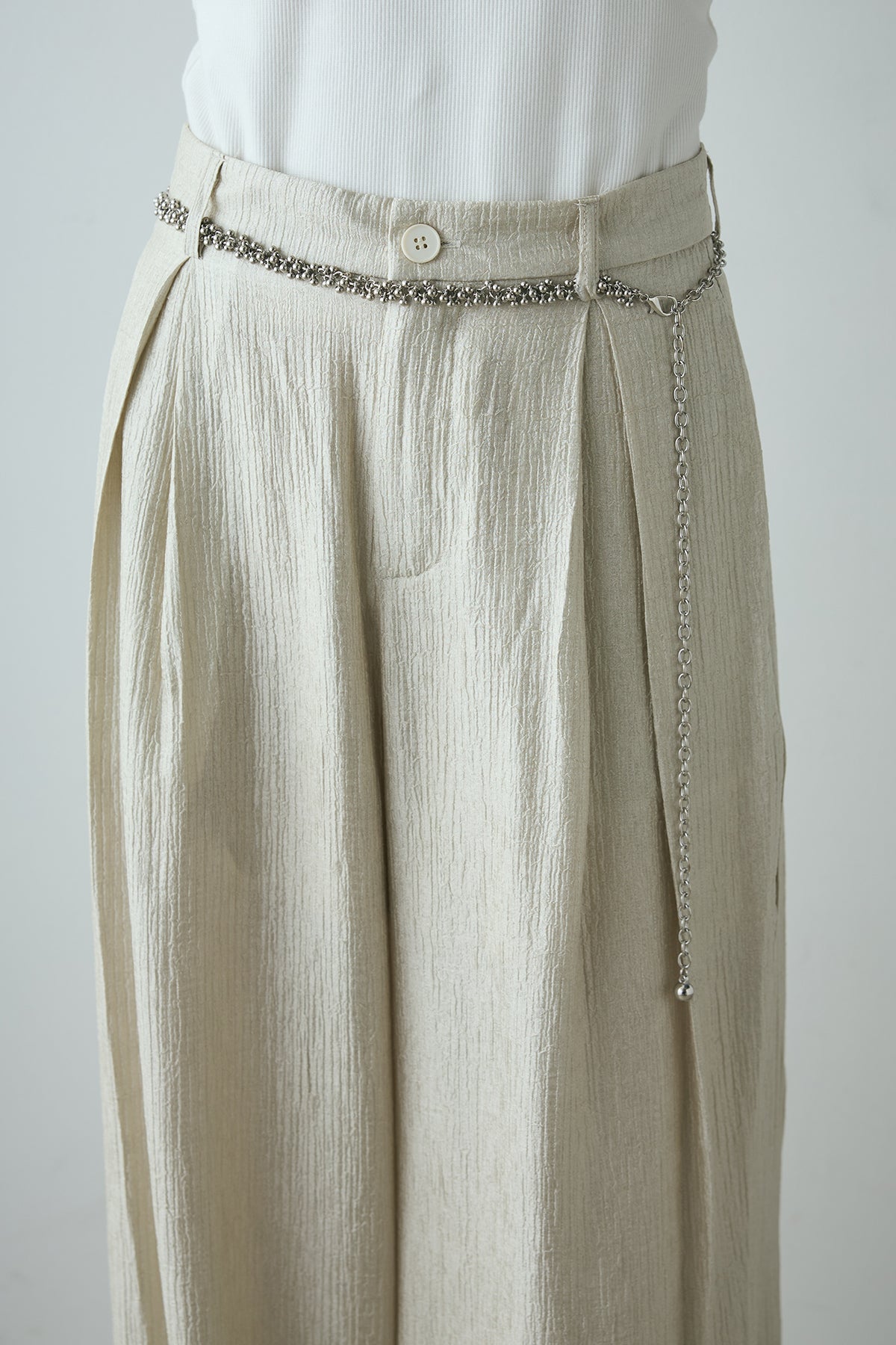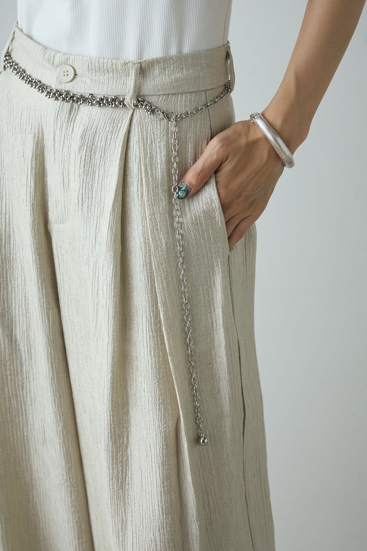 表情のあるワッシャー素材に、さりげないエッジを添えるシルバーチェーンが印象的な一本。動くたびに揺れるディテールが、スタイリングに個性と軽やかさをプラスします。ほどよくゆとりのあるストレートシルエットで、ラフながらもスタイリッシュな印象に。柔らかなカラーが抜け感を演出し、シンプルなトップスと合わせるだけでこなれた雰囲気が完成します。