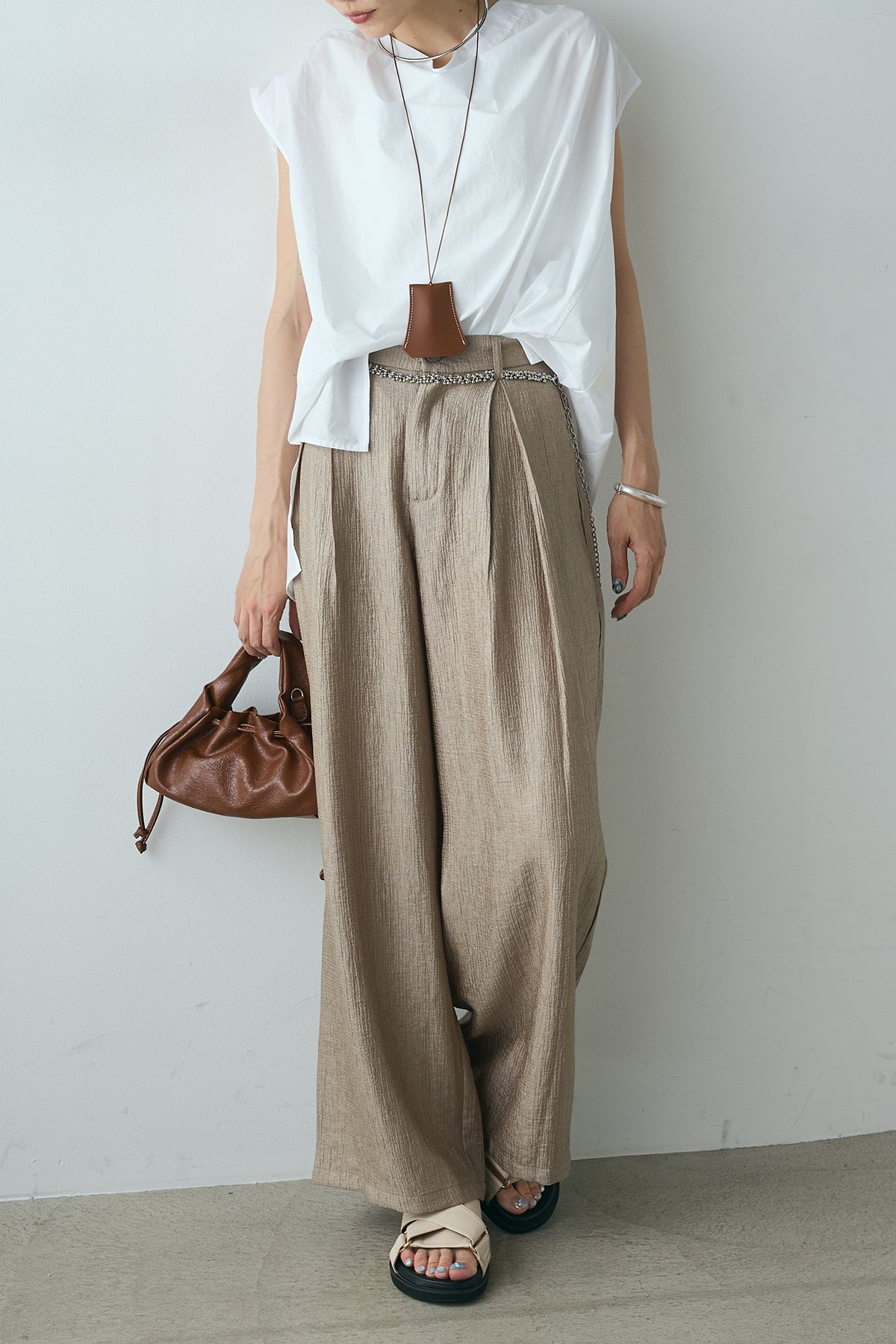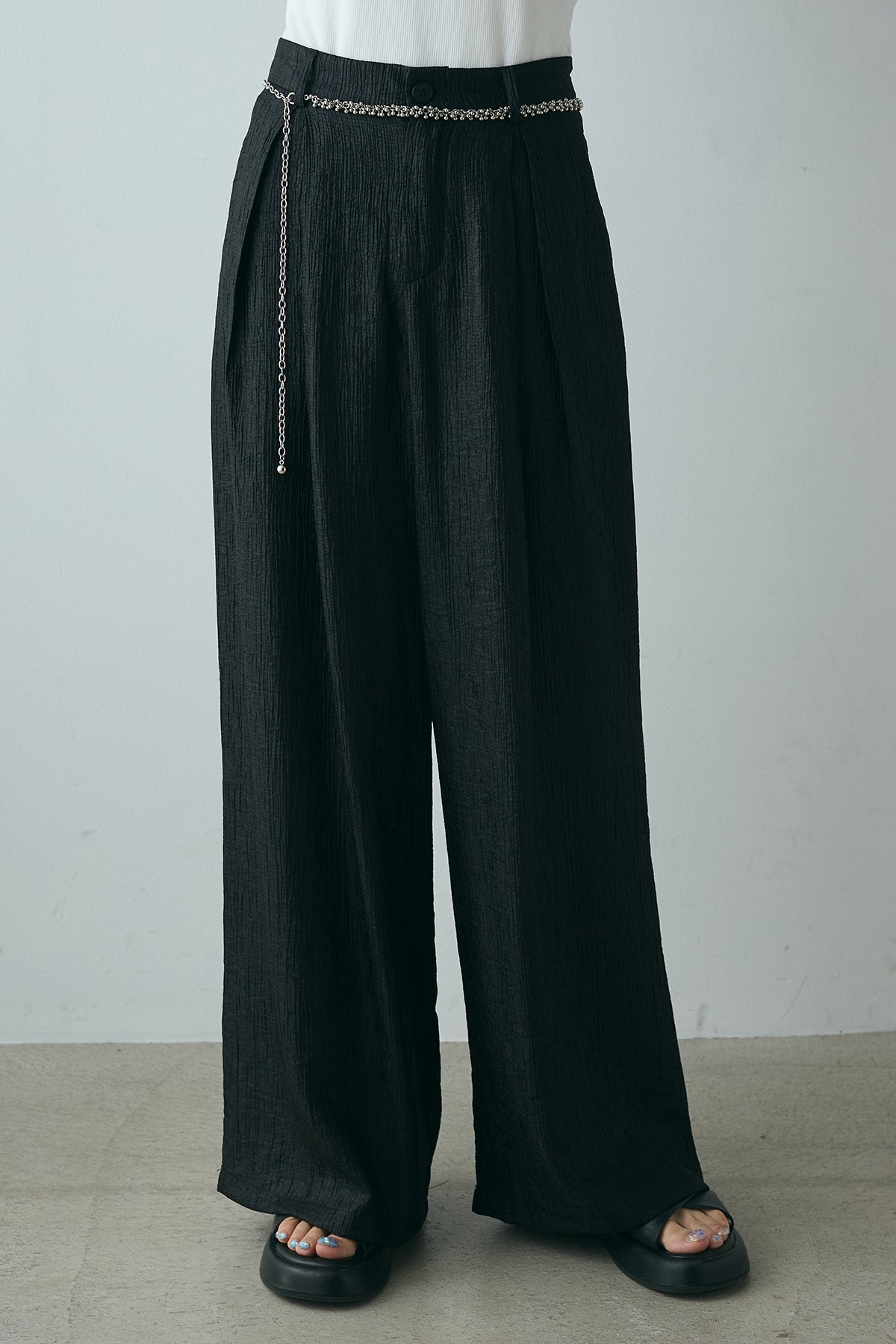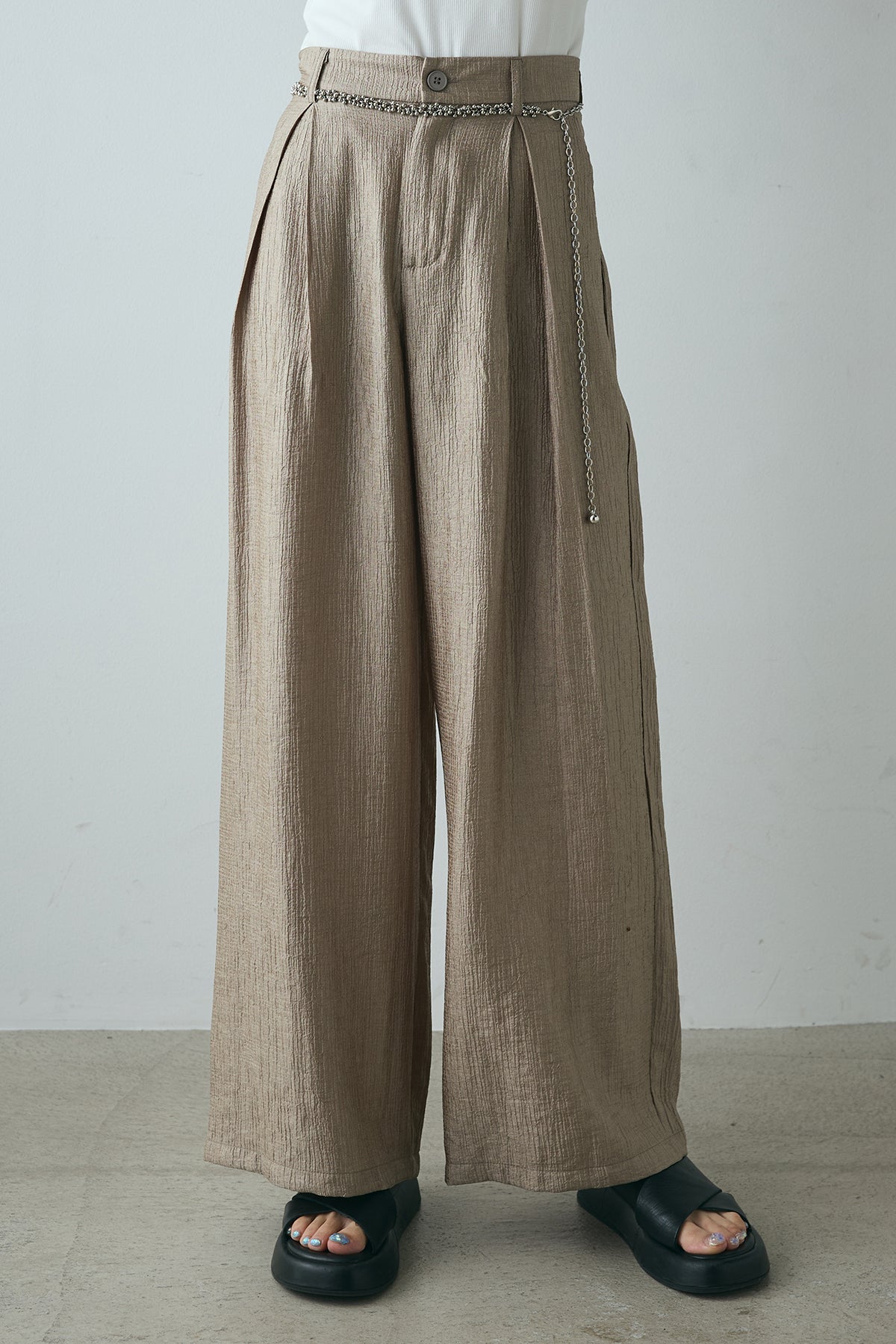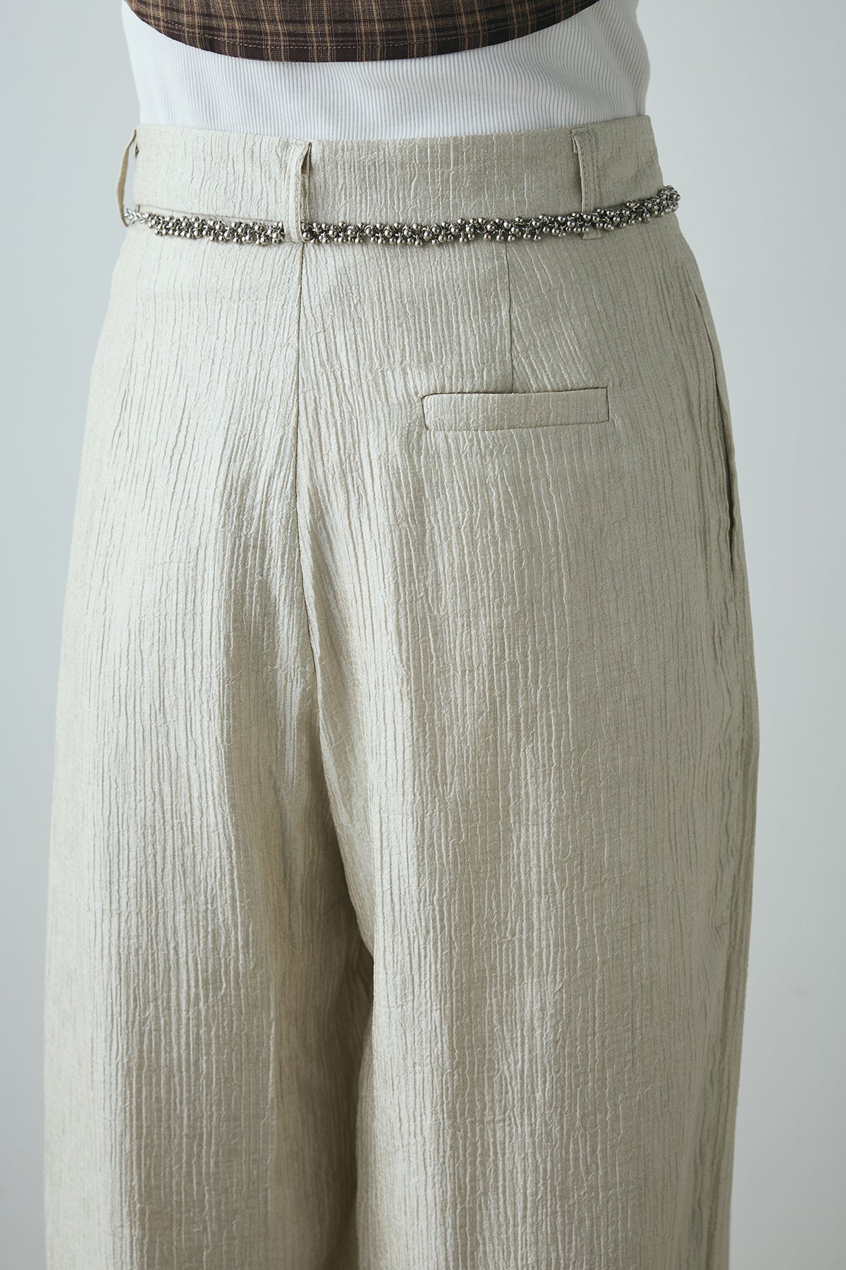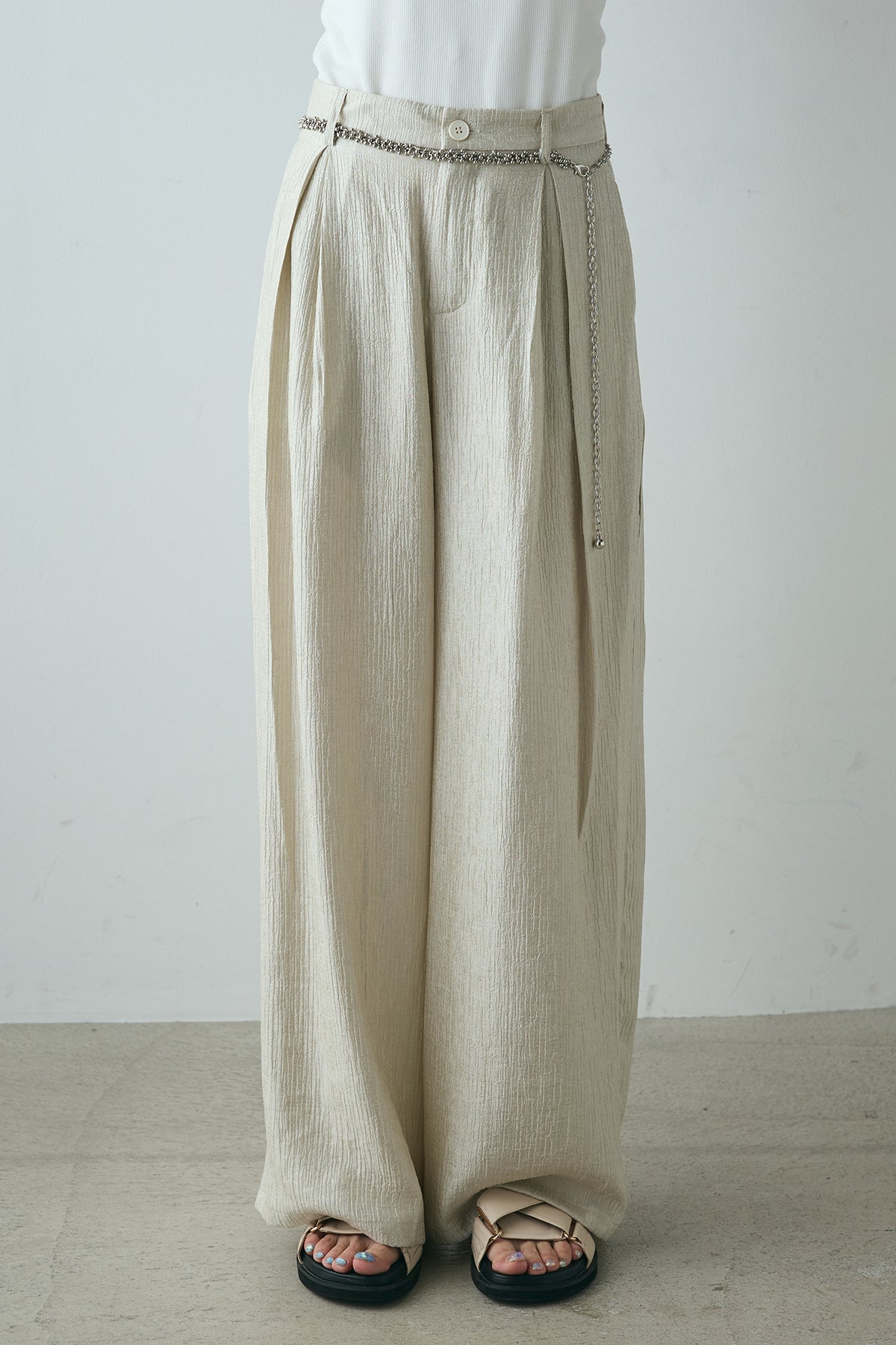 表情のあるワッシャー素材に、さりげないエッジを添えるシルバーチェーンが印象的な一本。動くたびに揺れるディテールが、スタイリングに個性と軽やかさをプラスします。ほどよくゆとりのあるストレートシルエットで、ラフながらもスタイリッシュな印象に。柔らかなカラーが抜け感を演出し、シンプルなトップスと合わせるだけでこなれた雰囲気が完成します。