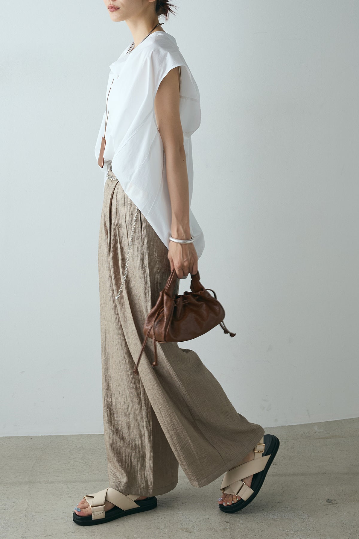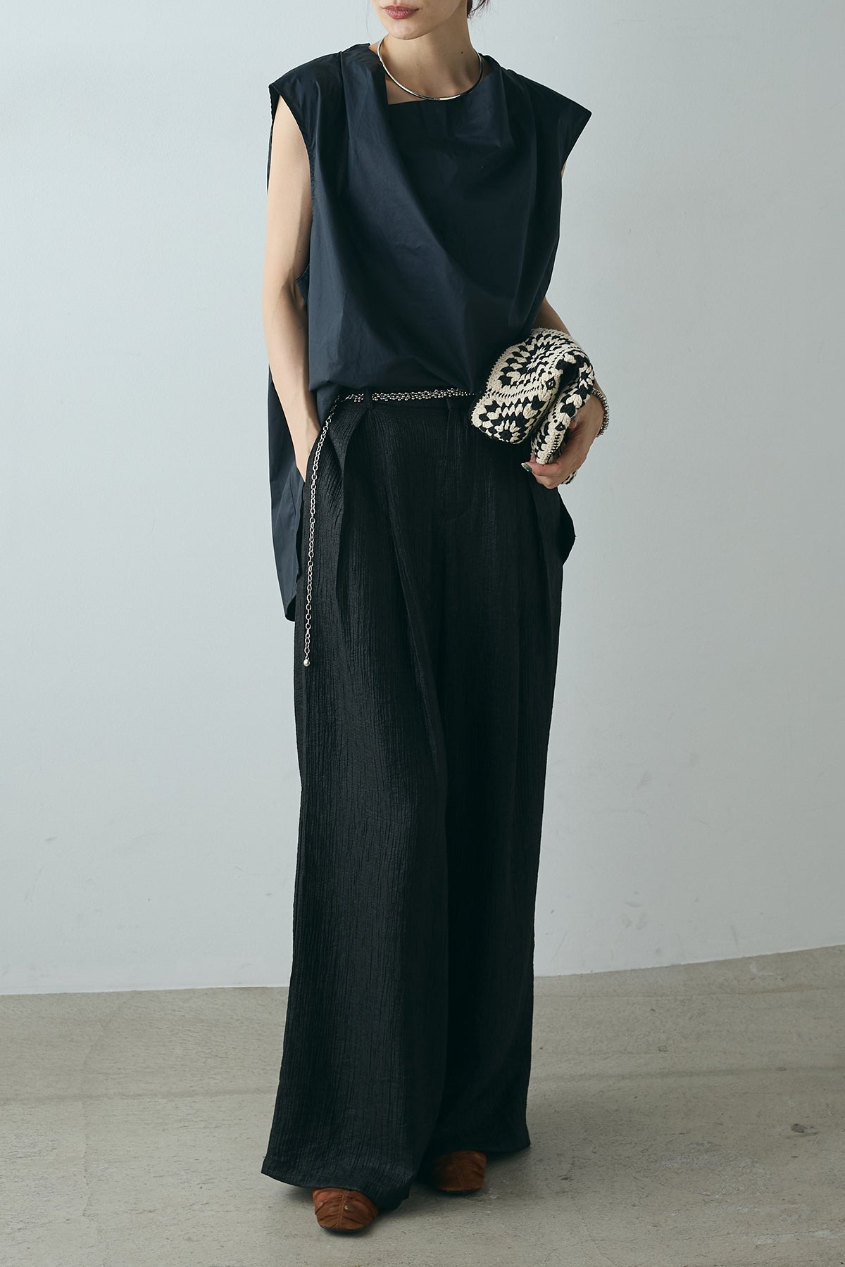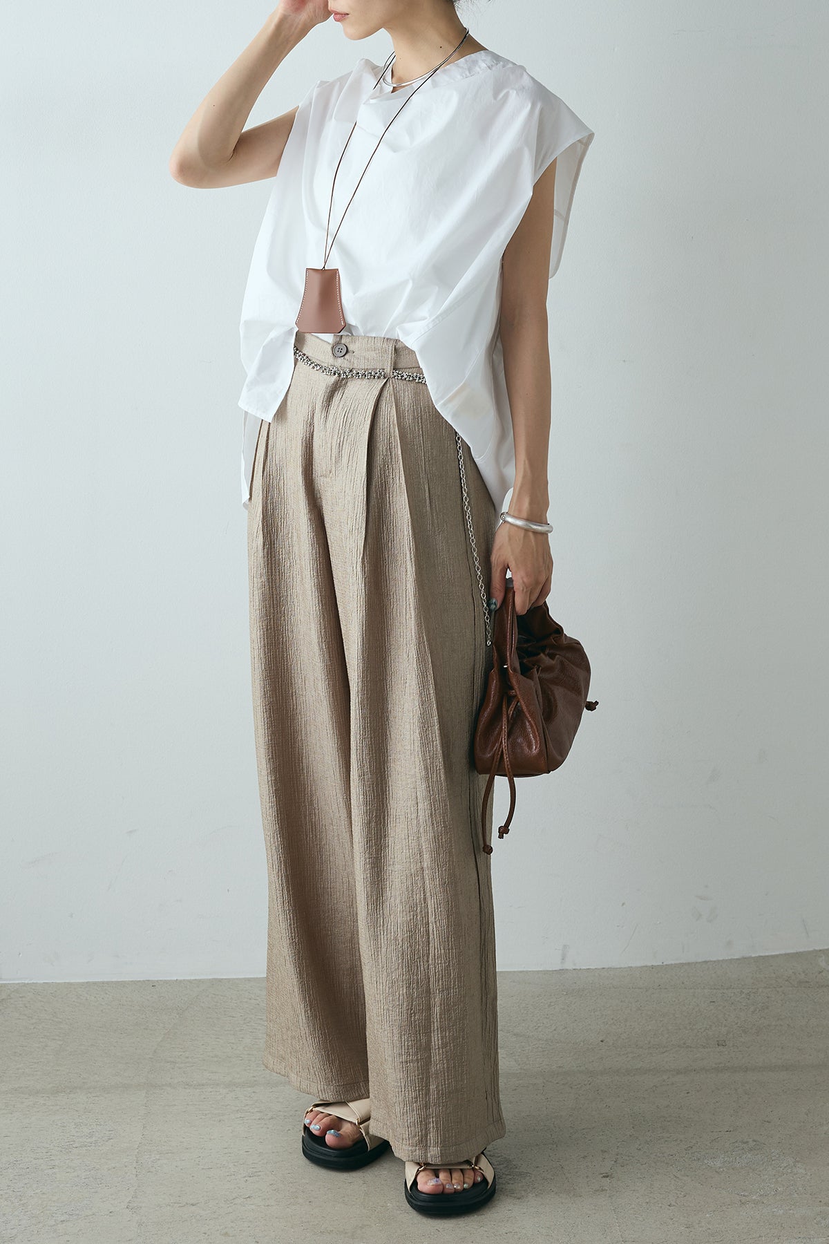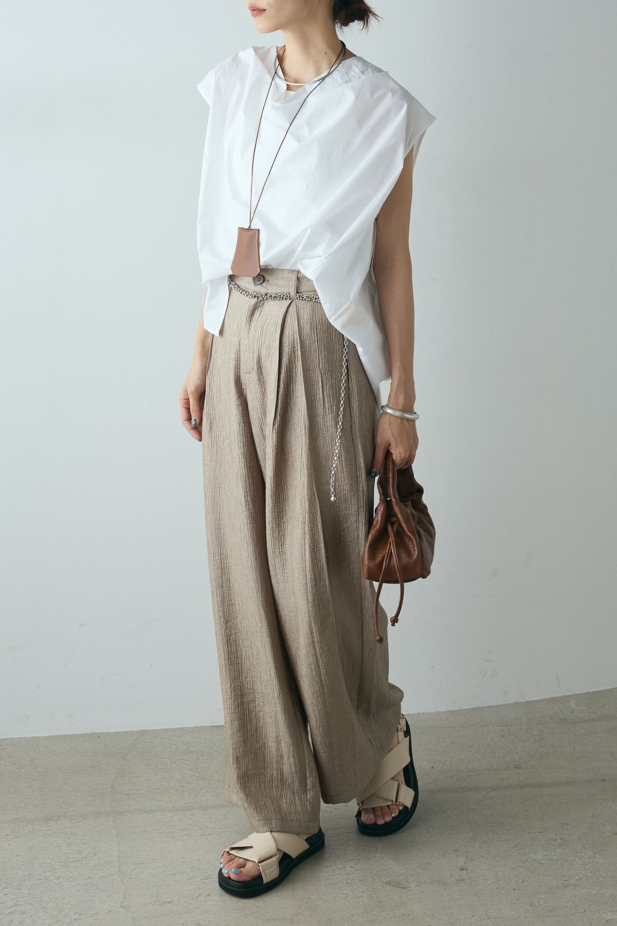 表情のあるワッシャー素材に、さりげないエッジを添えるシルバーチェーンが印象的な一本。動くたびに揺れるディテールが、スタイリングに個性と軽やかさをプラスします。ほどよくゆとりのあるストレートシルエットで、ラフながらもスタイリッシュな印象に。柔らかなカラーが抜け感を演出し、シンプルなトップスと合わせるだけでこなれた雰囲気が完成します。
