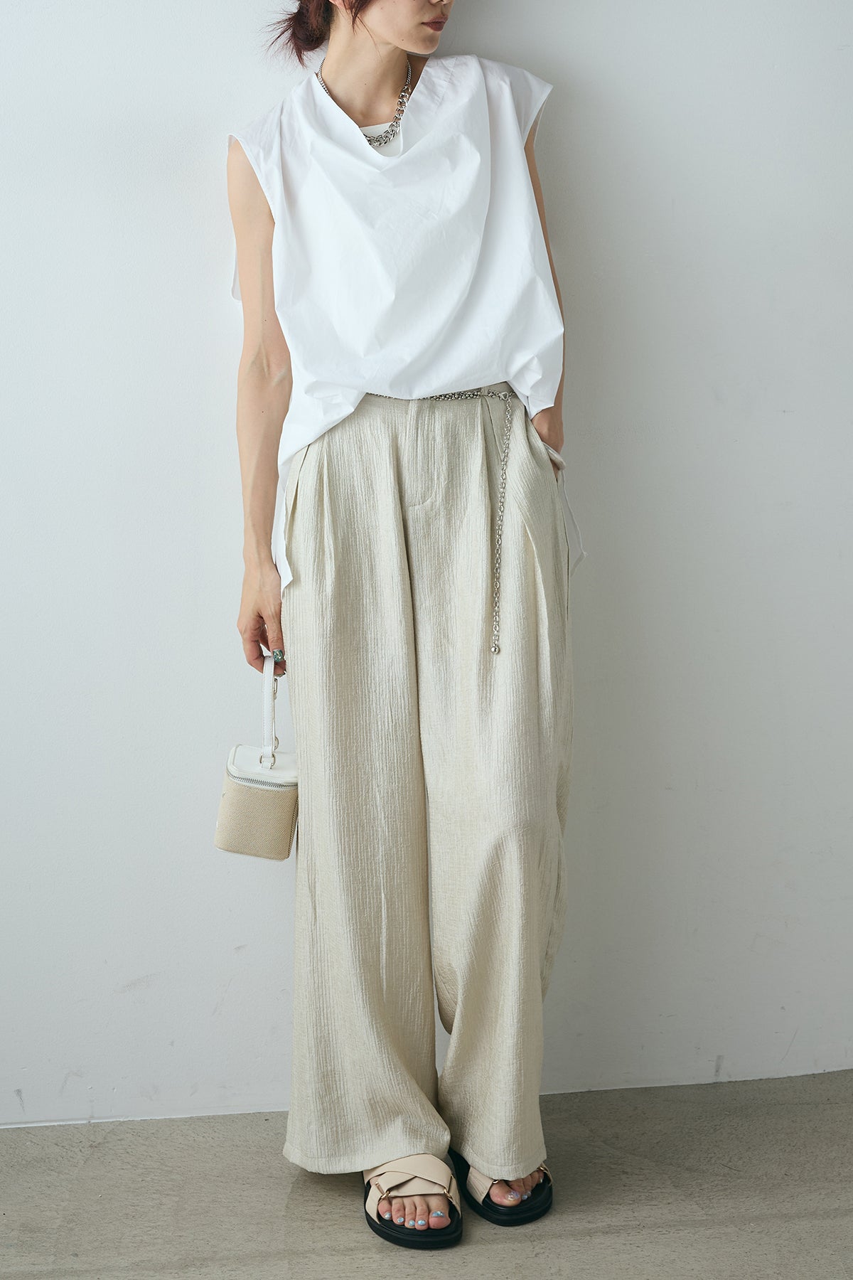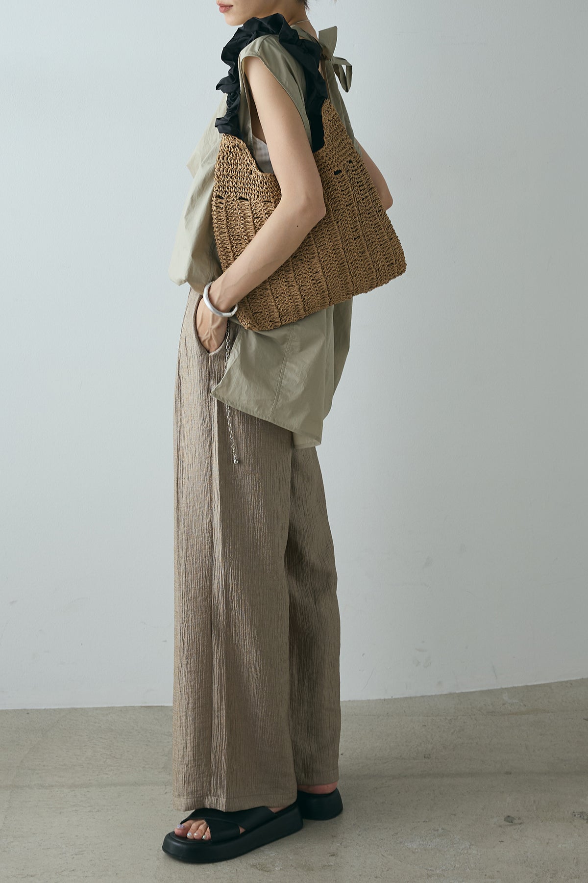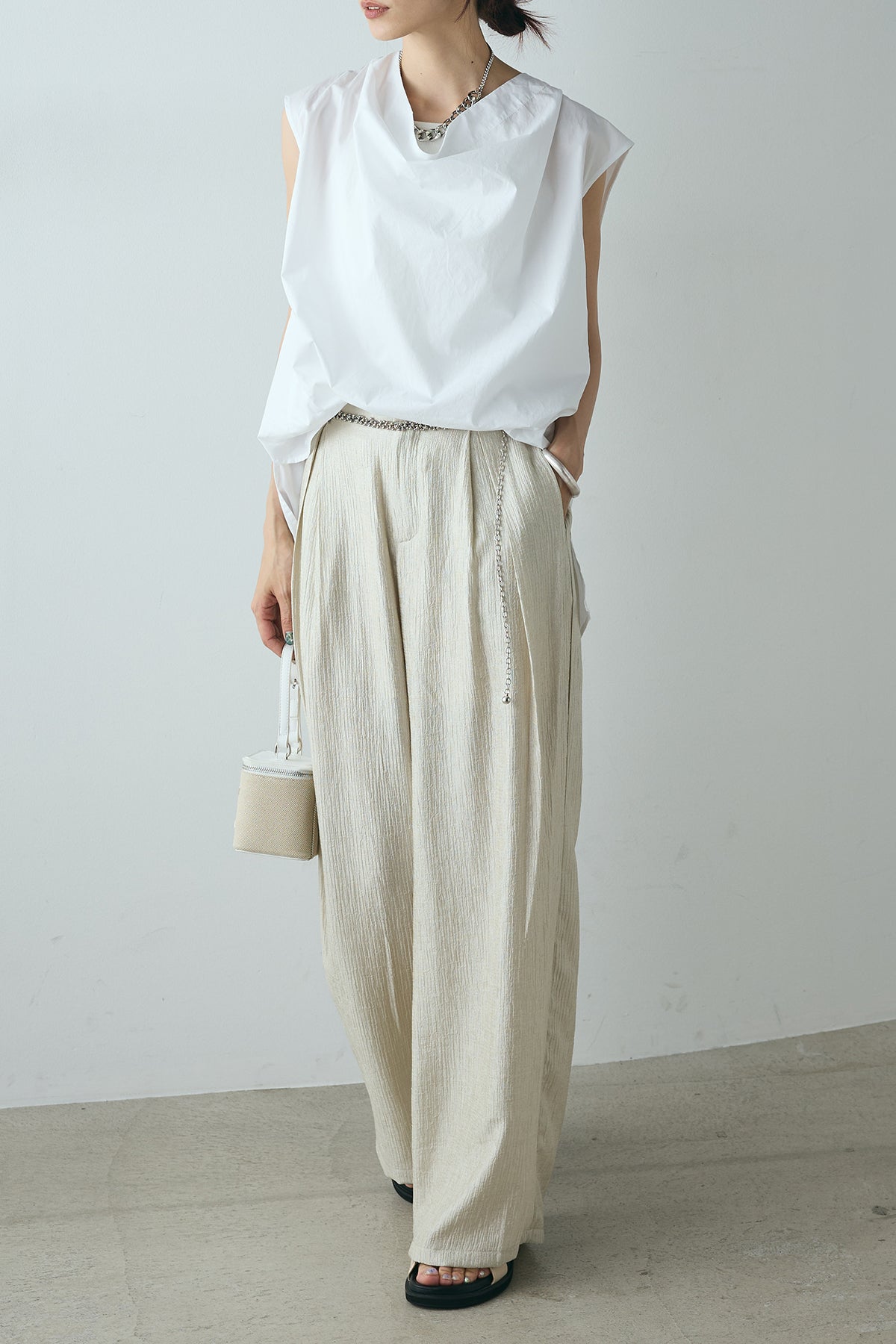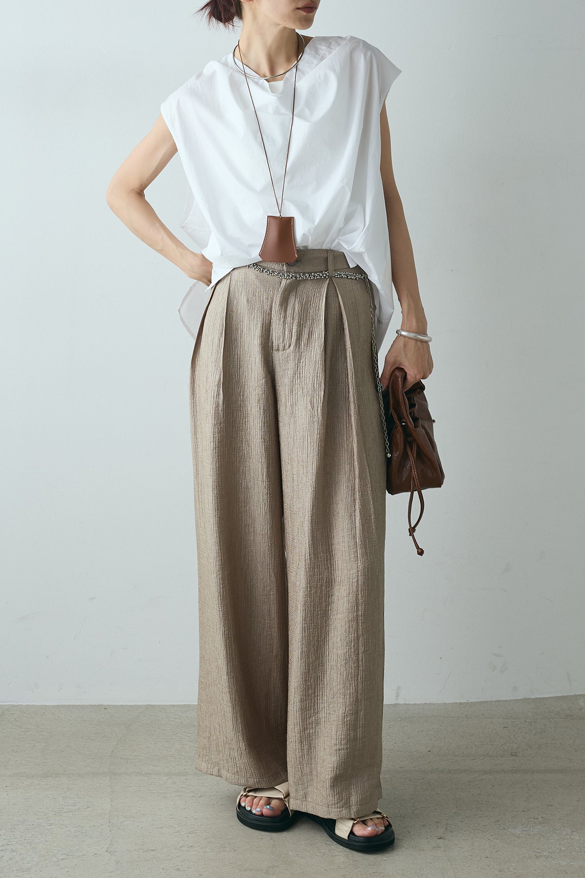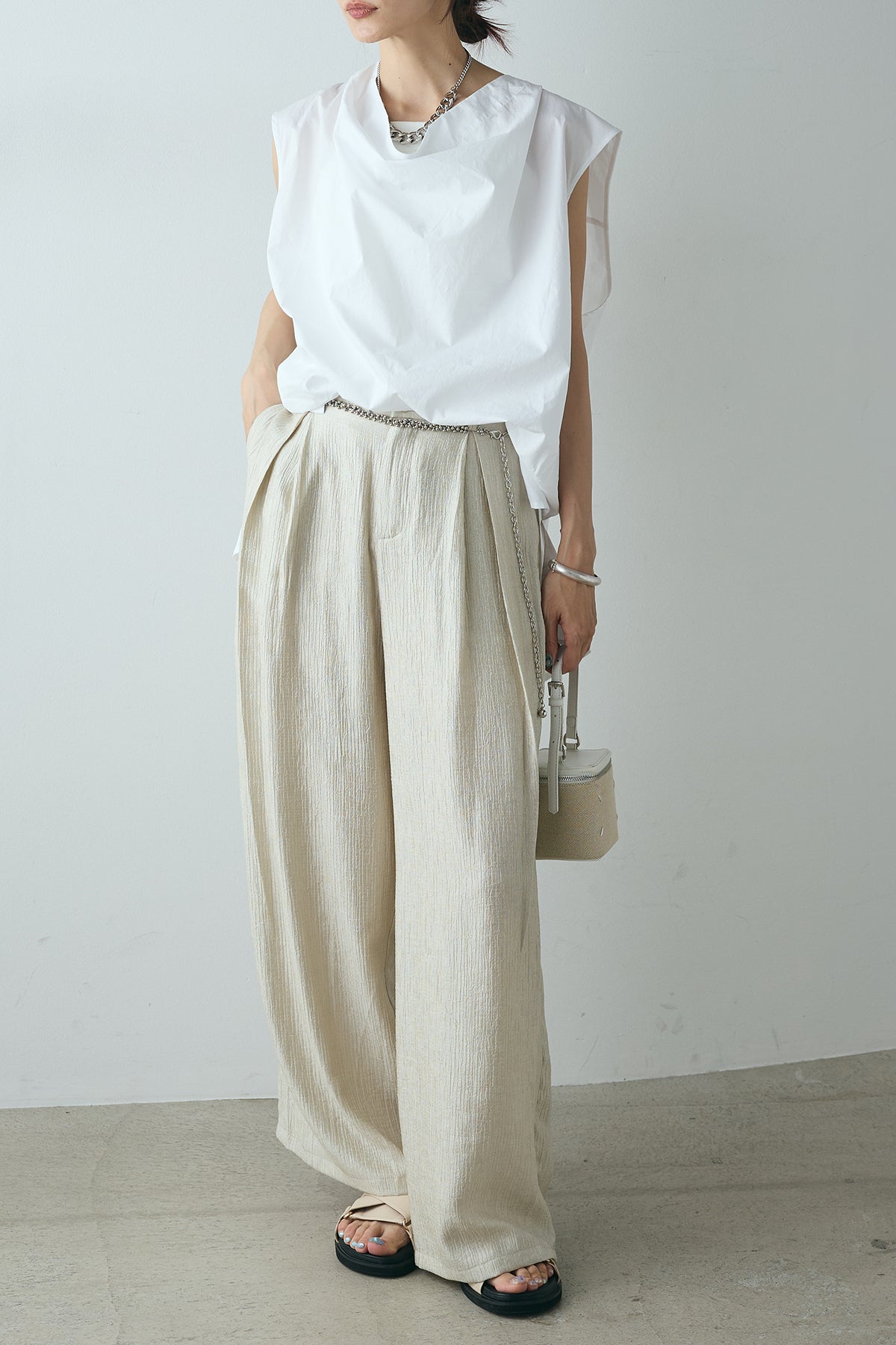 表情のあるワッシャー素材に、さりげないエッジを添えるシルバーチェーンが印象的な一本。動くたびに揺れるディテールが、スタイリングに個性と軽やかさをプラスします。ほどよくゆとりのあるストレートシルエットで、ラフながらもスタイリッシュな印象に。柔らかなカラーが抜け感を演出し、シンプルなトップスと合わせるだけでこなれた雰囲気が完成します。