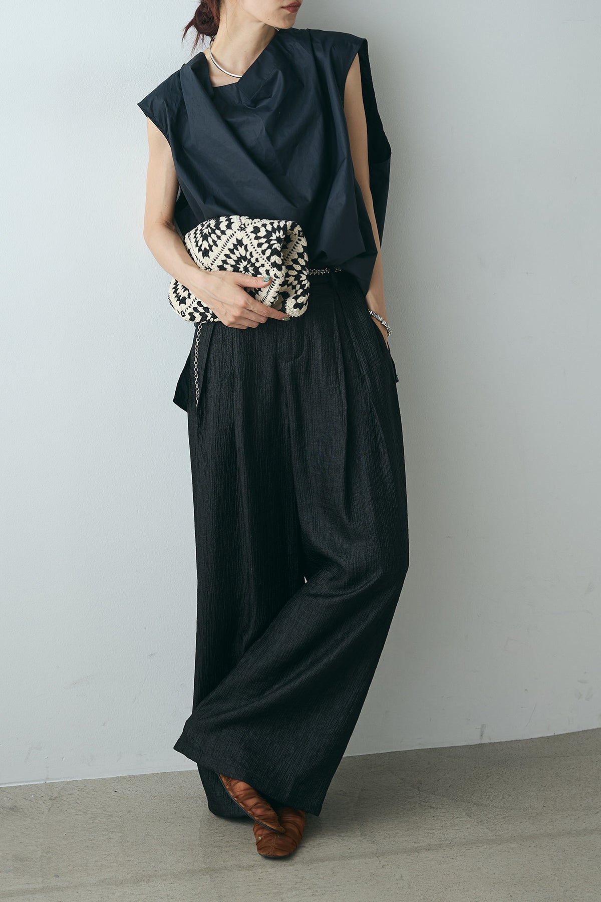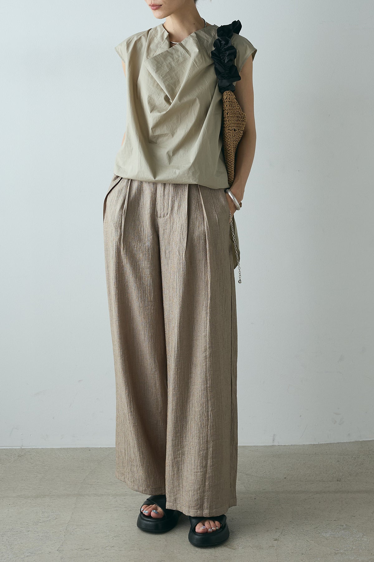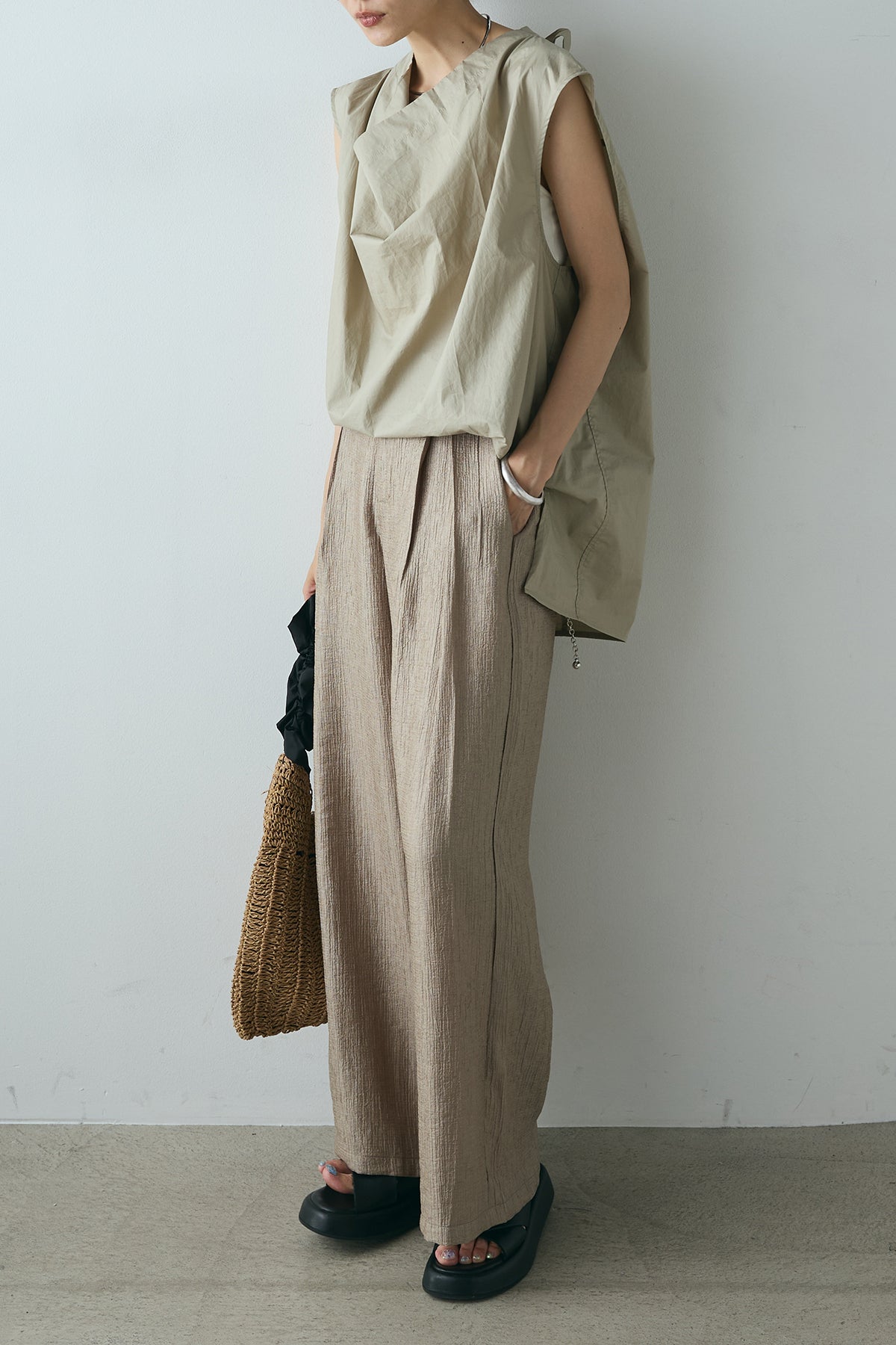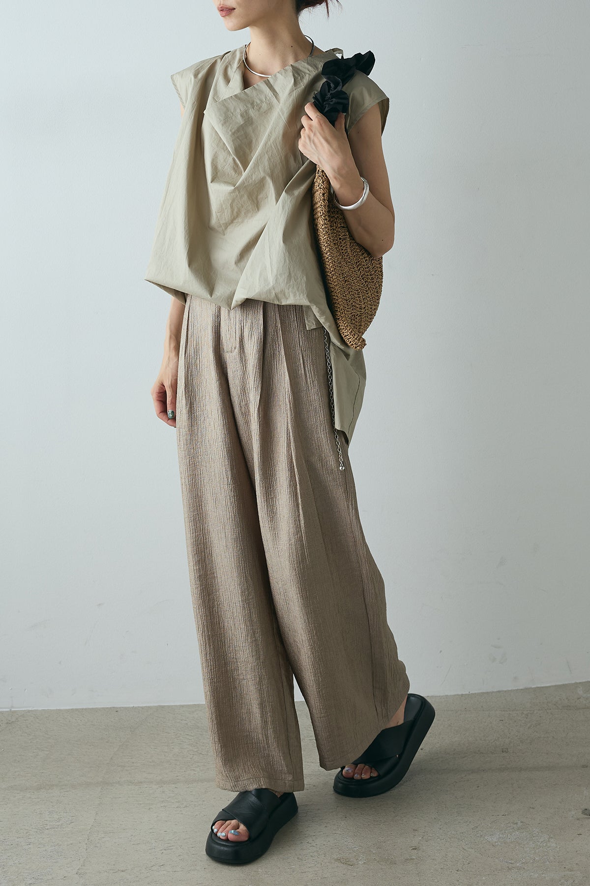 表情のあるワッシャー素材に、さりげないエッジを添えるシルバーチェーンが印象的な一本。動くたびに揺れるディテールが、スタイリングに個性と軽やかさをプラスします。ほどよくゆとりのあるストレートシルエットで、ラフながらもスタイリッシュな印象に。柔らかなカラーが抜け感を演出し、シンプルなトップスと合わせるだけでこなれた雰囲気が完成します。