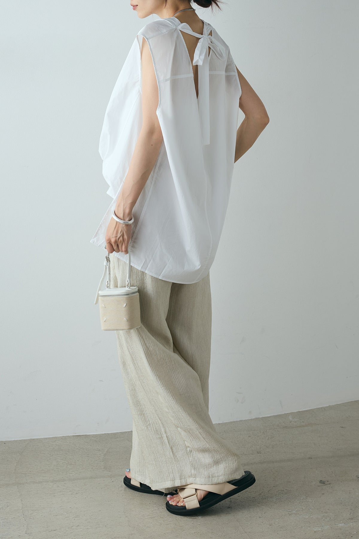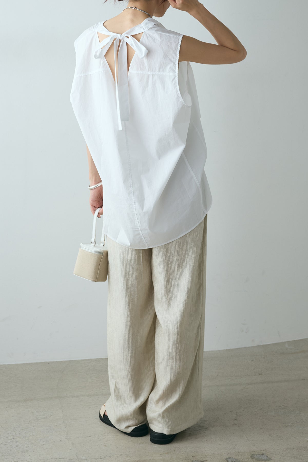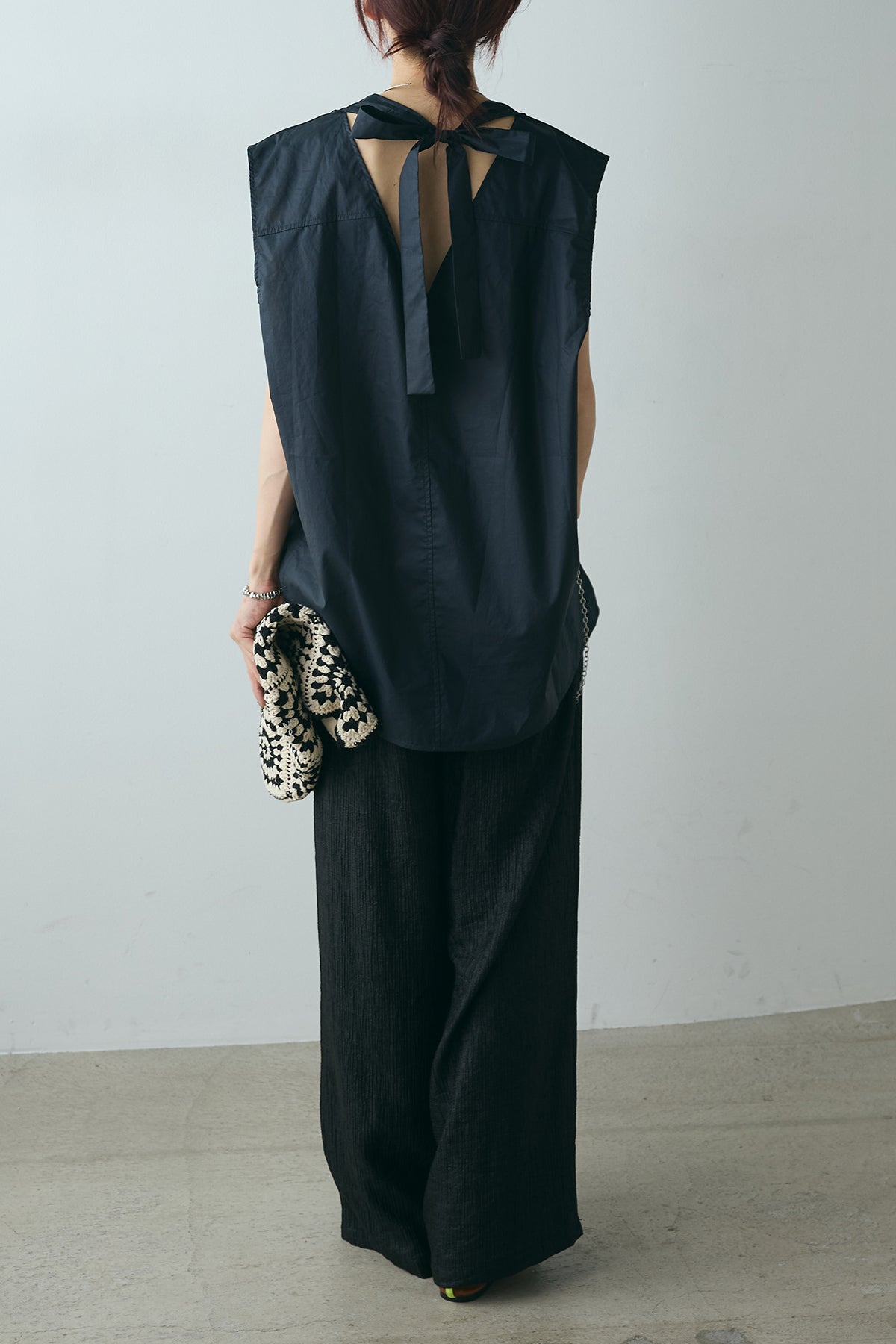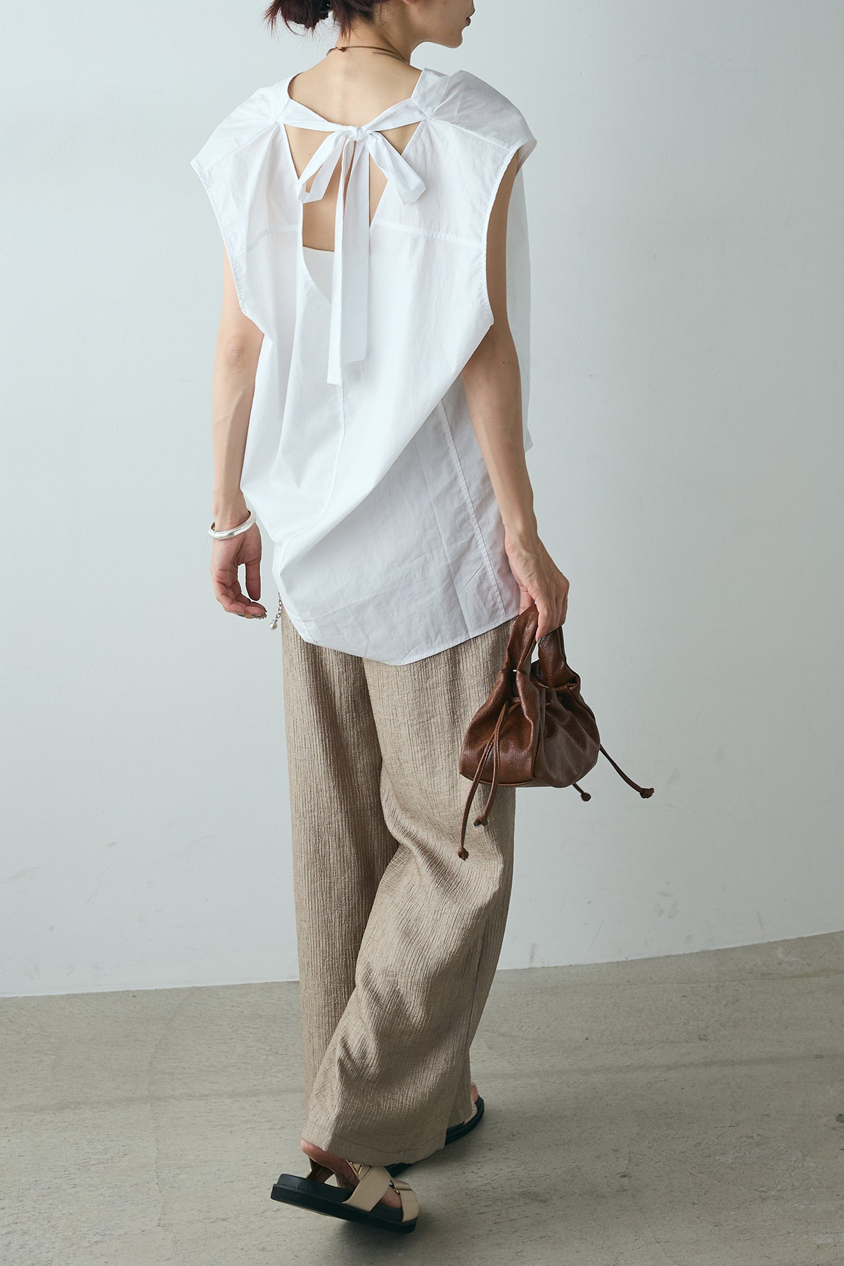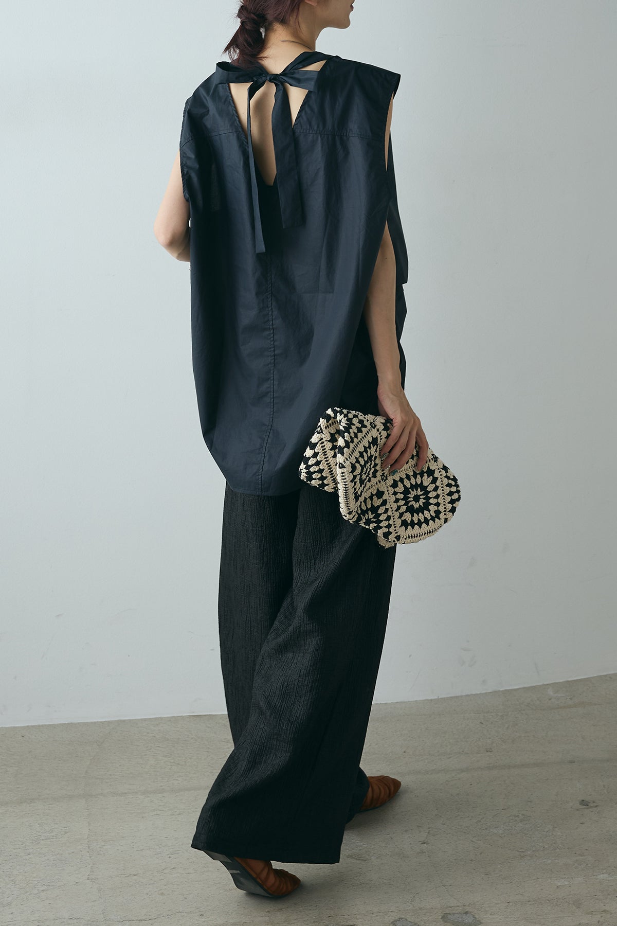背中のバックオープンデザインが抜け感を演出するノースリーブトップス。程よいゆとりのあるストレートシルエットで体のラインを拾いすぎず、涼しげでリラクシーな着心地を実現。軽やかな素材感と洗練されたデザインが女性らしさを引き立て、幅広いシーンで活躍します。シンプルながらも華奢なディテールが魅力的で、インナーやボトムス次第でカジュアルにもフェミニンにもスタイリング可能。ロングシーズンで着回しやすい一着です。