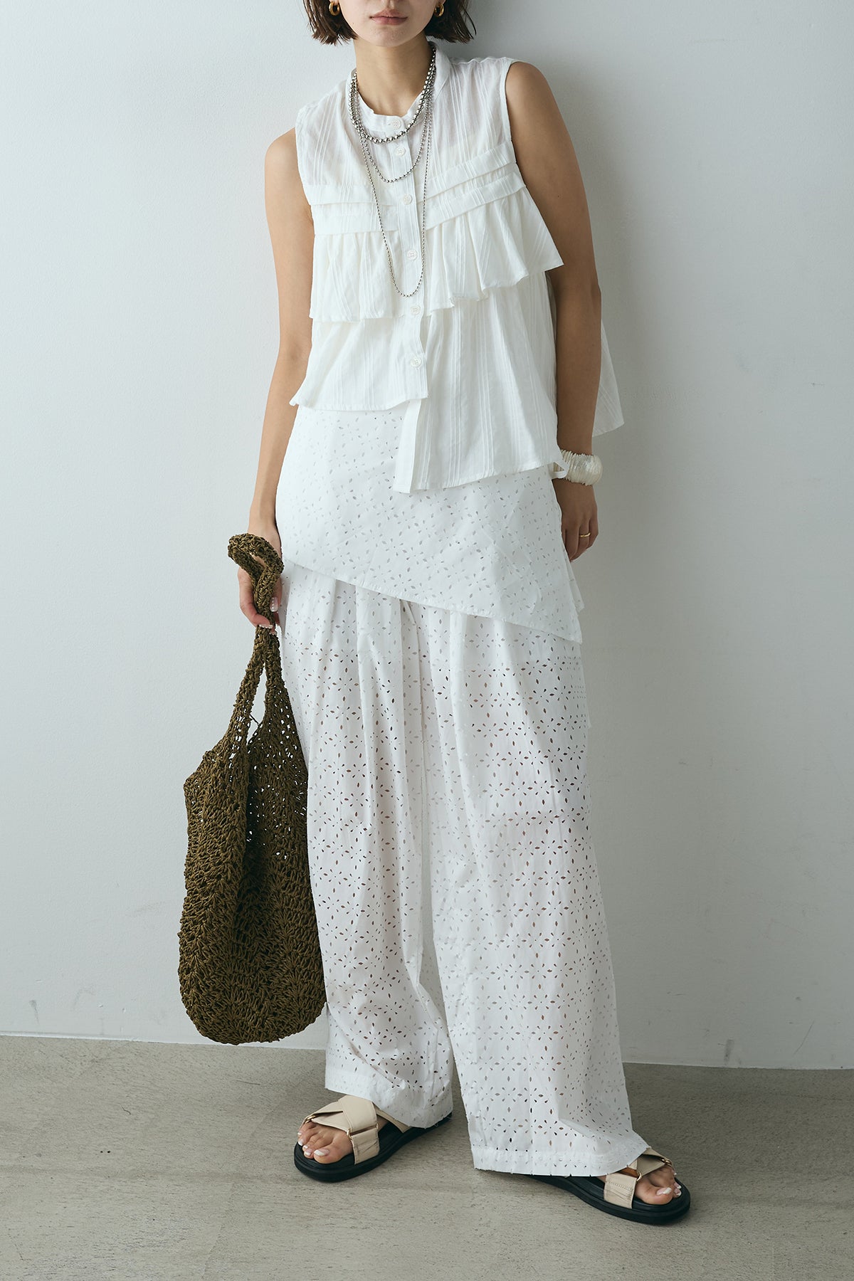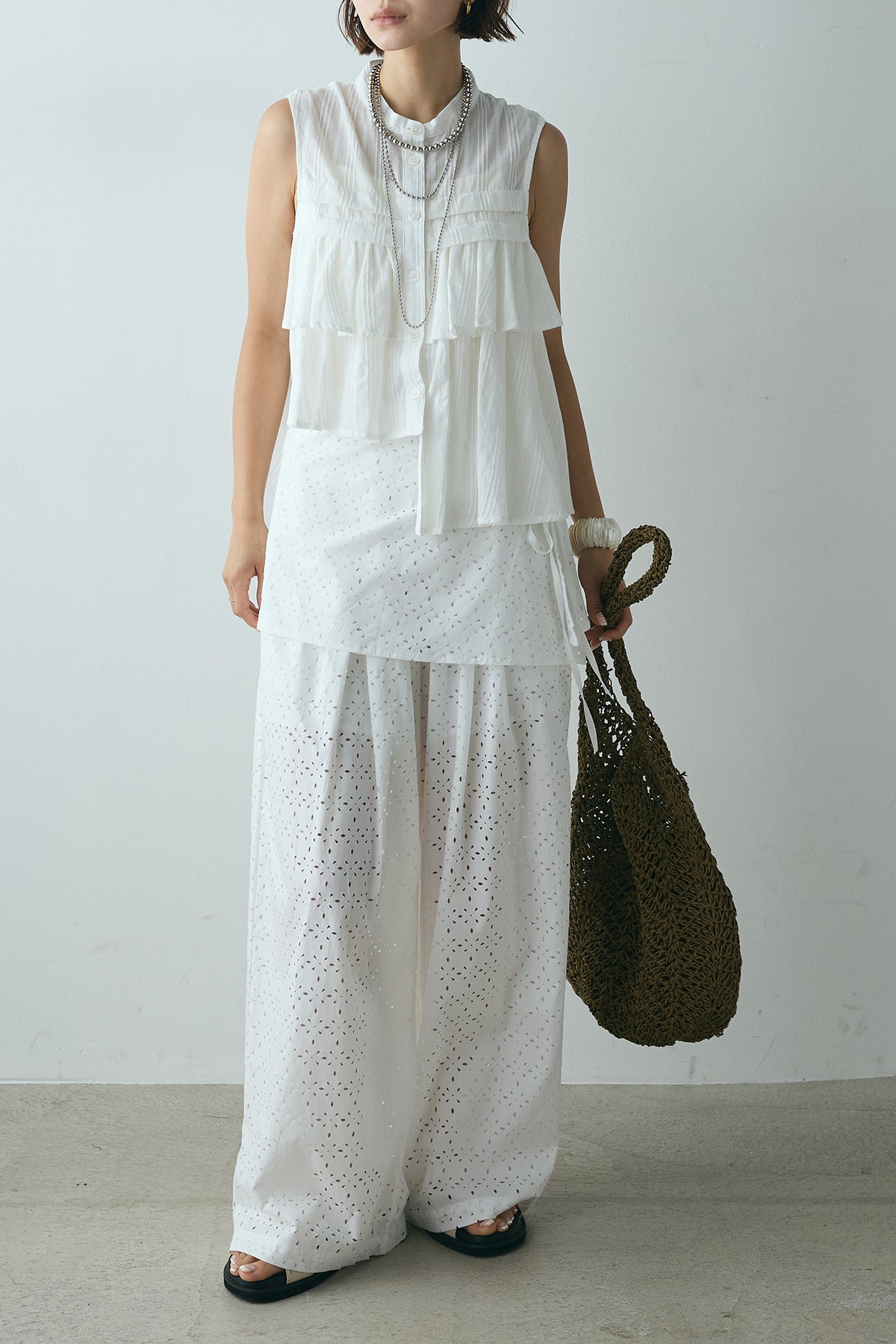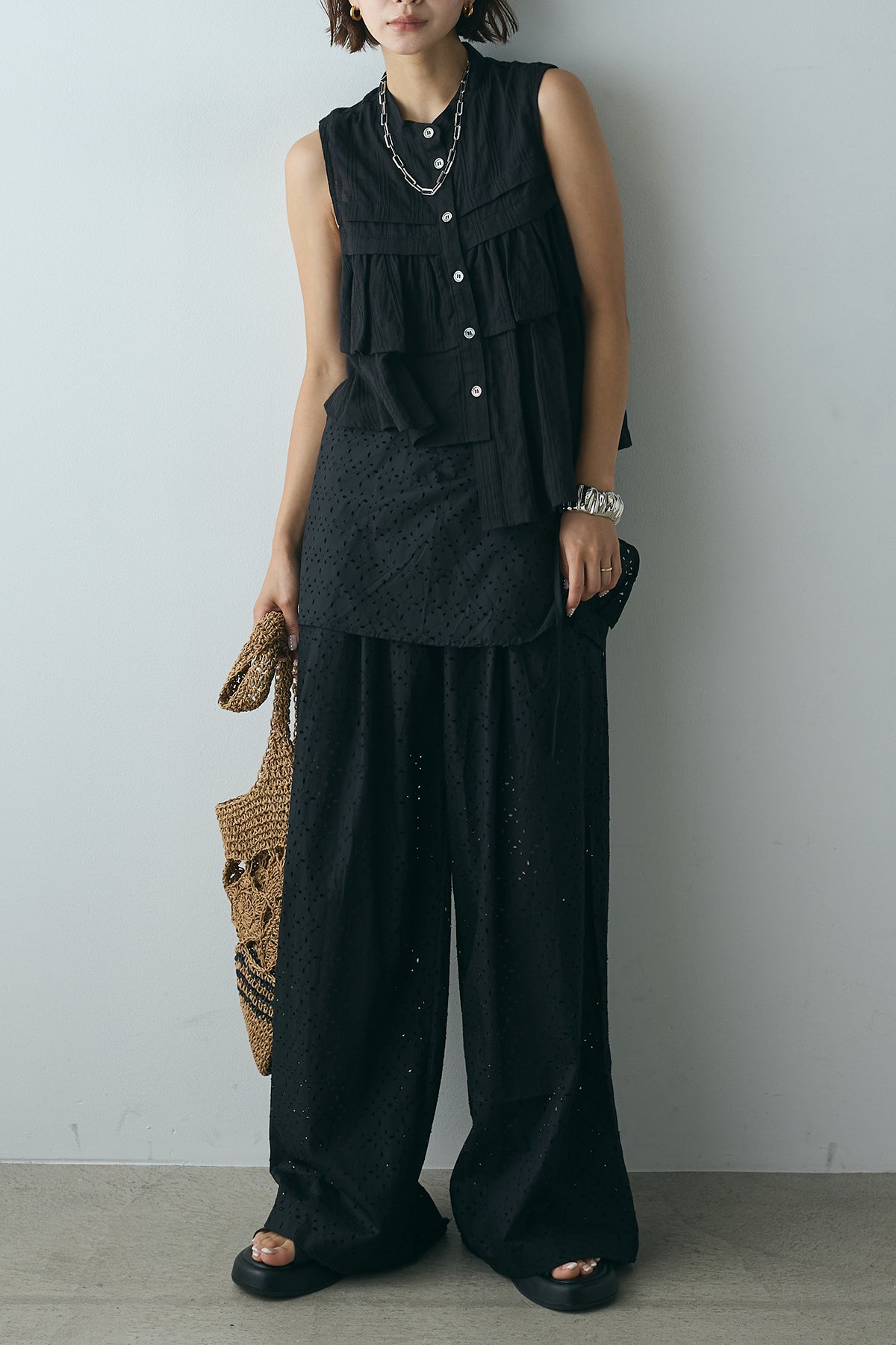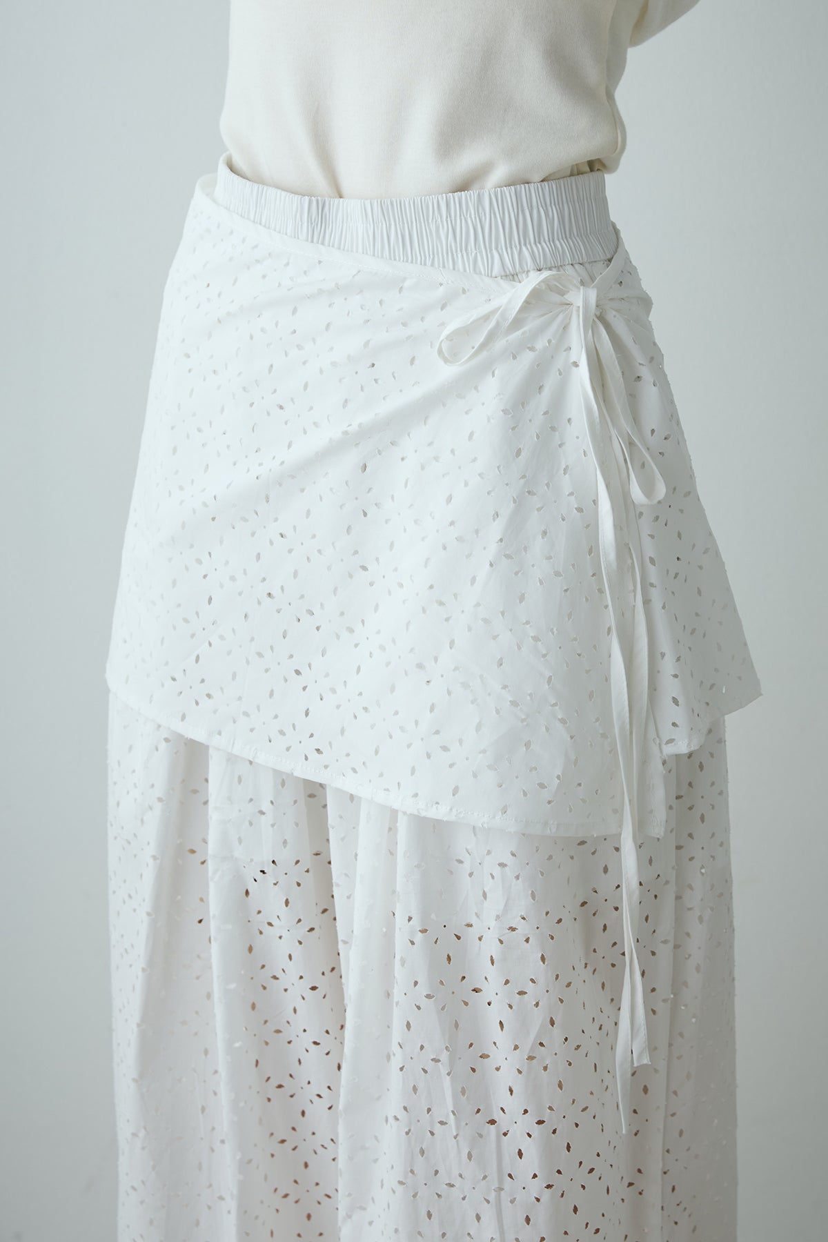 スカートを重ねたようなデザインが印象的なレイヤードワイドパンツ。繊細な透かし柄が軽やかな抜け感を添え、動くたびに揺れるシルエットが魅力。ウエストはゴム仕様でリラクシーな着心地もポイントです。