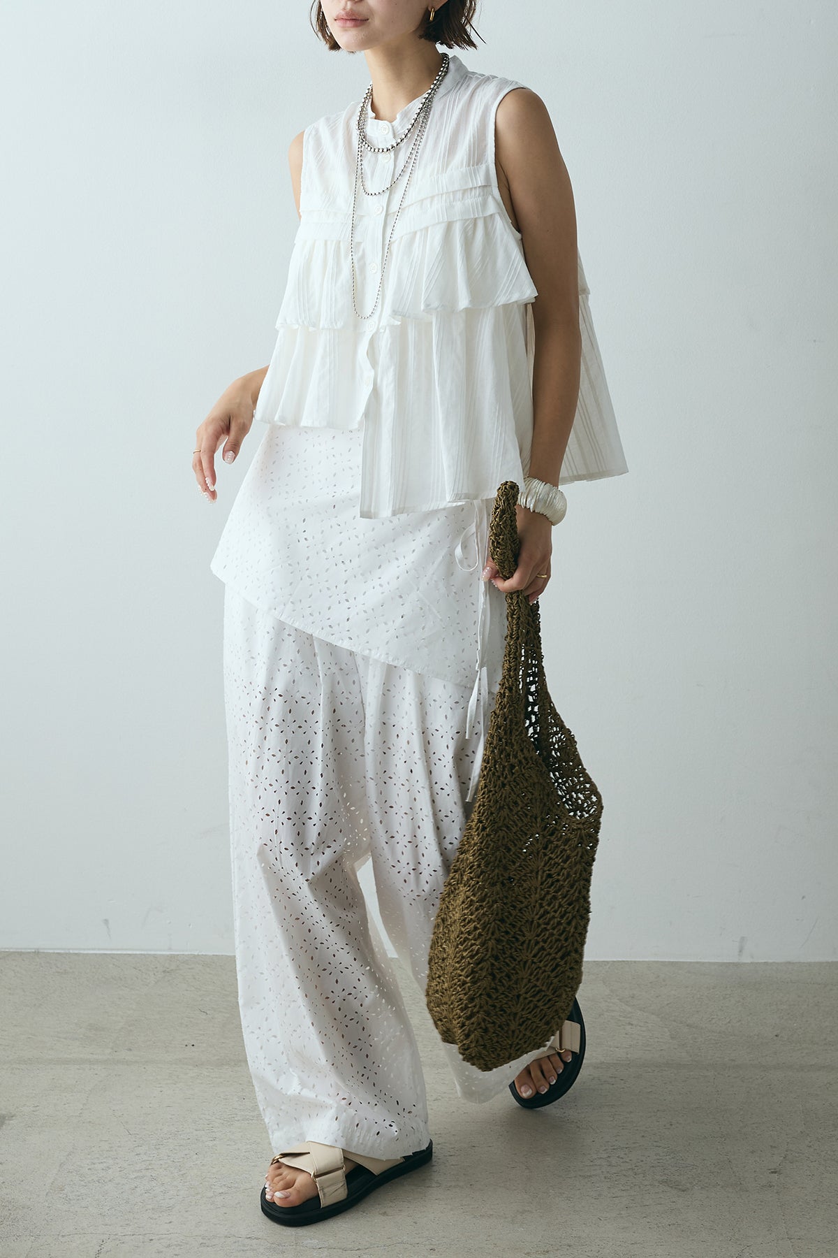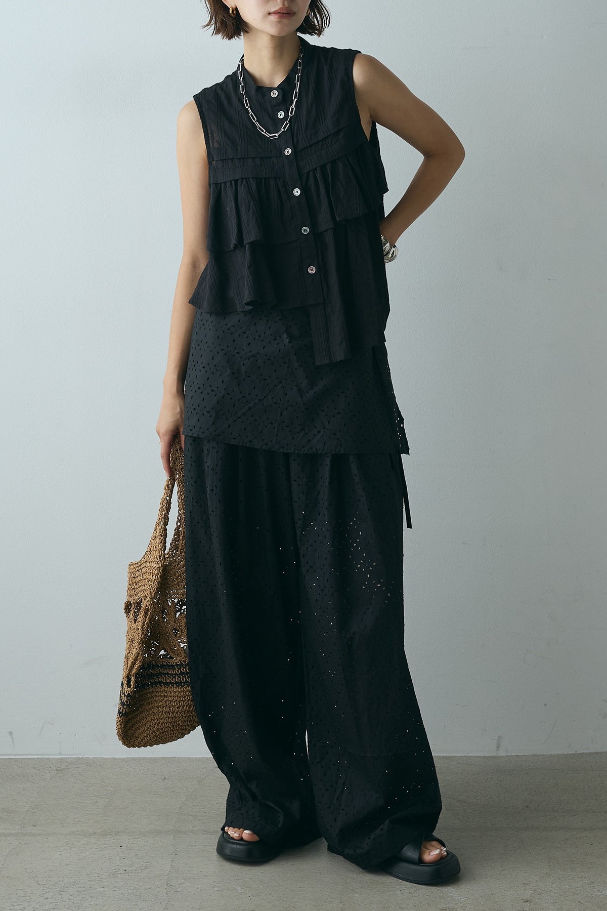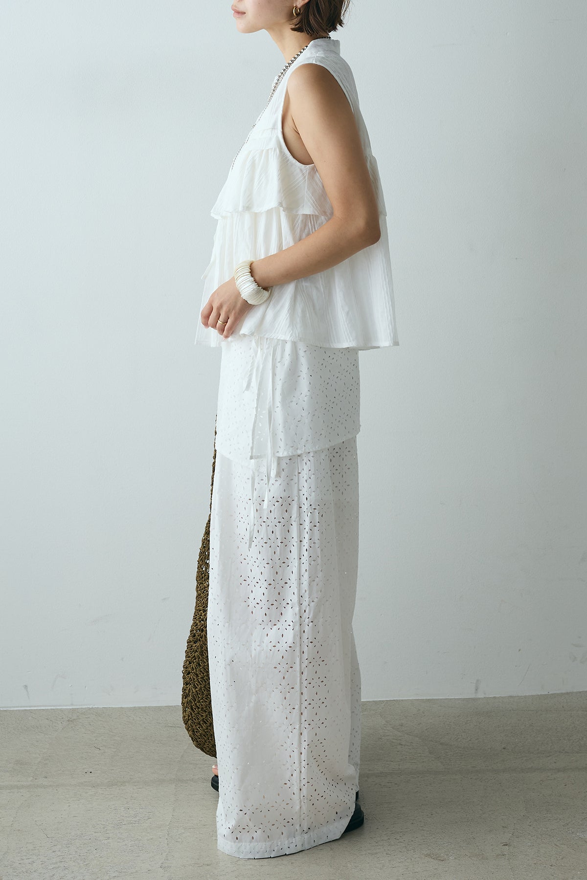 スカートを重ねたようなデザインが印象的なレイヤードワイドパンツ。繊細な透かし柄が軽やかな抜け感を添え、動くたびに揺れるシルエットが魅力。ウエストはゴム仕様でリラクシーな着心地もポイントです。