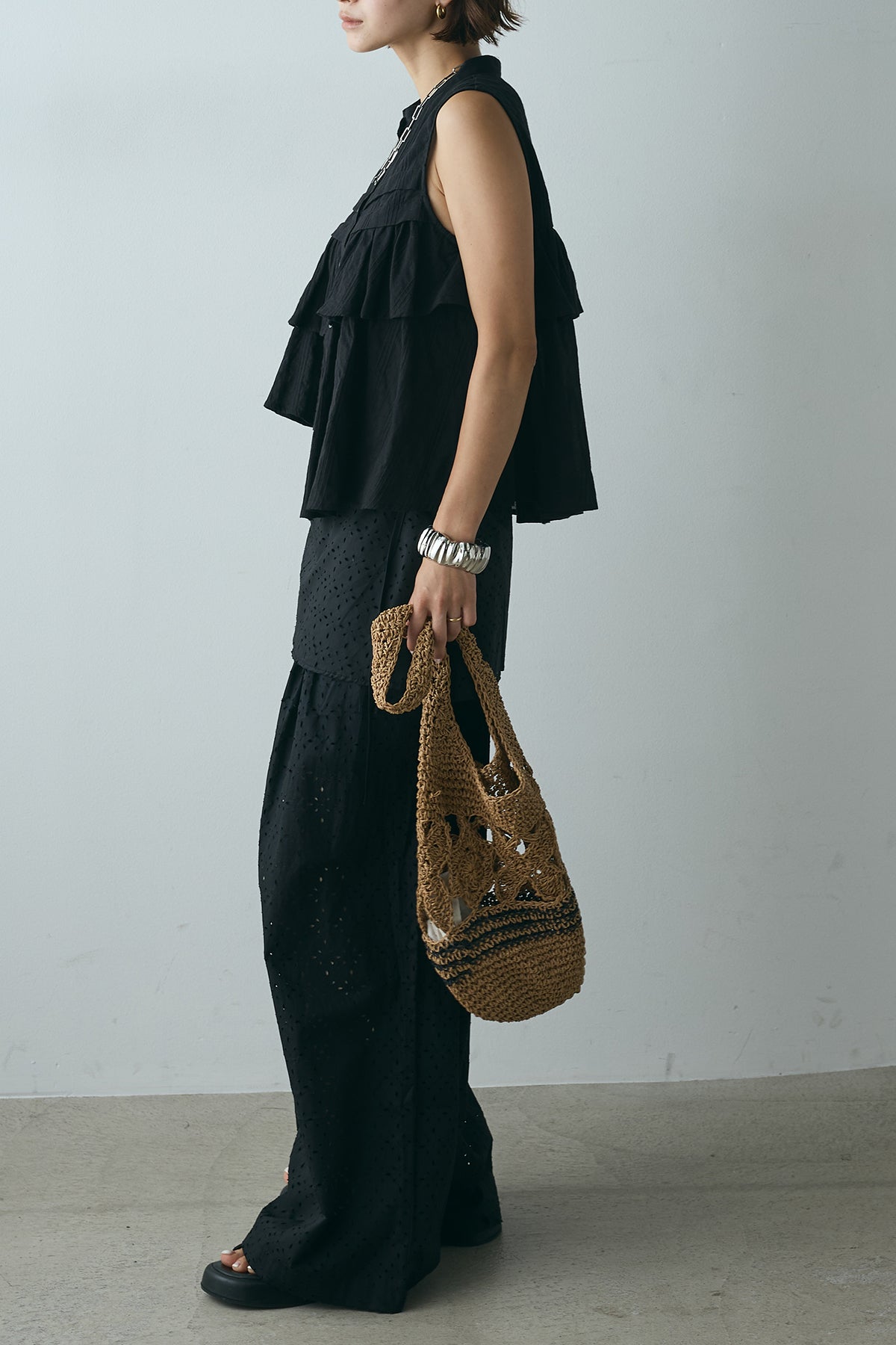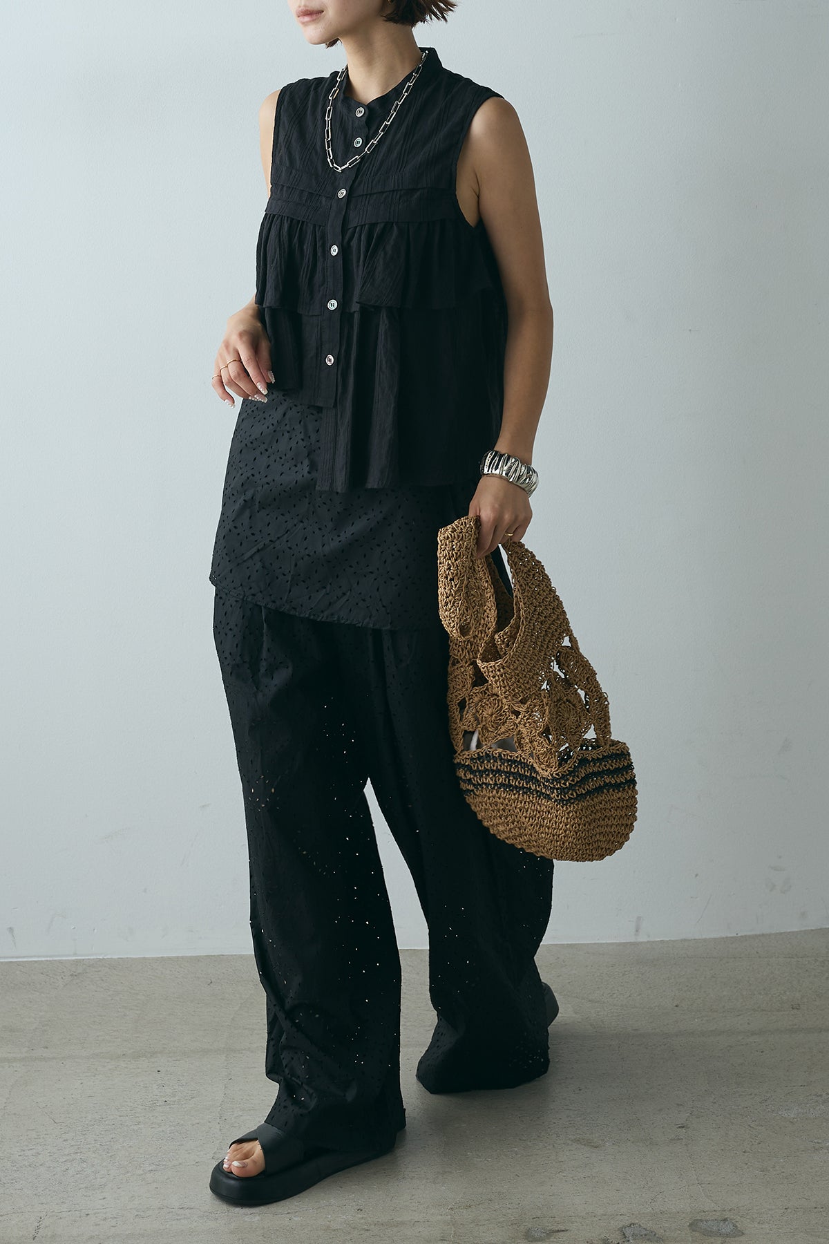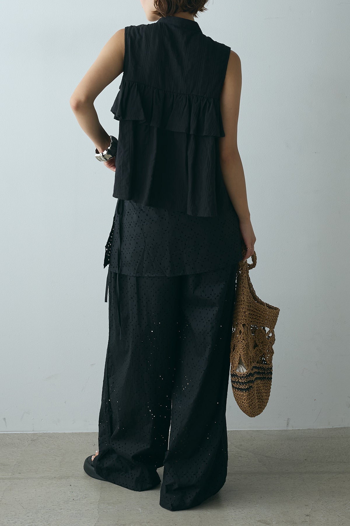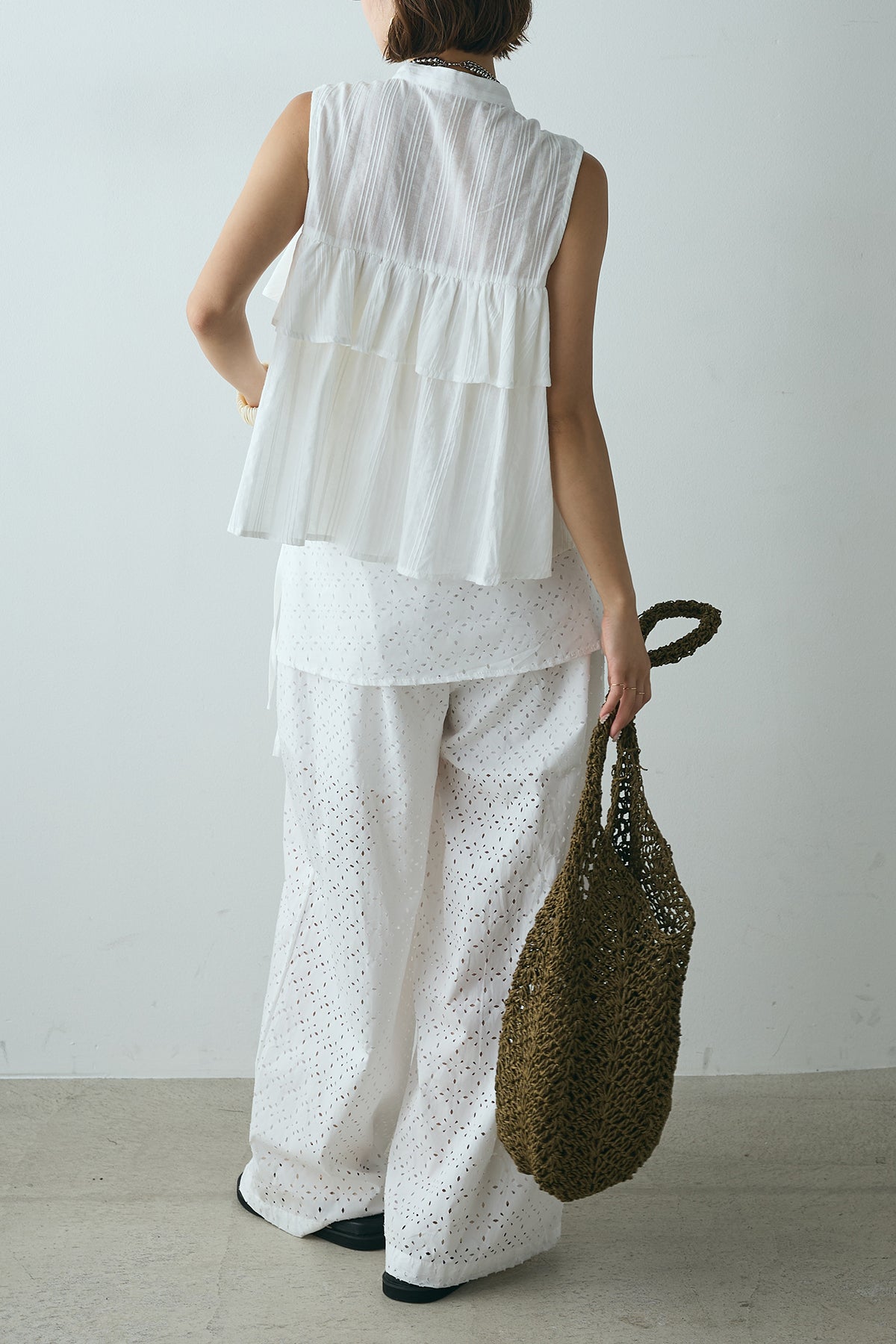 スカートを重ねたようなデザインが印象的なレイヤードワイドパンツ。繊細な透かし柄が軽やかな抜け感を添え、動くたびに揺れるシルエットが魅力。ウエストはゴム仕様でリラクシーな着心地もポイントです。