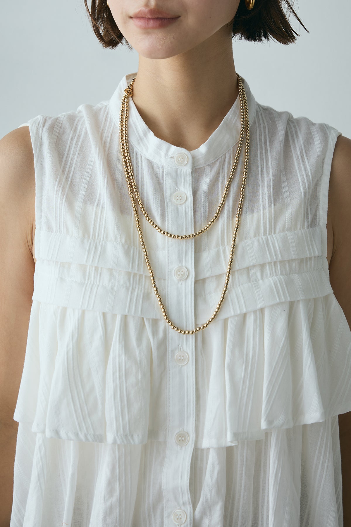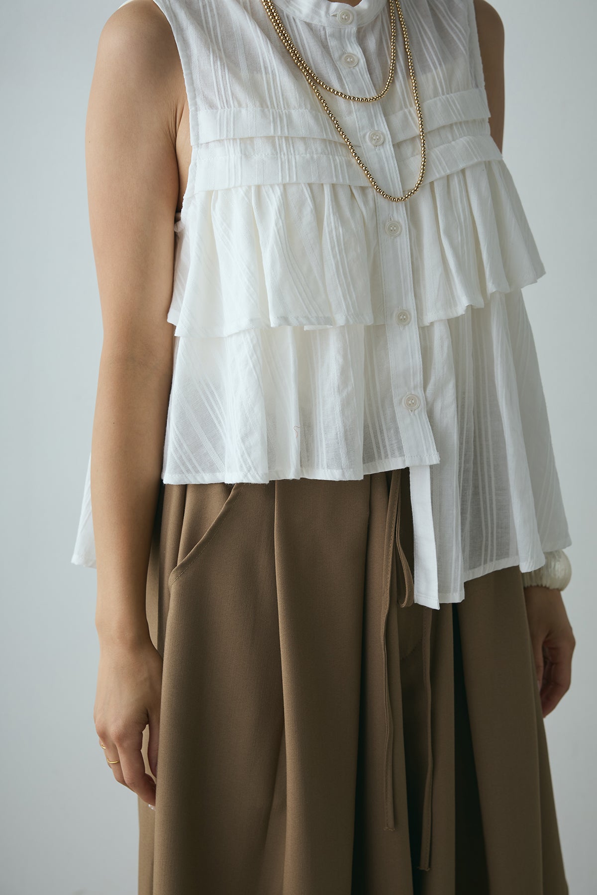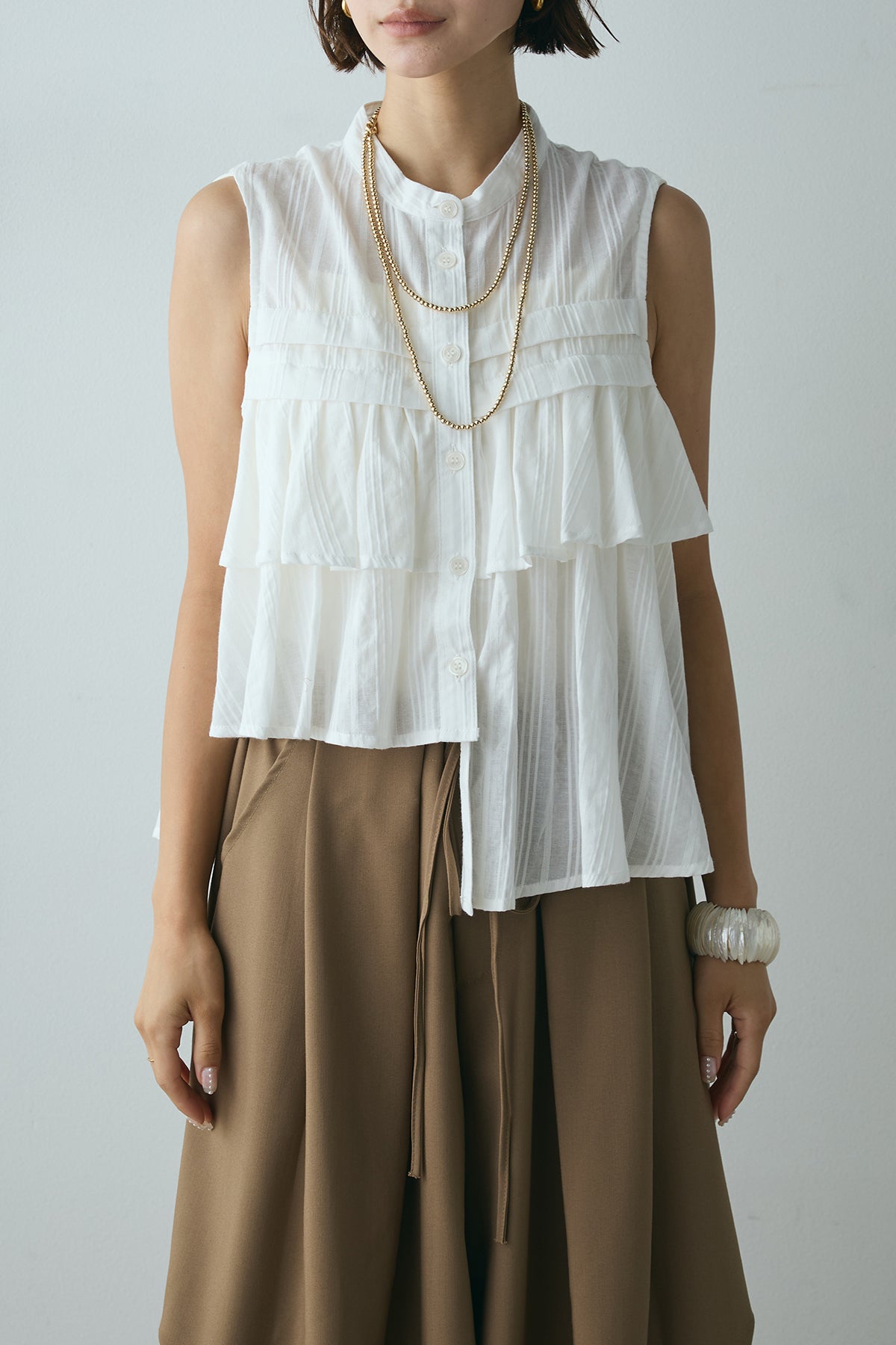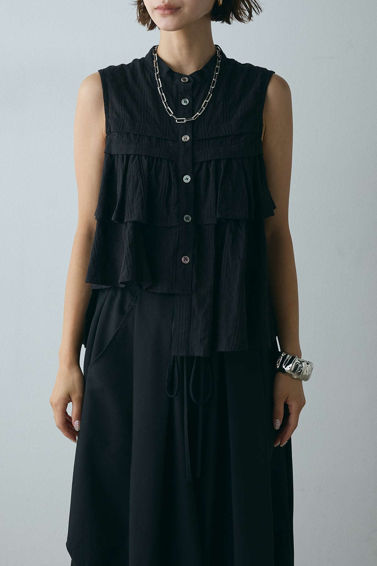 軽やかなドビーストライプ生地にアシンメトリーなフリルデザインをあしらったノースリーブブラウス。ストライプ柄の素材が生み出す独特の立体感と、フリルが動きのある印象を与え、フェミニンながらも洗練された雰囲気を演出します。ボタンで開閉可能なデザインで、カジュアルから少しドレッシーなシーンまで幅広く活躍するアイテムです。
