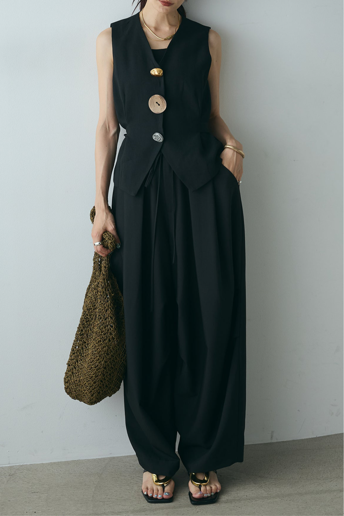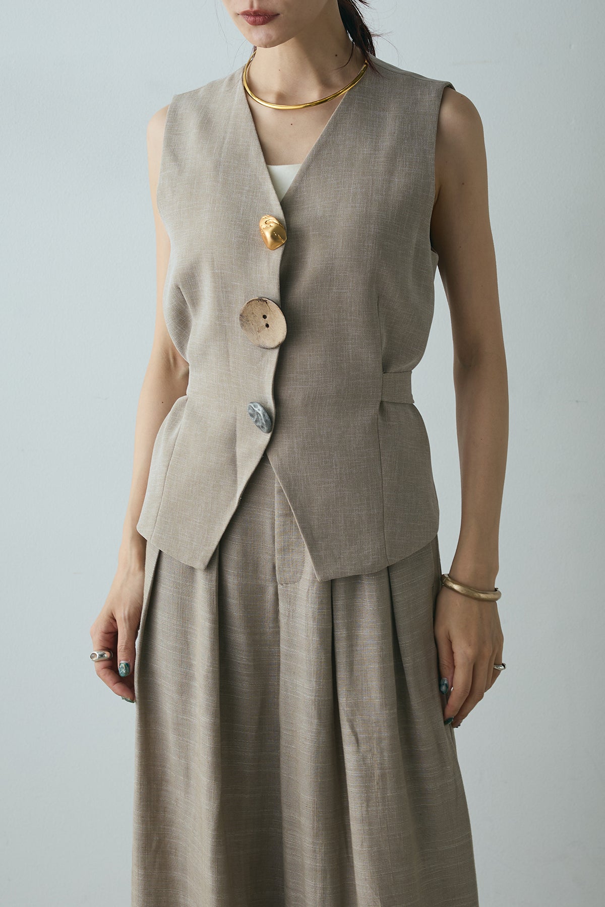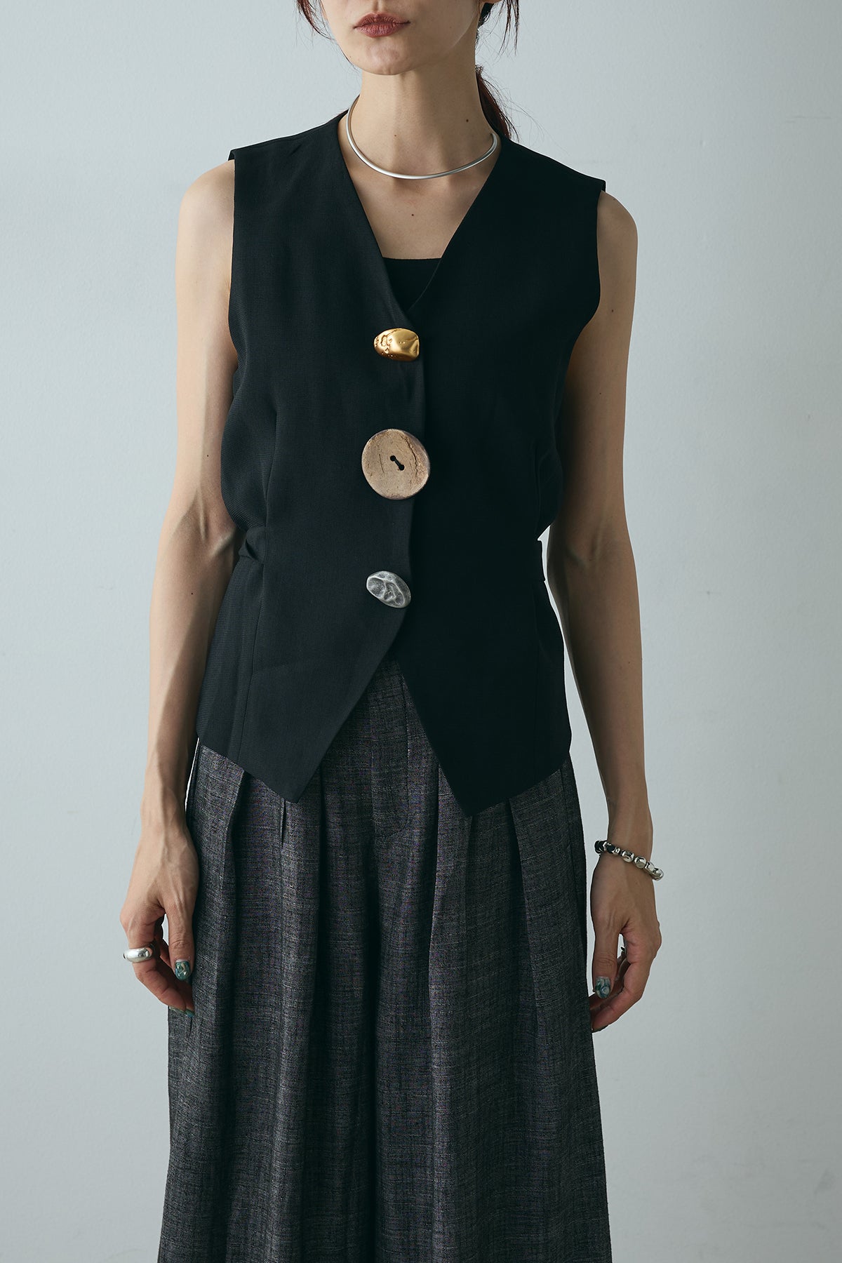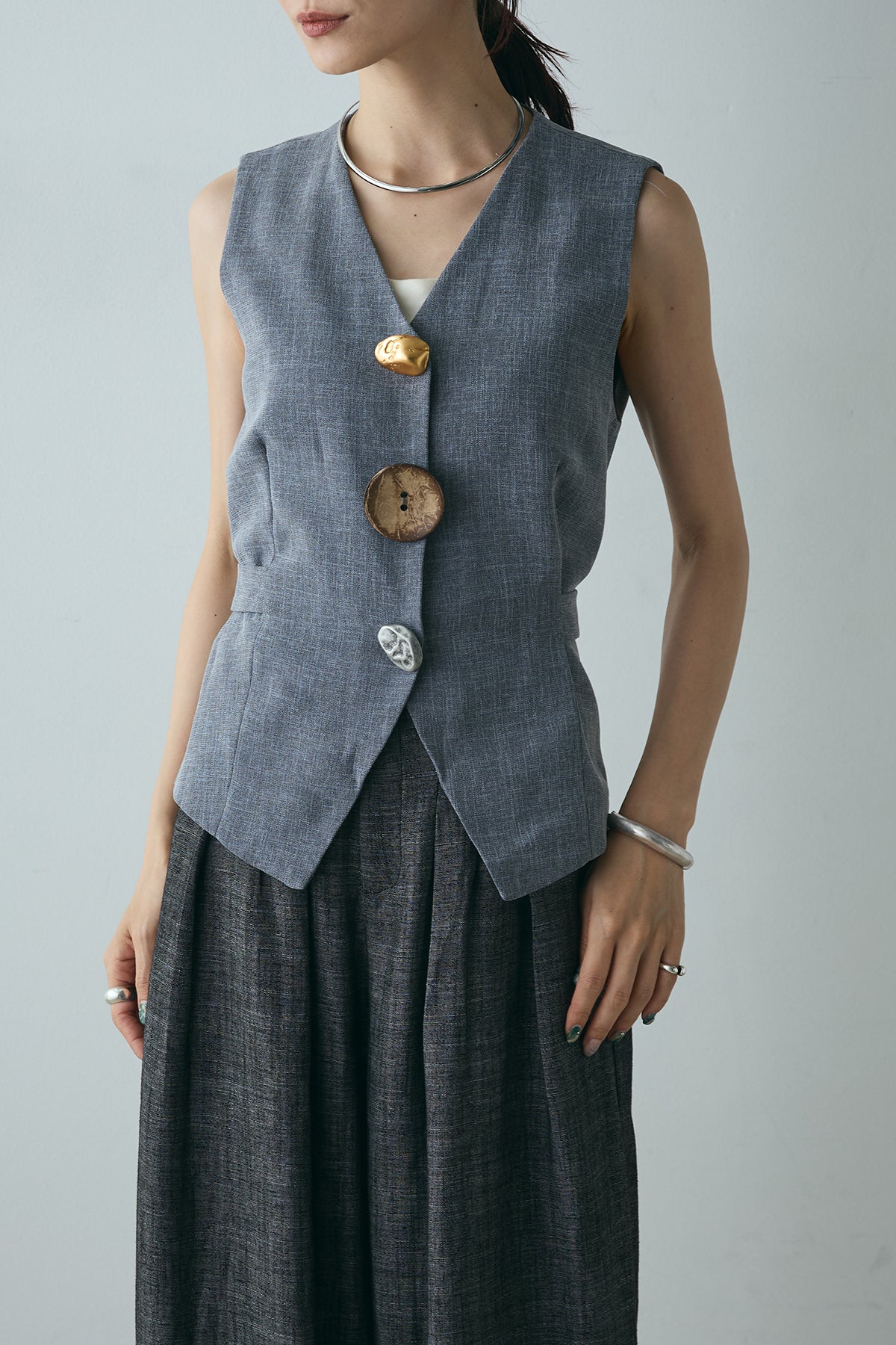 ユニークなデザインボタンがアクセントになった、シンプルでありながら存在感のあるベスト。ヴィンテージ感を感じさせる大きなボタンが、モダンでありながらも落ち着いた印象を与えます。背面のリボンディテールが女性らしさを引き立て、スタイリングに柔らかな印象をプラス。シンプルなTシャツやブラウスに合わせるだけで、コーディネートを一段と引き立てるアイテムです。