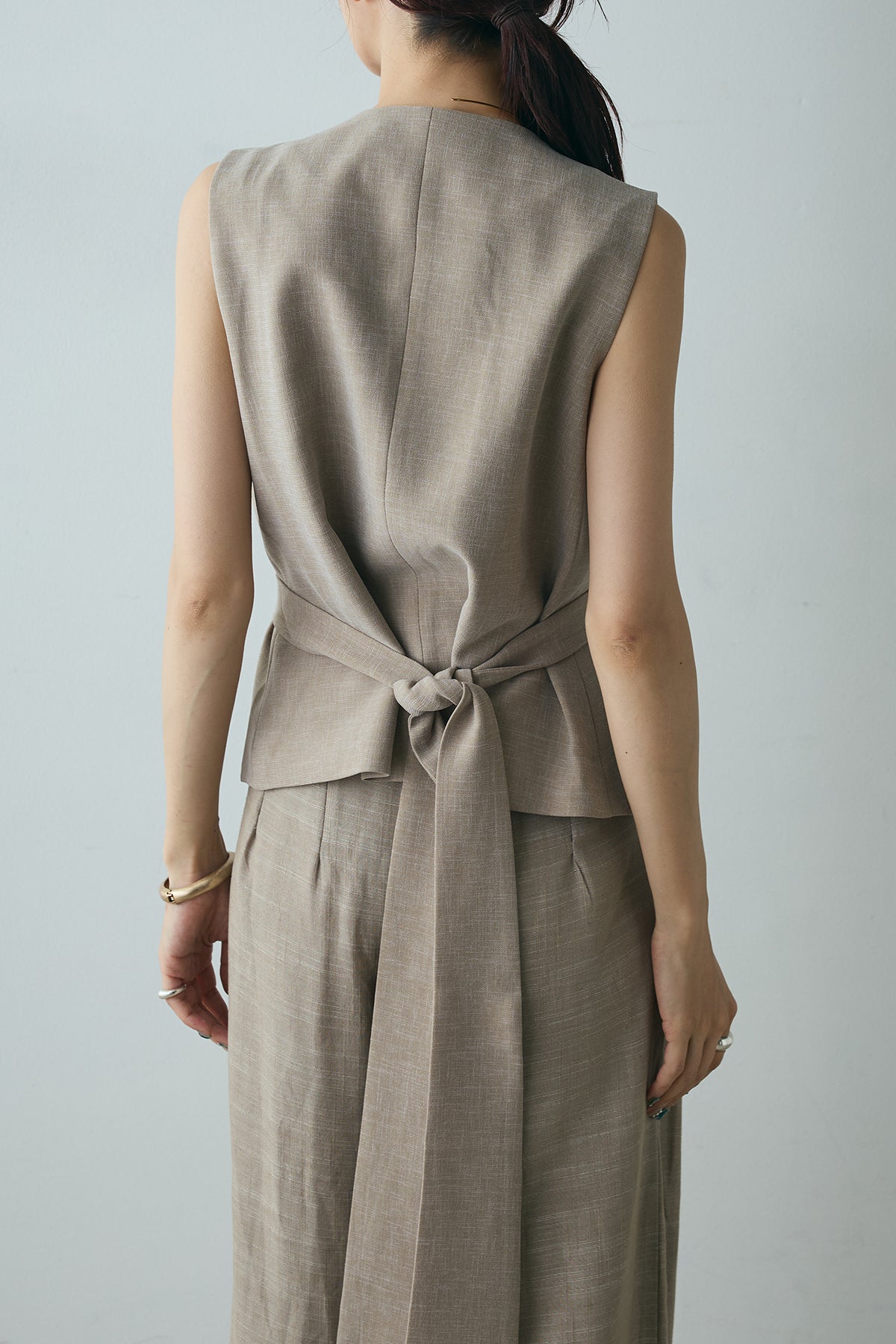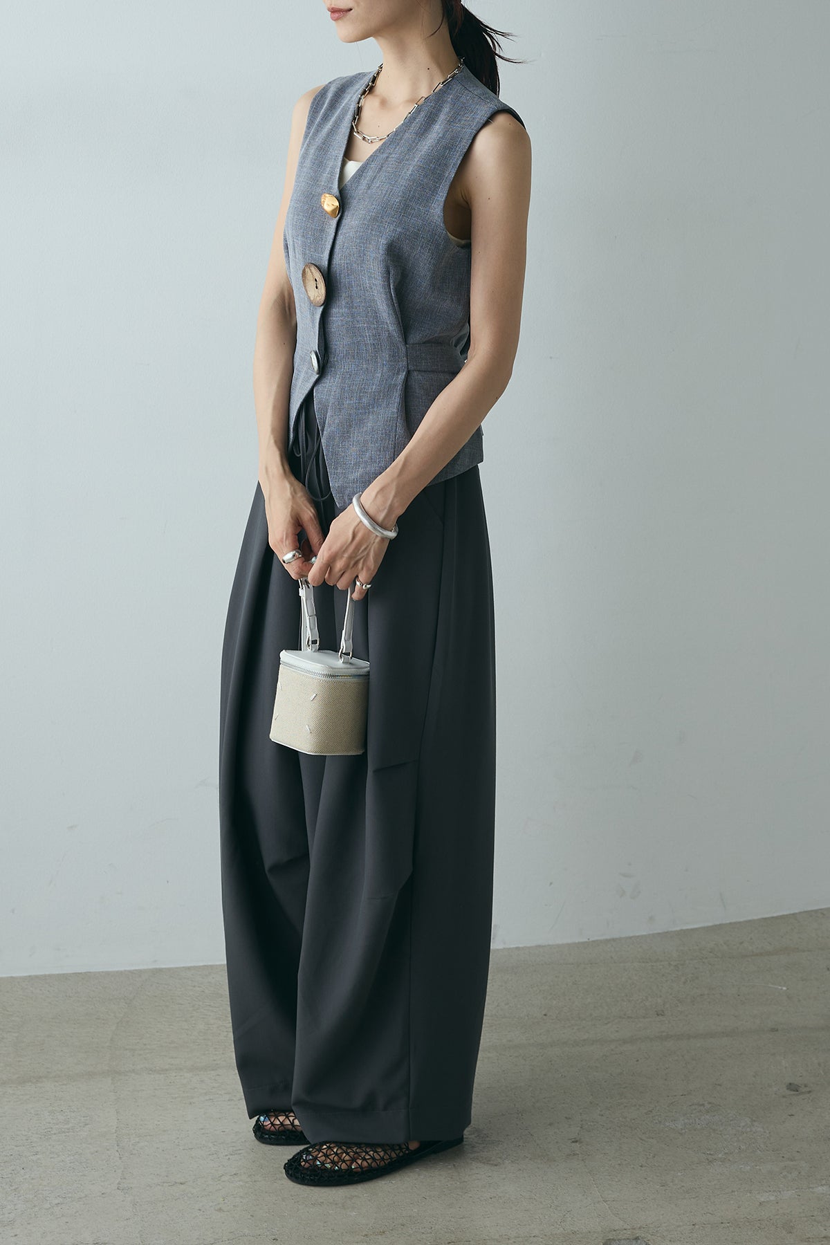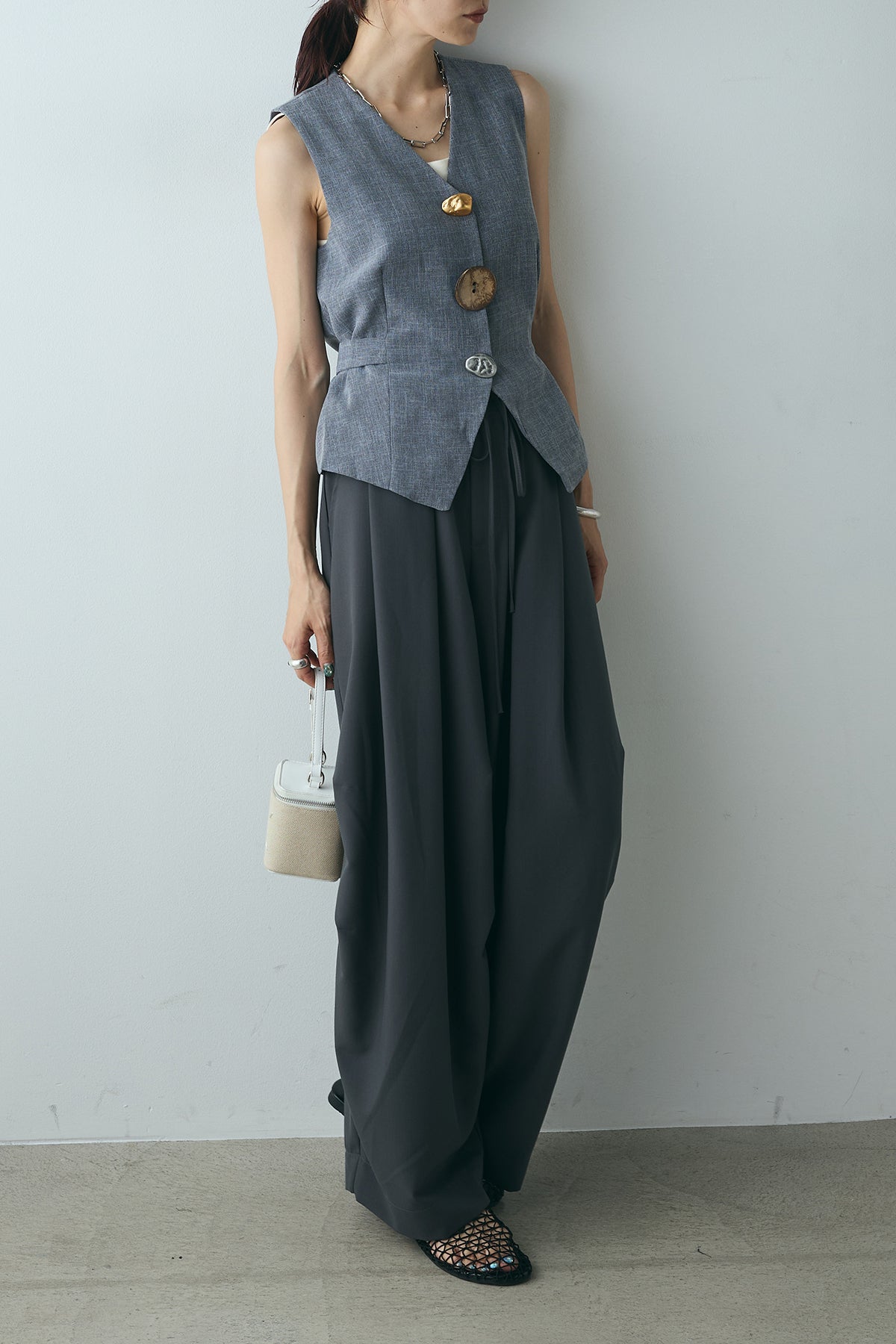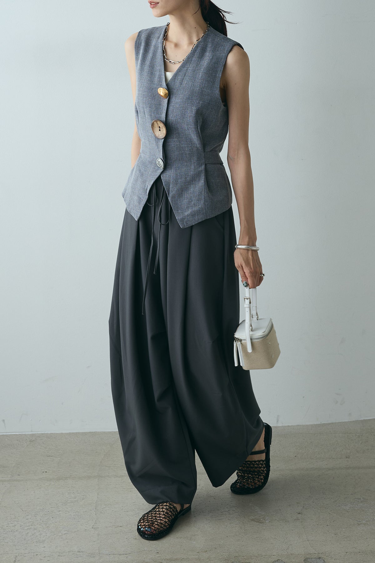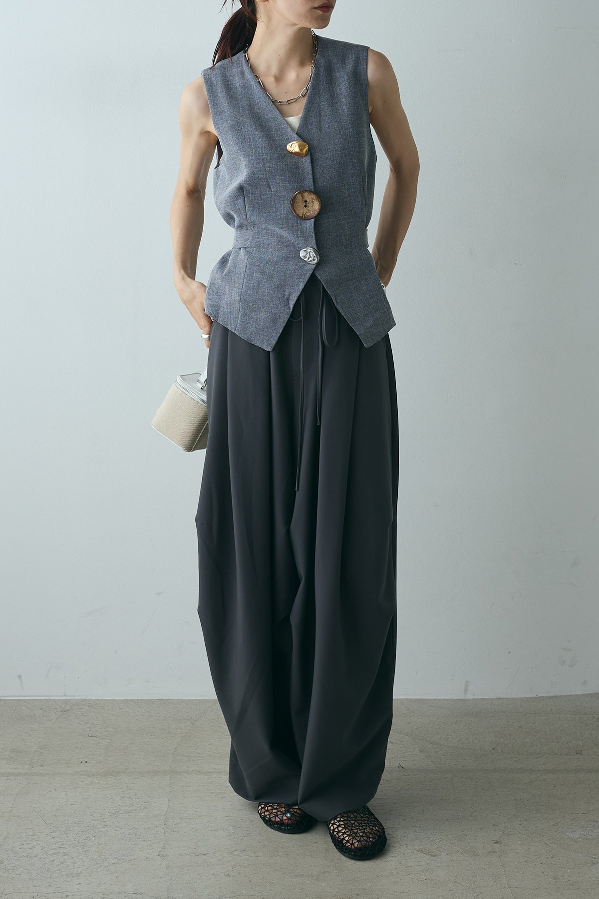 ユニークなデザインボタンがアクセントになった、シンプルでありながら存在感のあるベスト。ヴィンテージ感を感じさせる大きなボタンが、モダンでありながらも落ち着いた印象を与えます。背面のリボンディテールが女性らしさを引き立て、スタイリングに柔らかな印象をプラス。シンプルなTシャツやブラウスに合わせるだけで、コーディネートを一段と引き立てるアイテムです。