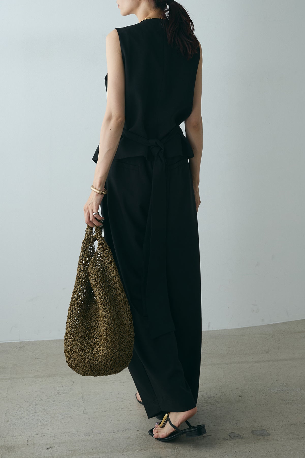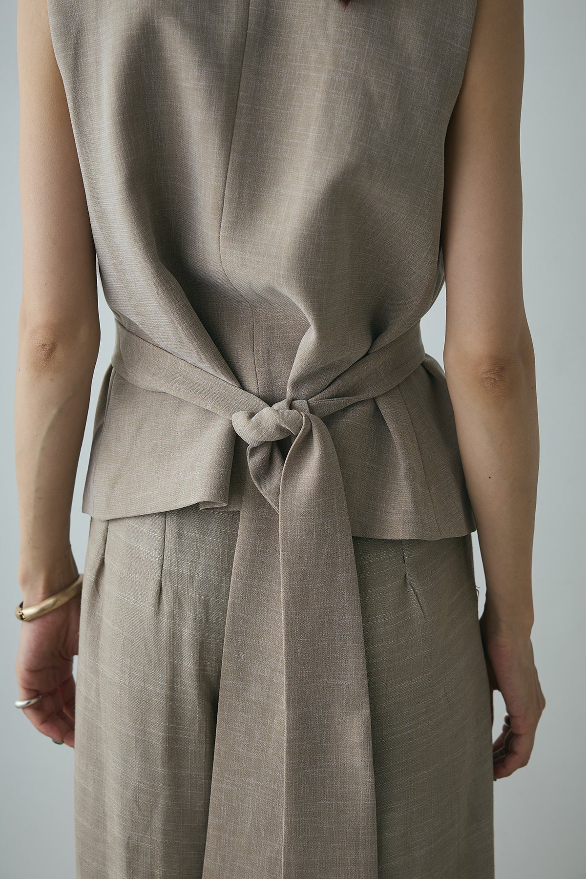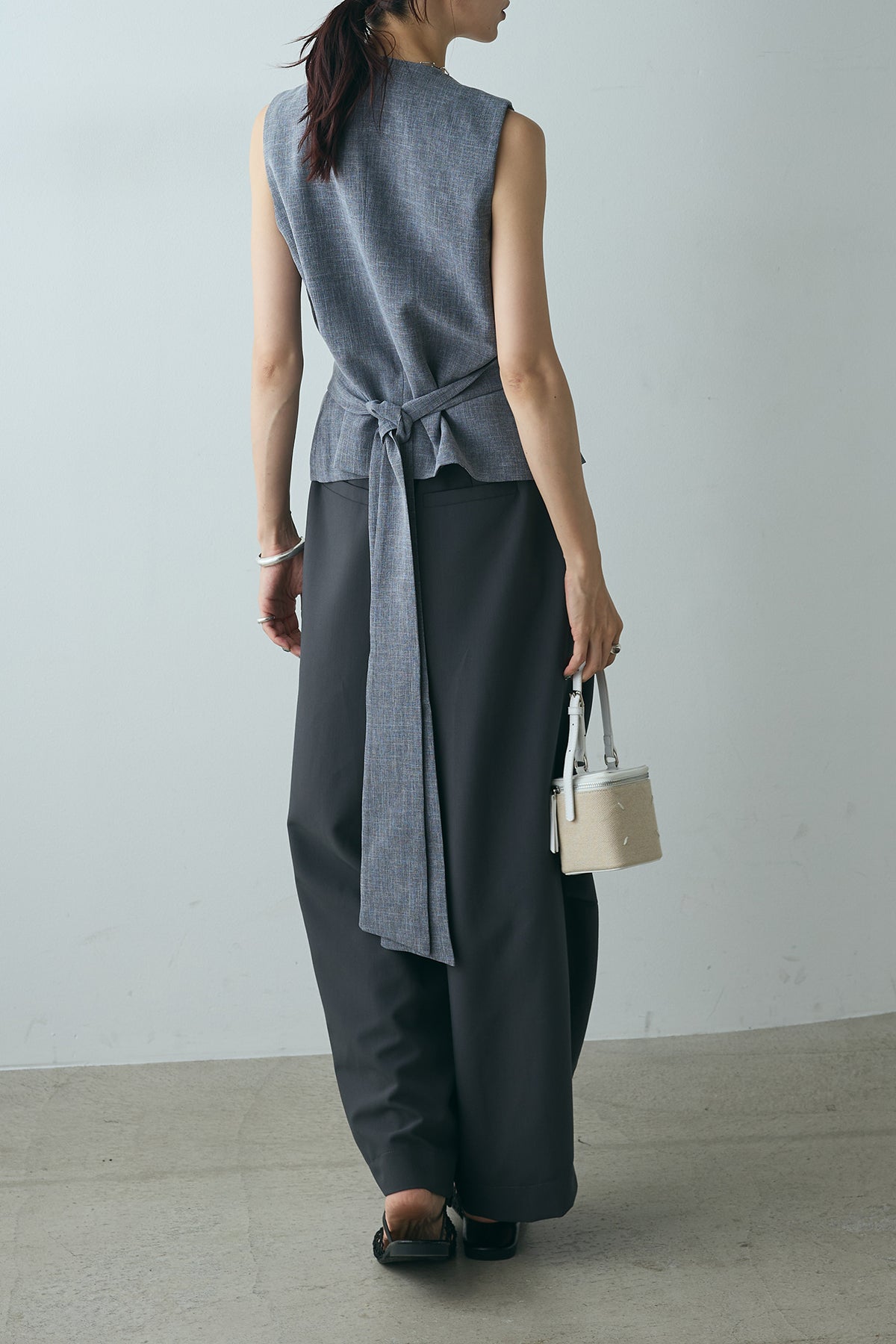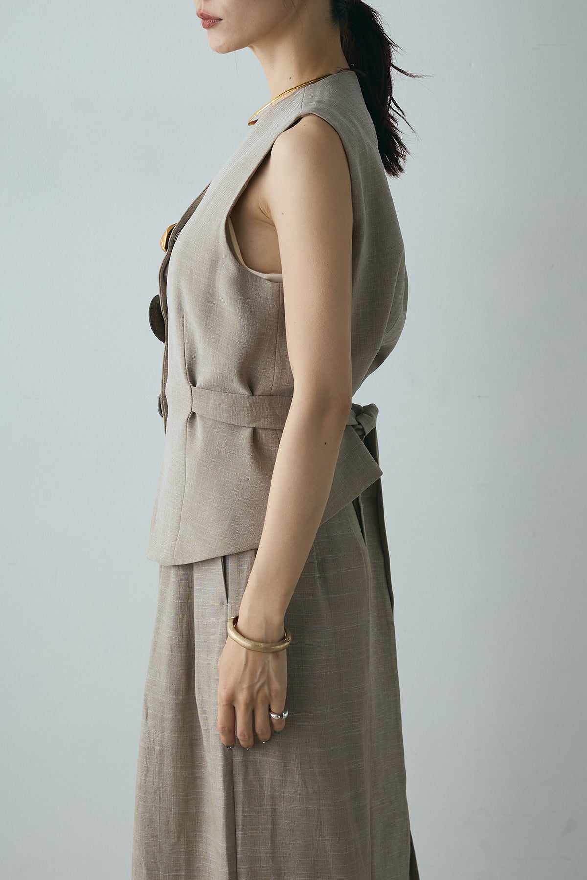 ユニークなデザインボタンがアクセントになった、シンプルでありながら存在感のあるベスト。ヴィンテージ感を感じさせる大きなボタンが、モダンでありながらも落ち着いた印象を与えます。背面のリボンディテールが女性らしさを引き立て、スタイリングに柔らかな印象をプラス。シンプルなTシャツやブラウスに合わせるだけで、コーディネートを一段と引き立てるアイテムです。