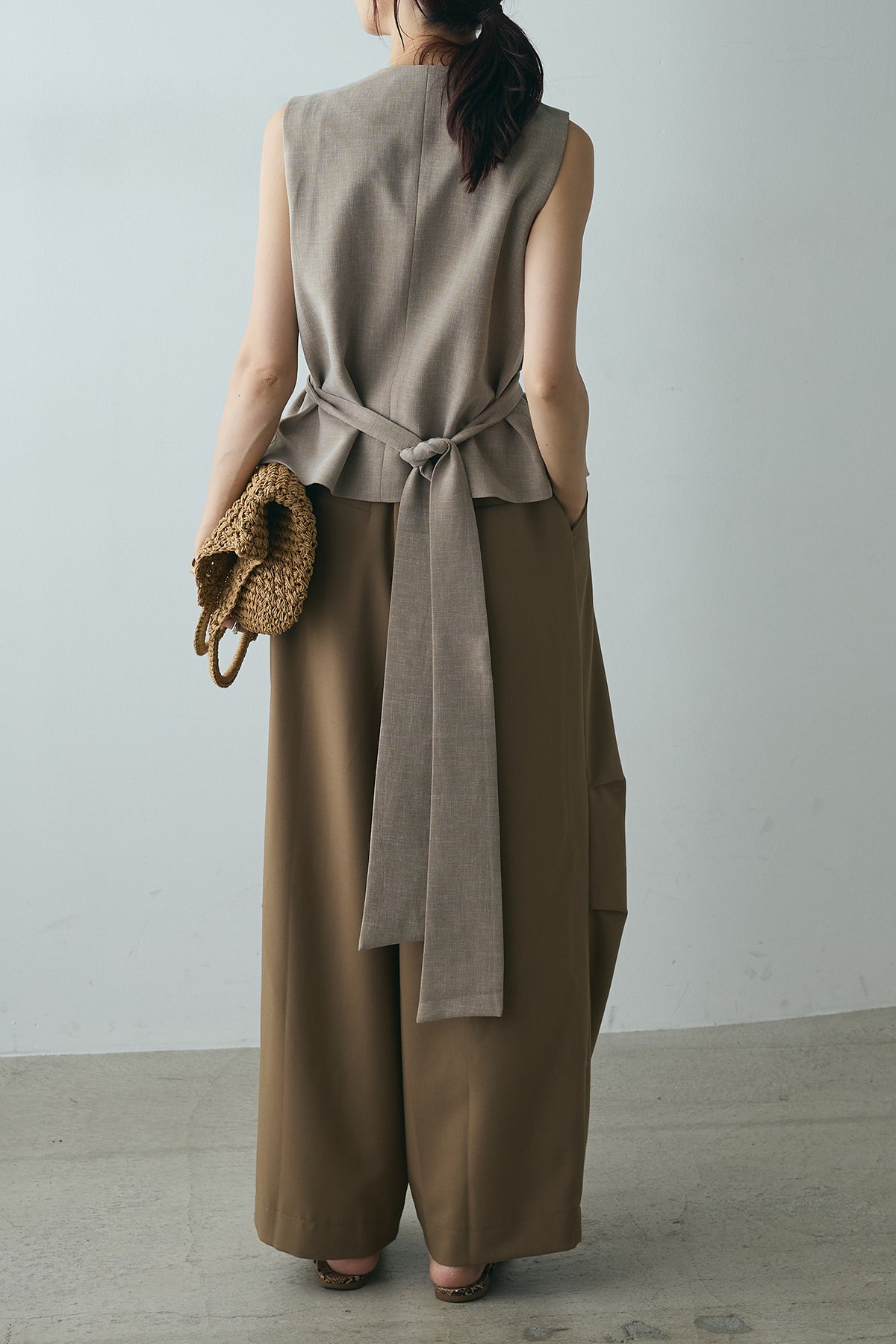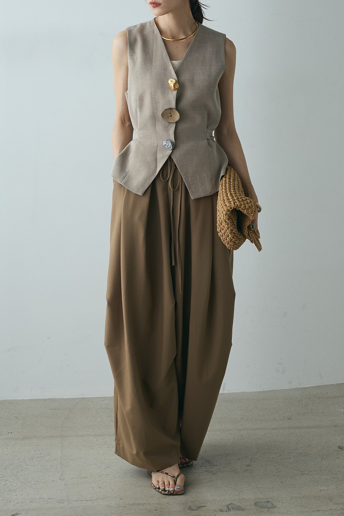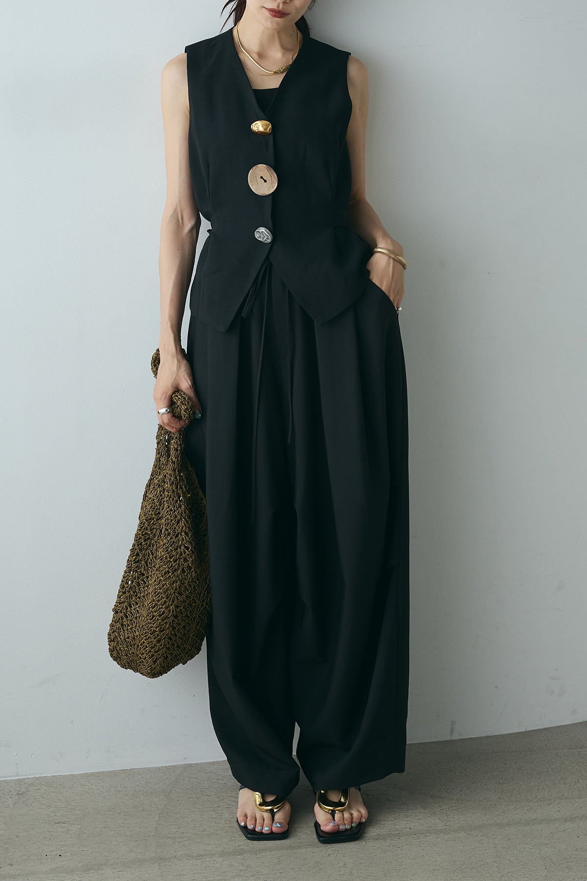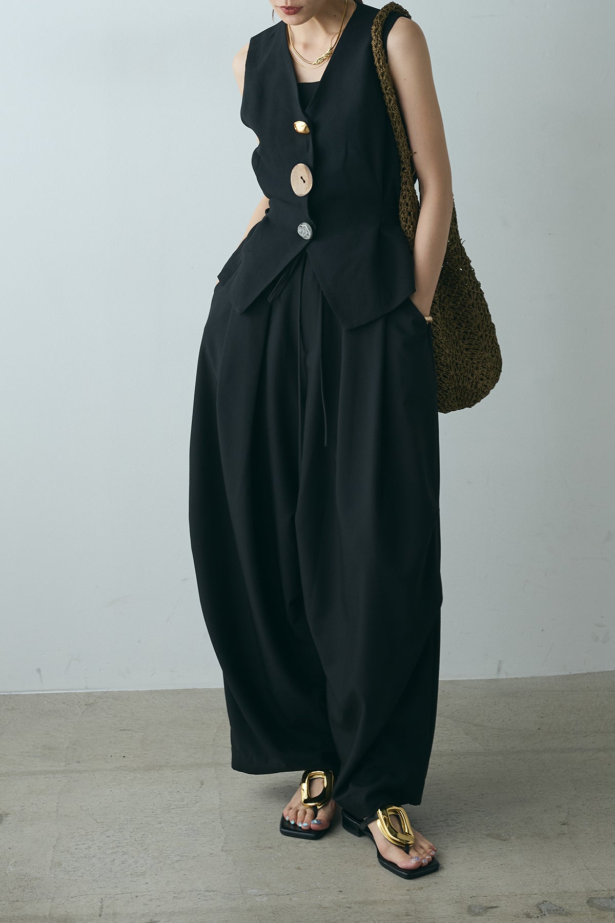 [SET]デザインボタンリボンベスト+ランダムタック入りワイドパンツ(2set)