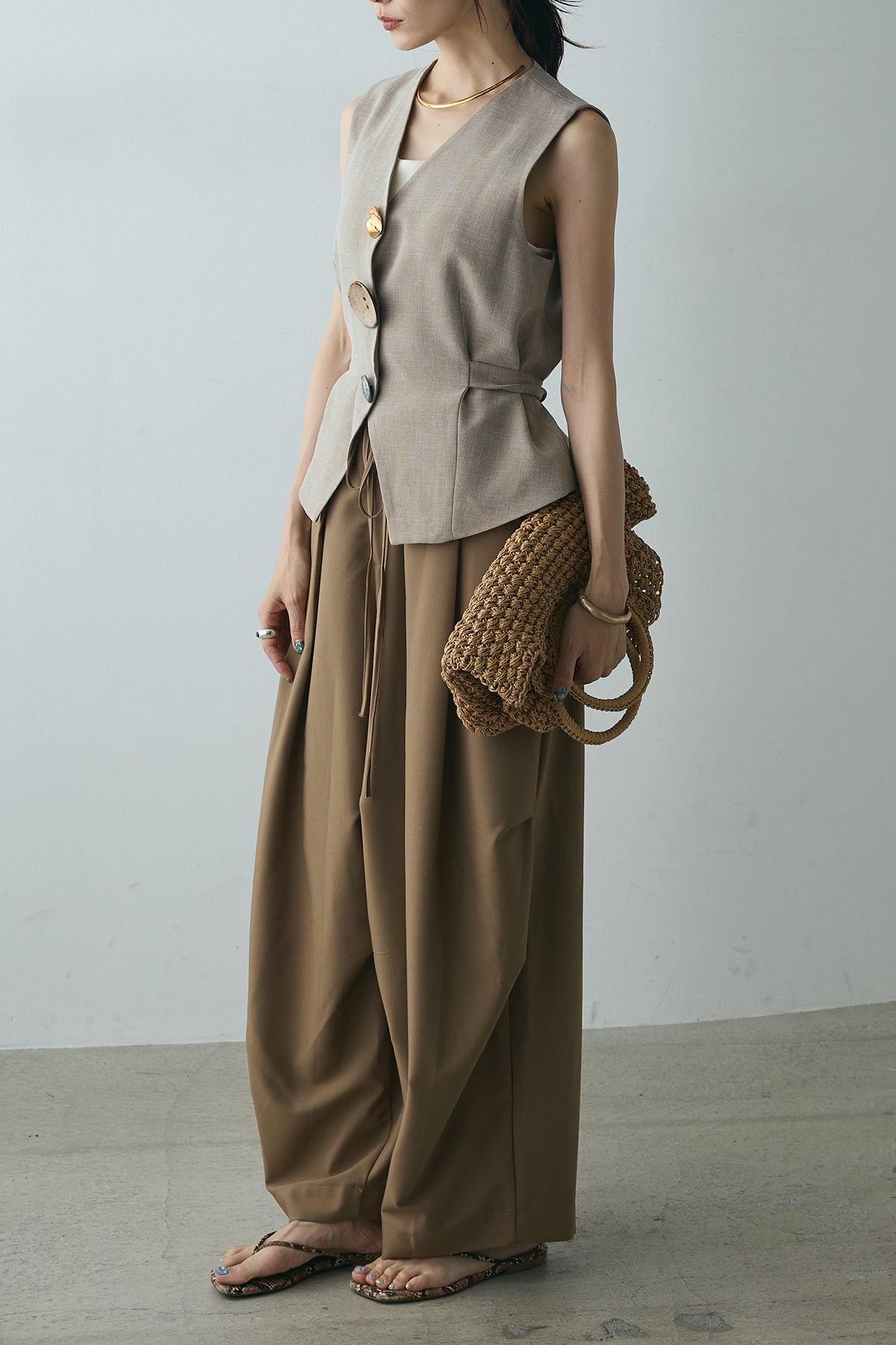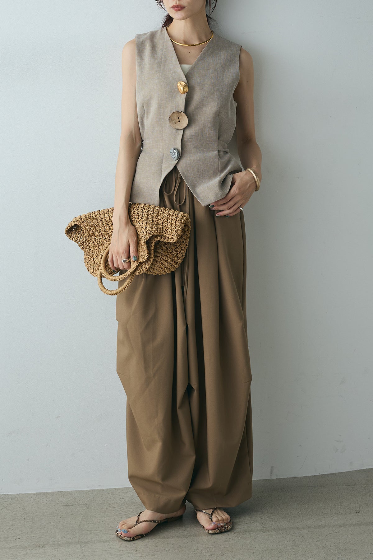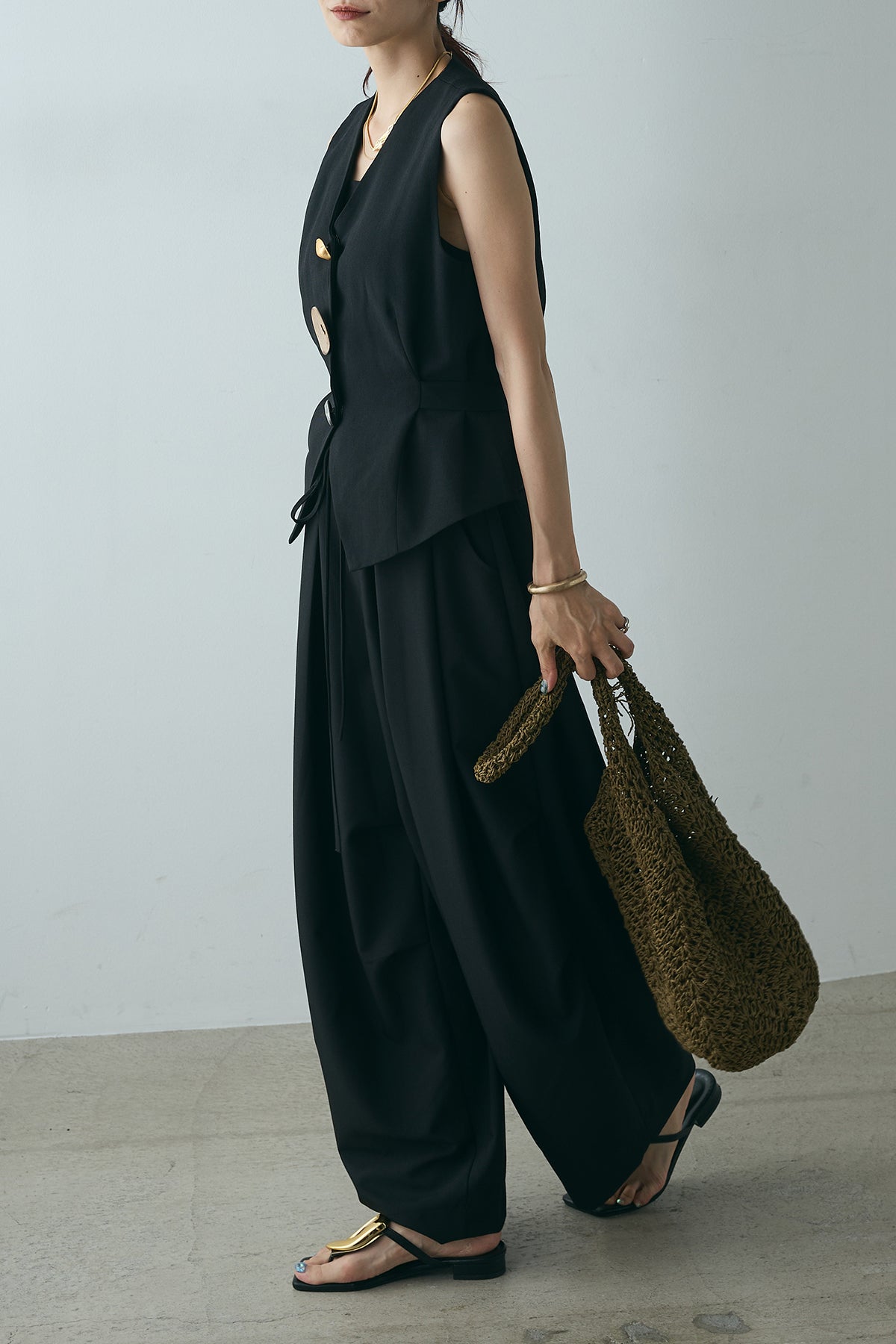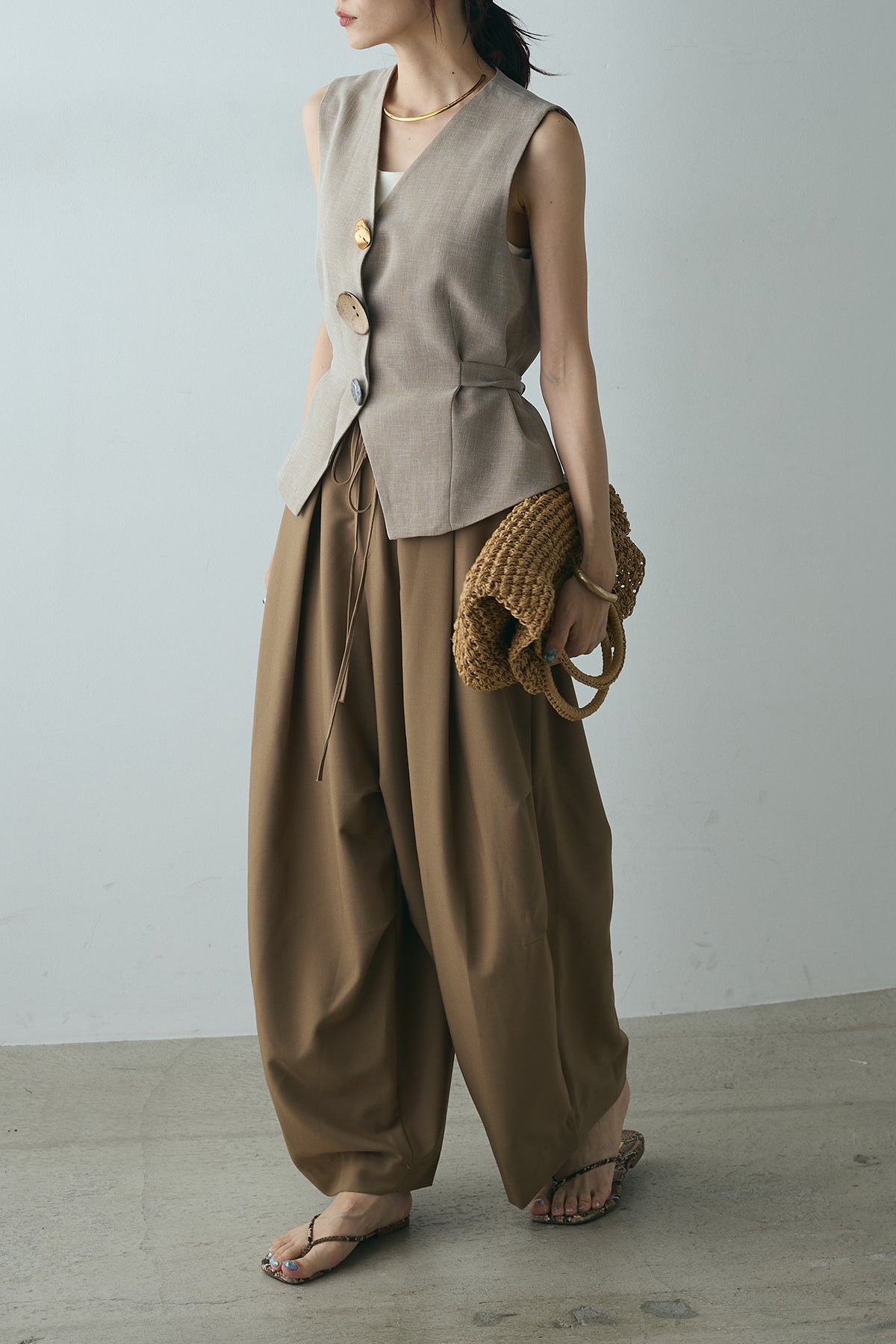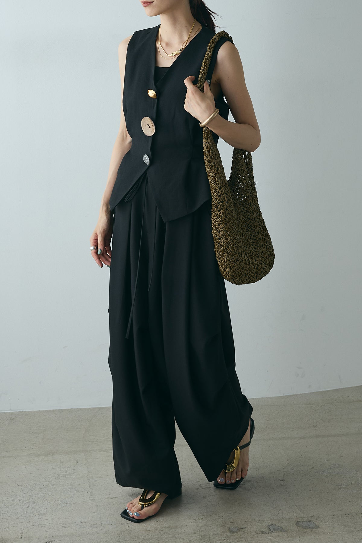 [SET]デザインボタンリボンベスト+ランダムタック入りワイドパンツ(2set)