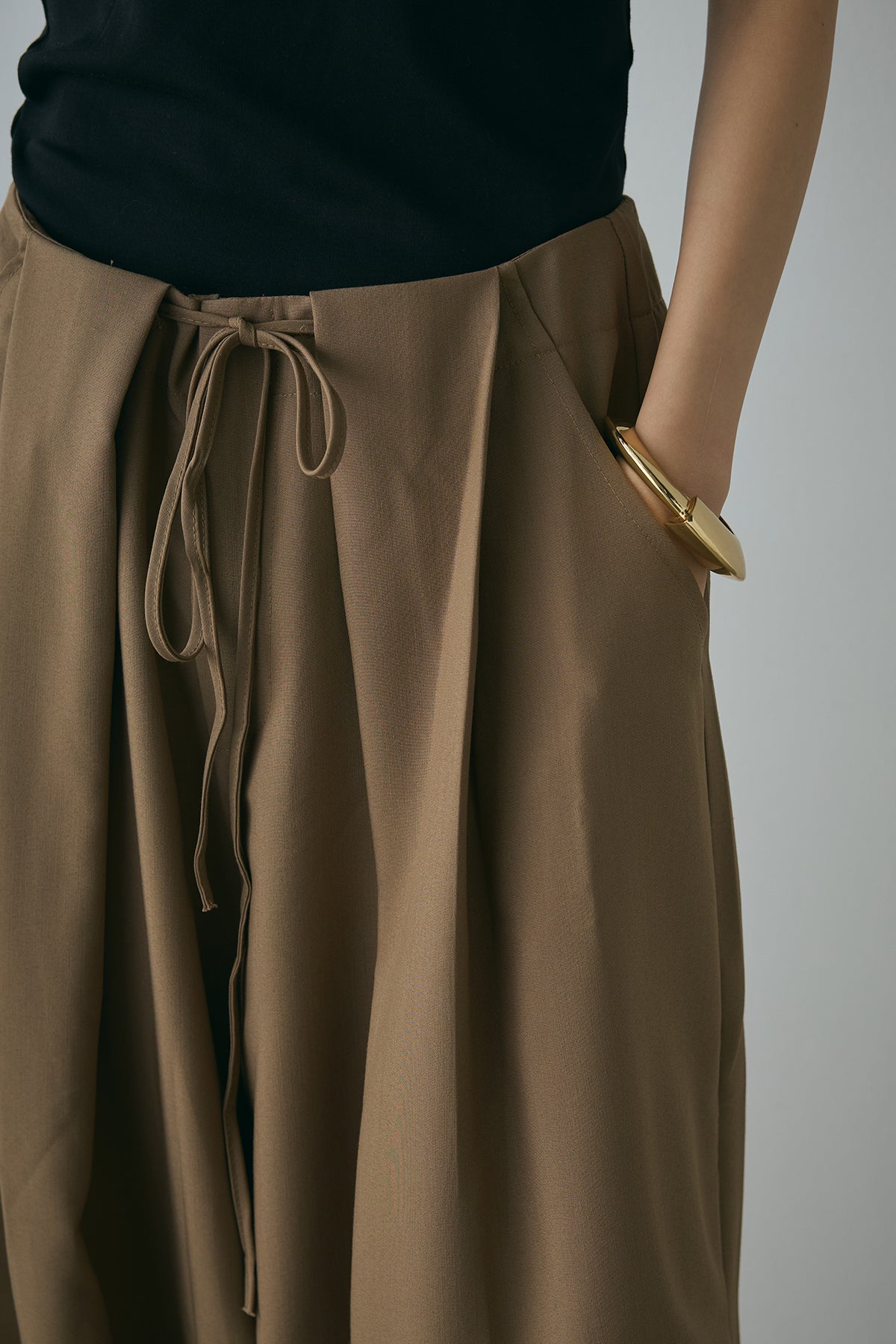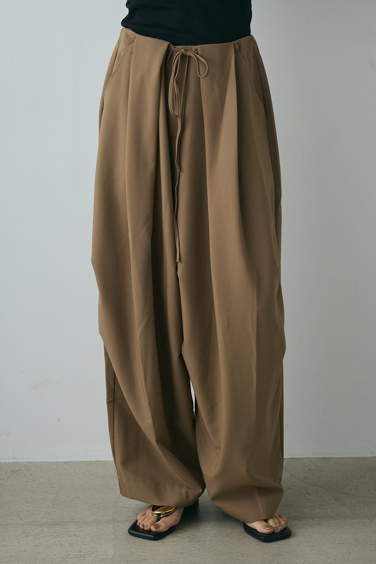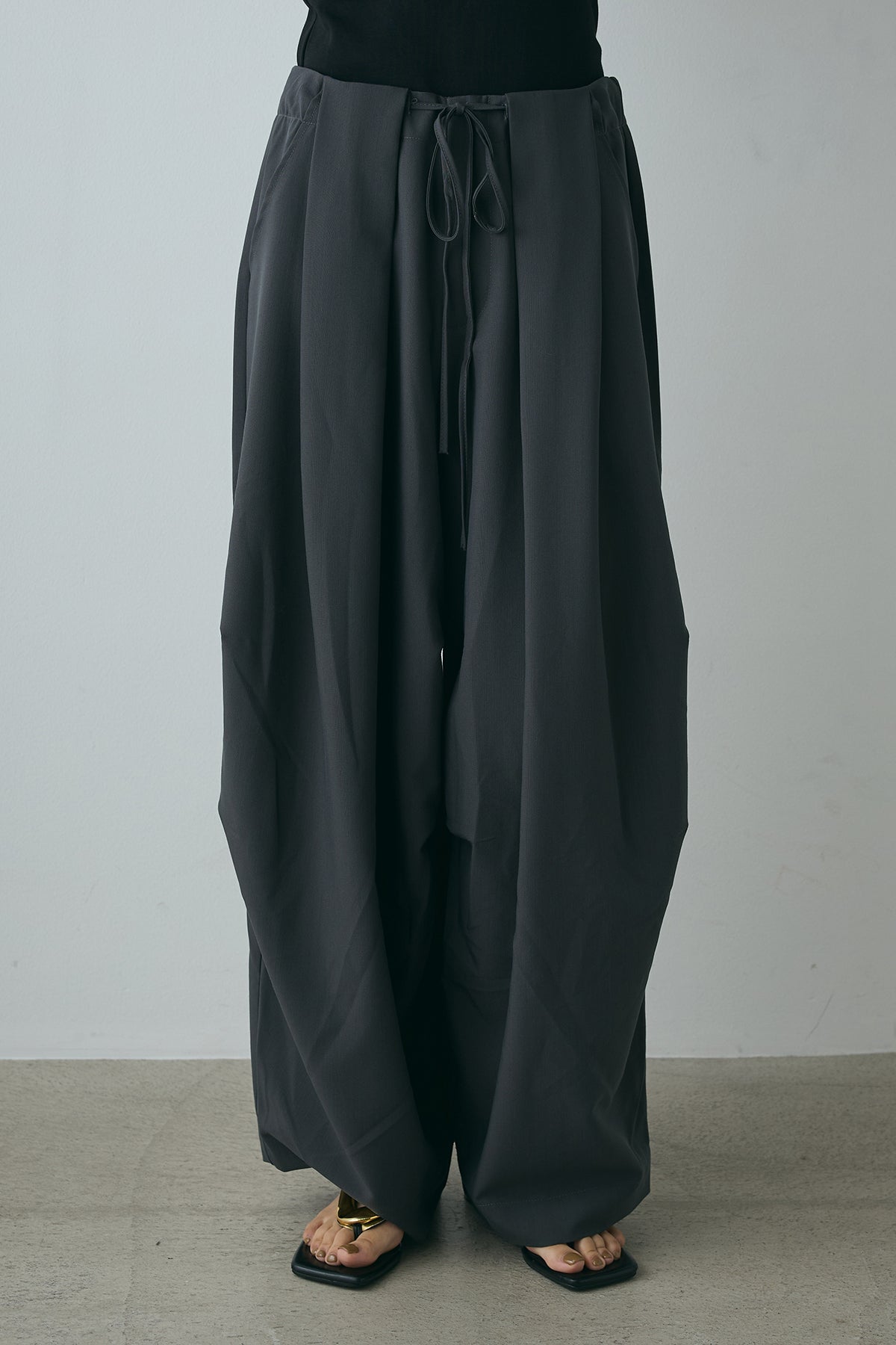 動きのあるランダムタックが目を引くワイドパンツ。立体的なフォルムが魅力で、穿くだけでモードなムードをプラス。ウエストはドローストリング仕様でフィット感も調整しやすく、リラクシーな着心地に。シンプルなトップスを合わせるだけで、スタイリングが決まる主役級の一本です。
